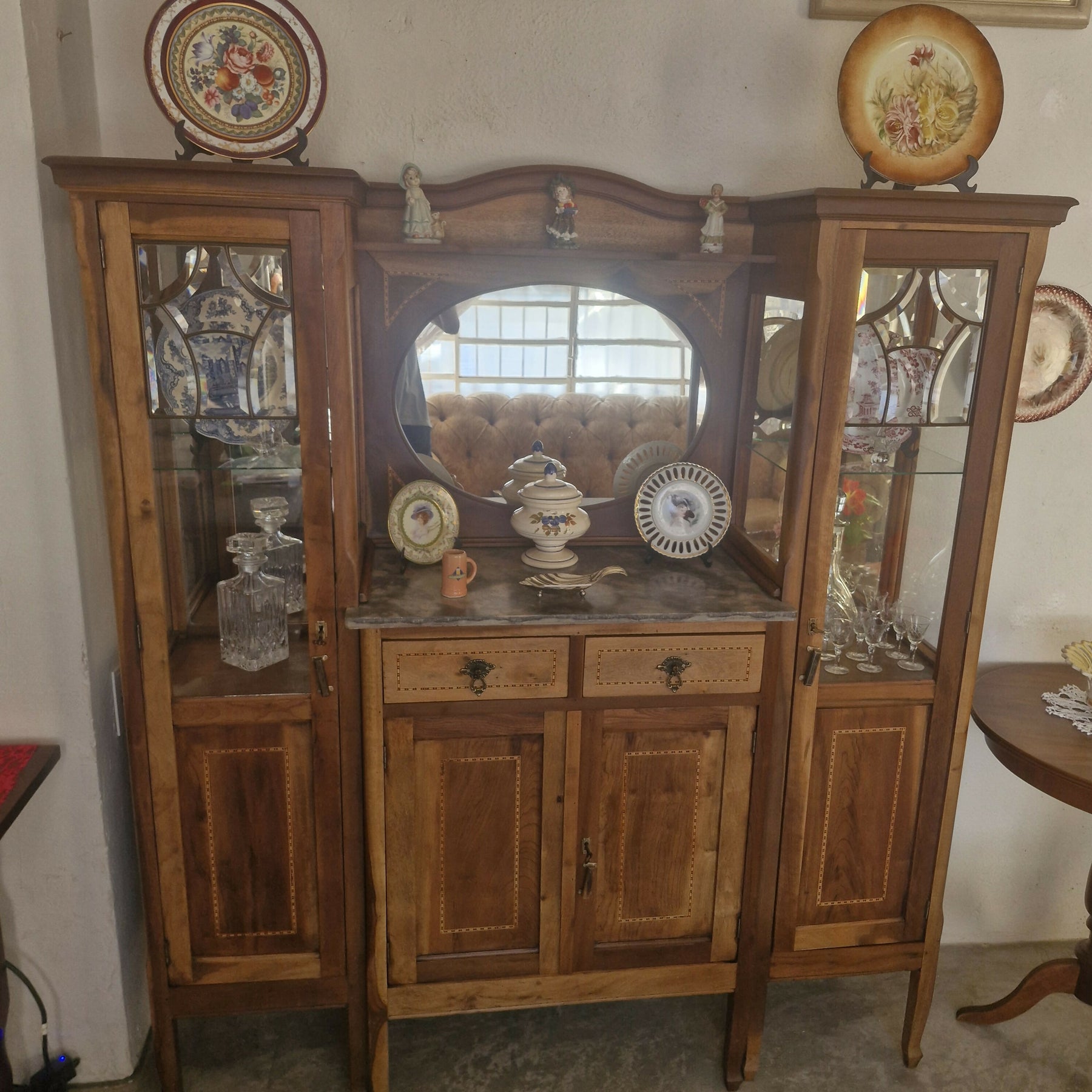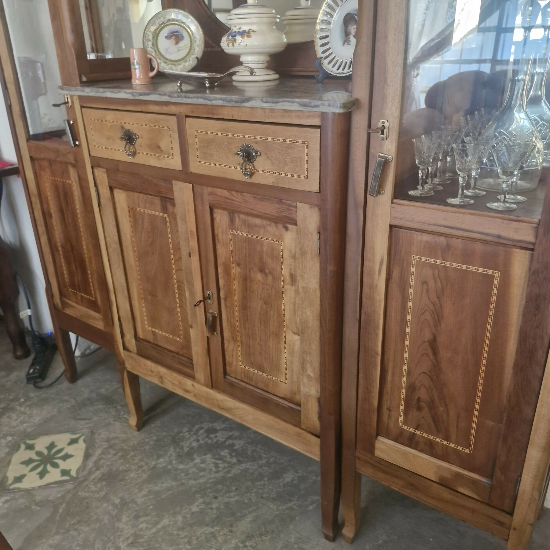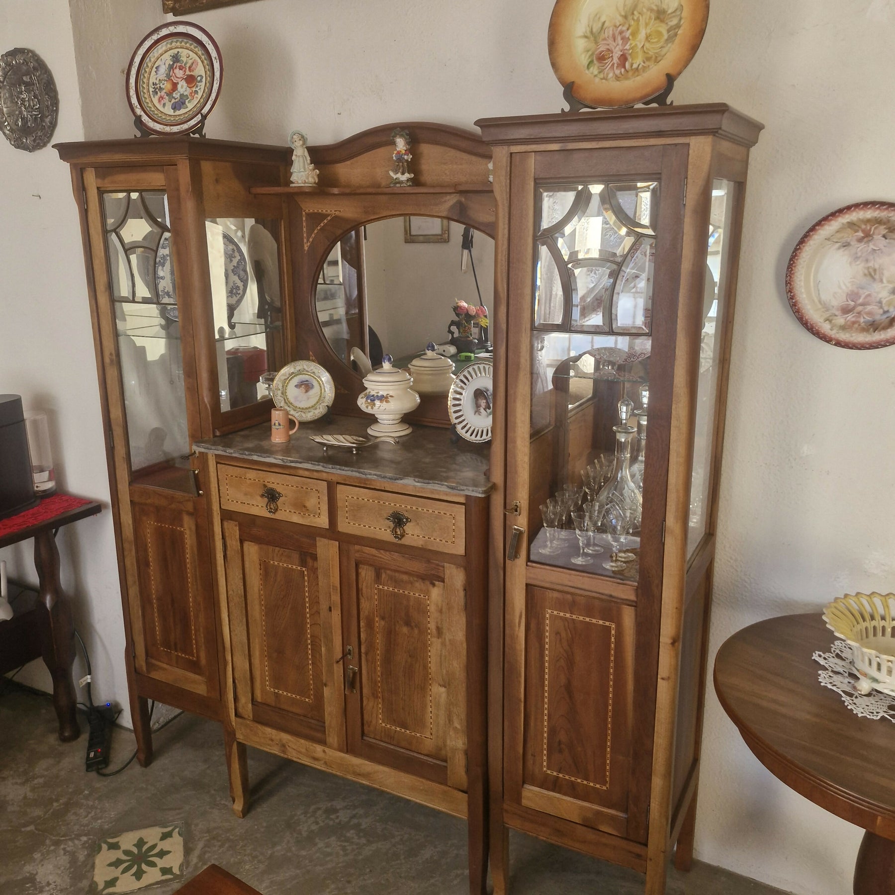 Móvel antigo provavelmente do início do século XX, de design elegante e clássico, inspirado no estilo Art Nouveau que mistura vidros bisotados e ferro fundido com a madeira trabalhada na marchetaria. Possuem também 2 gavetas e compartimento fechado, tampo em mármore. Espelho de forma oval, que adiciona elegância e amplia o ambiente.