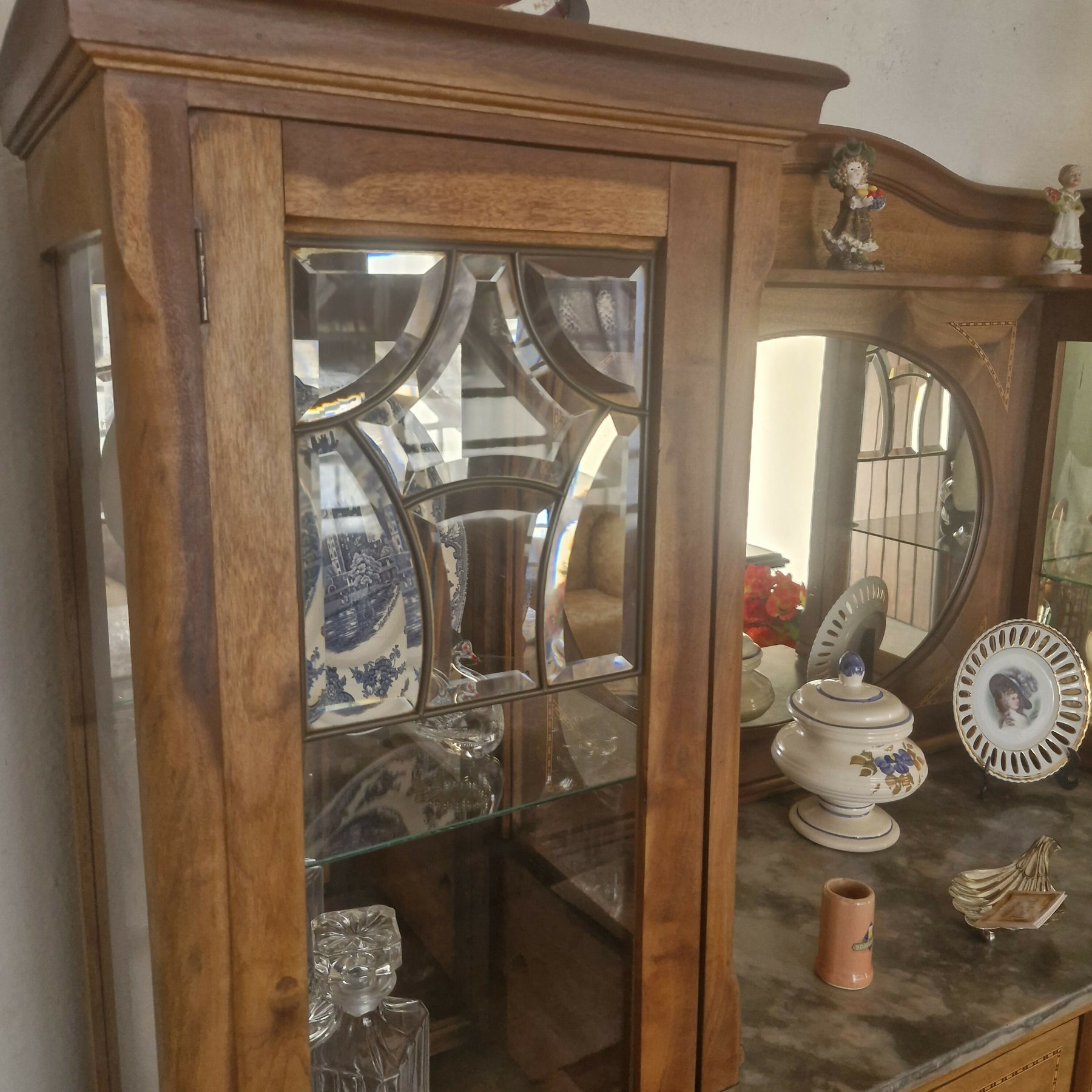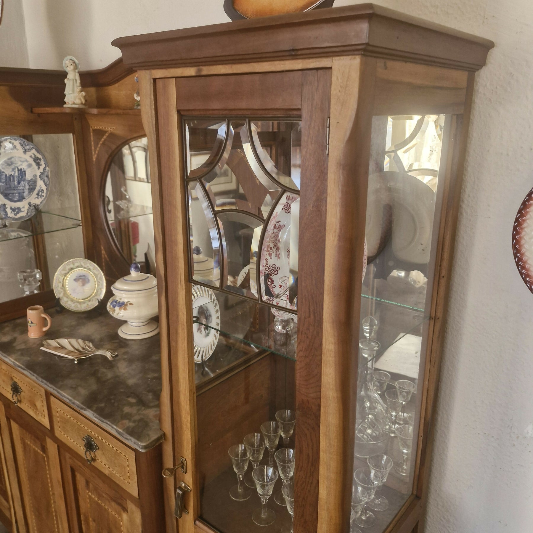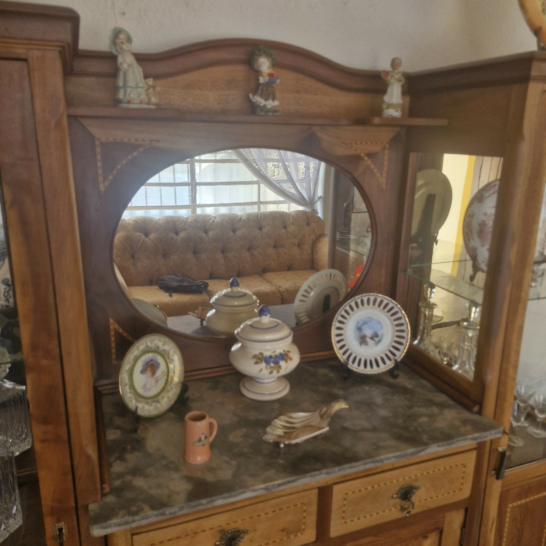 Móvel antigo provavelmente do início do século XX, de design elegante e clássico, inspirado no estilo Art Nouveau que mistura vidros bisotados e ferro fundido com a madeira trabalhada na marchetaria. Possuem também 2 gavetas e compartimento fechado, tampo em mármore. Espelho de forma oval, que adiciona elegância e amplia o ambiente.