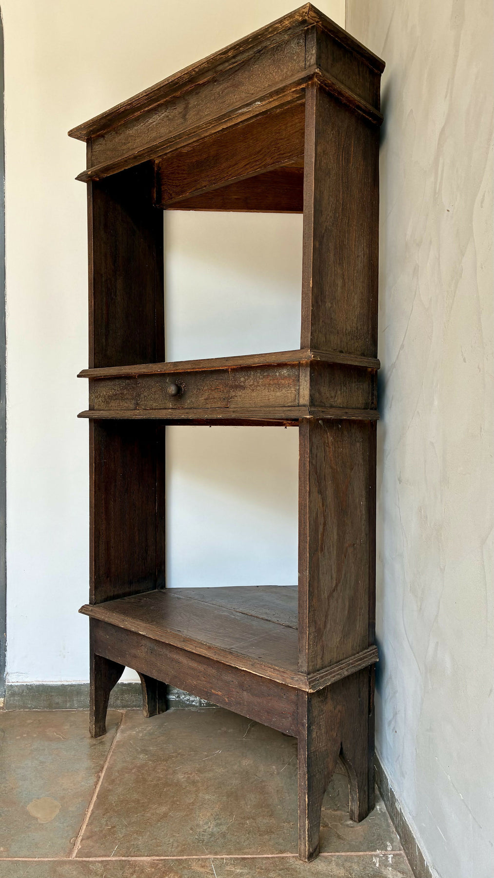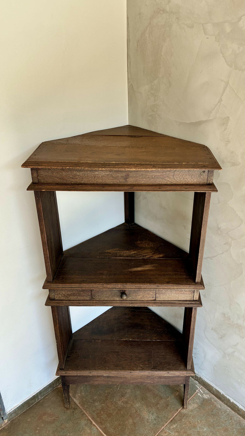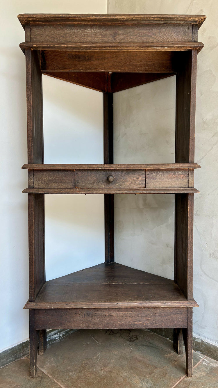Peça de design rústico,  ideal para dar charme e autenticidade à decoração. Conta com prateleira superior, prateleira central com gaveta funcional e base em formato triangular, perfeita para cantos de sala, corredor ou varanda.