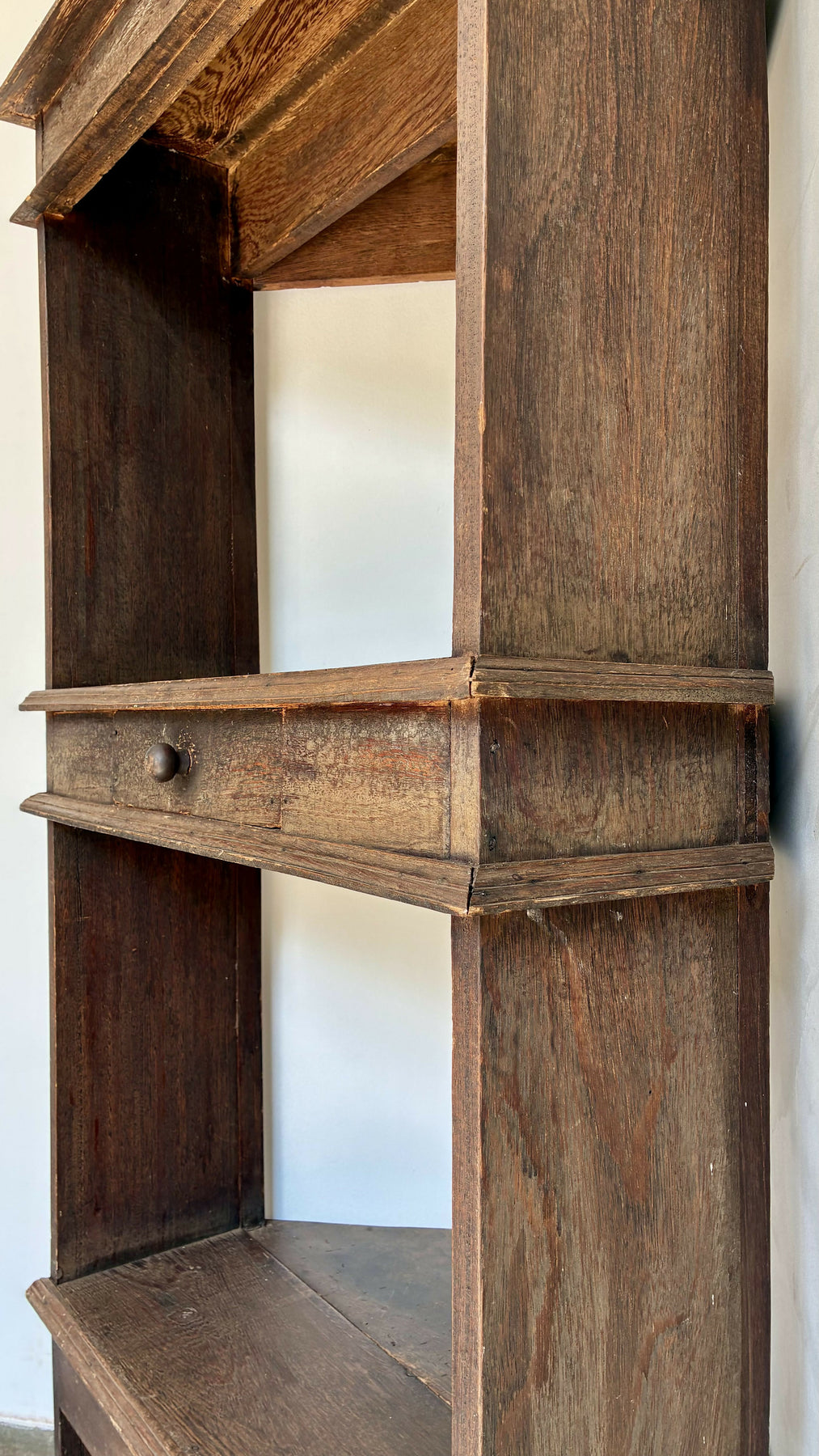 A madeira apresenta marcas naturais do tempo, que valorizam ainda mais seu estilo vintage.