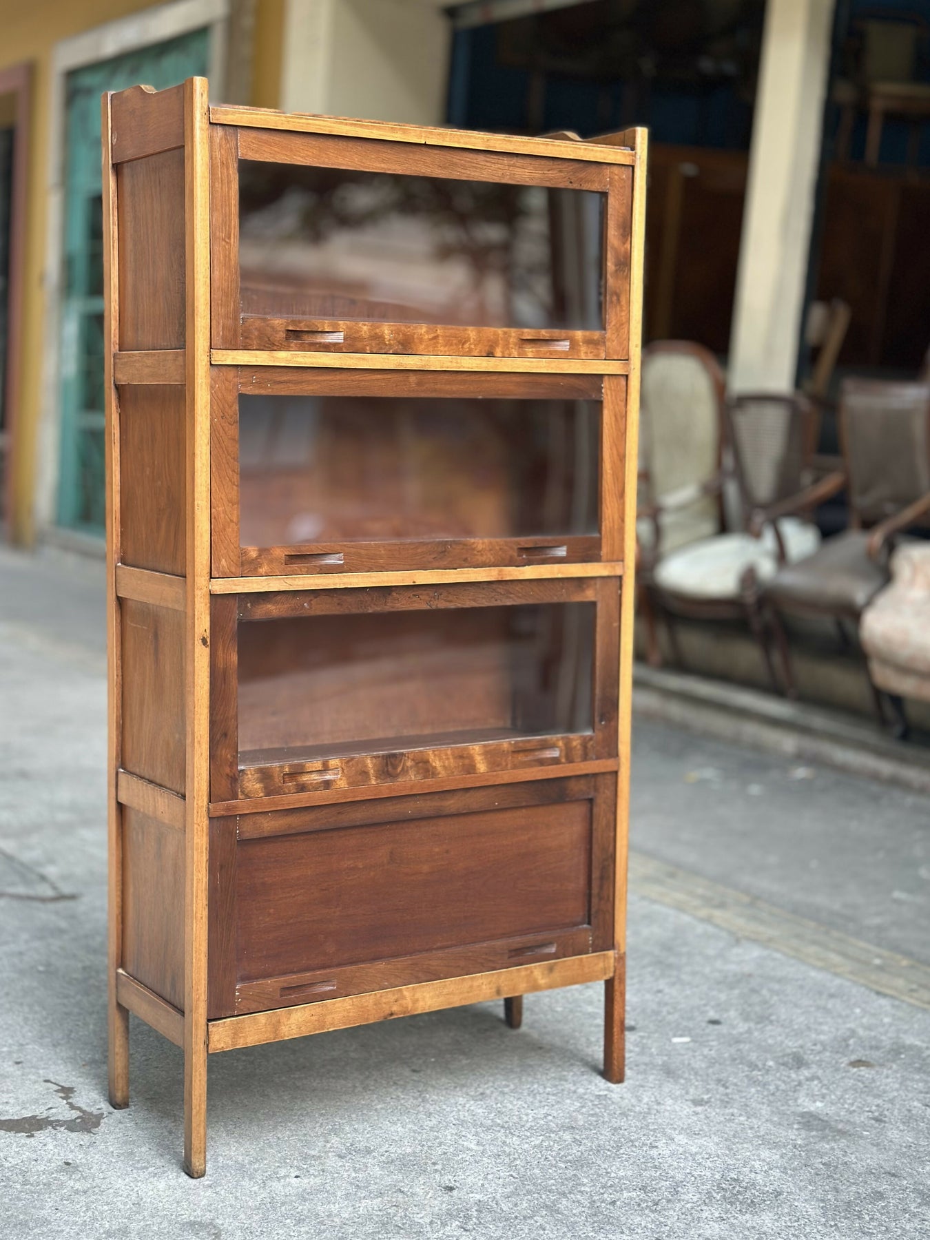 Estante/Livreiro em Imbuia com 4 portas basculantes, sendo 3 em vidro e 1 em madeira. Uma peça única, prática e com design que minimalista. Peça com altíssima procura!