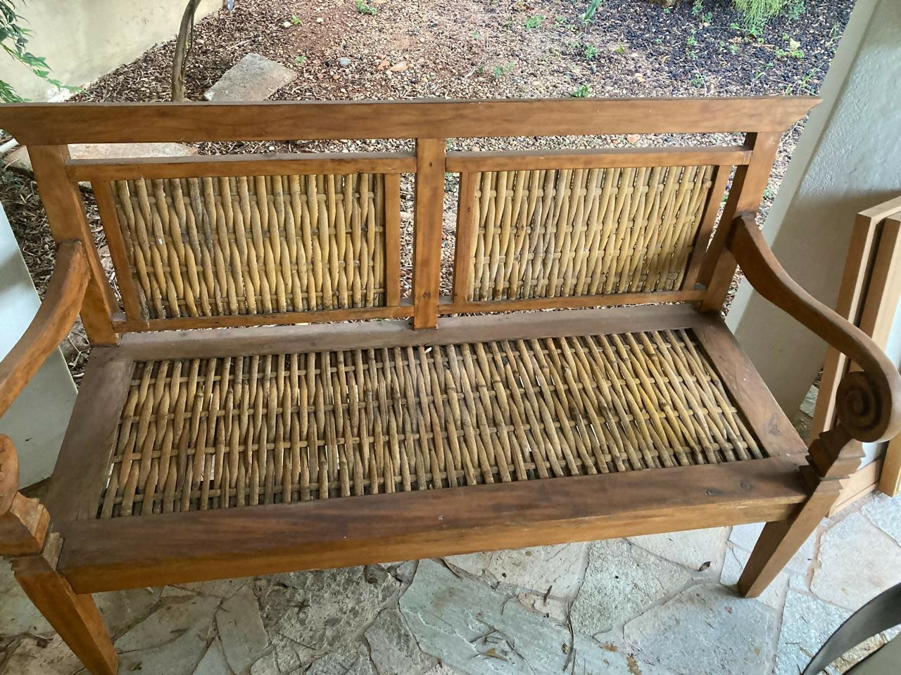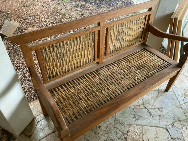 banco de madeira maciça e trançado de palha