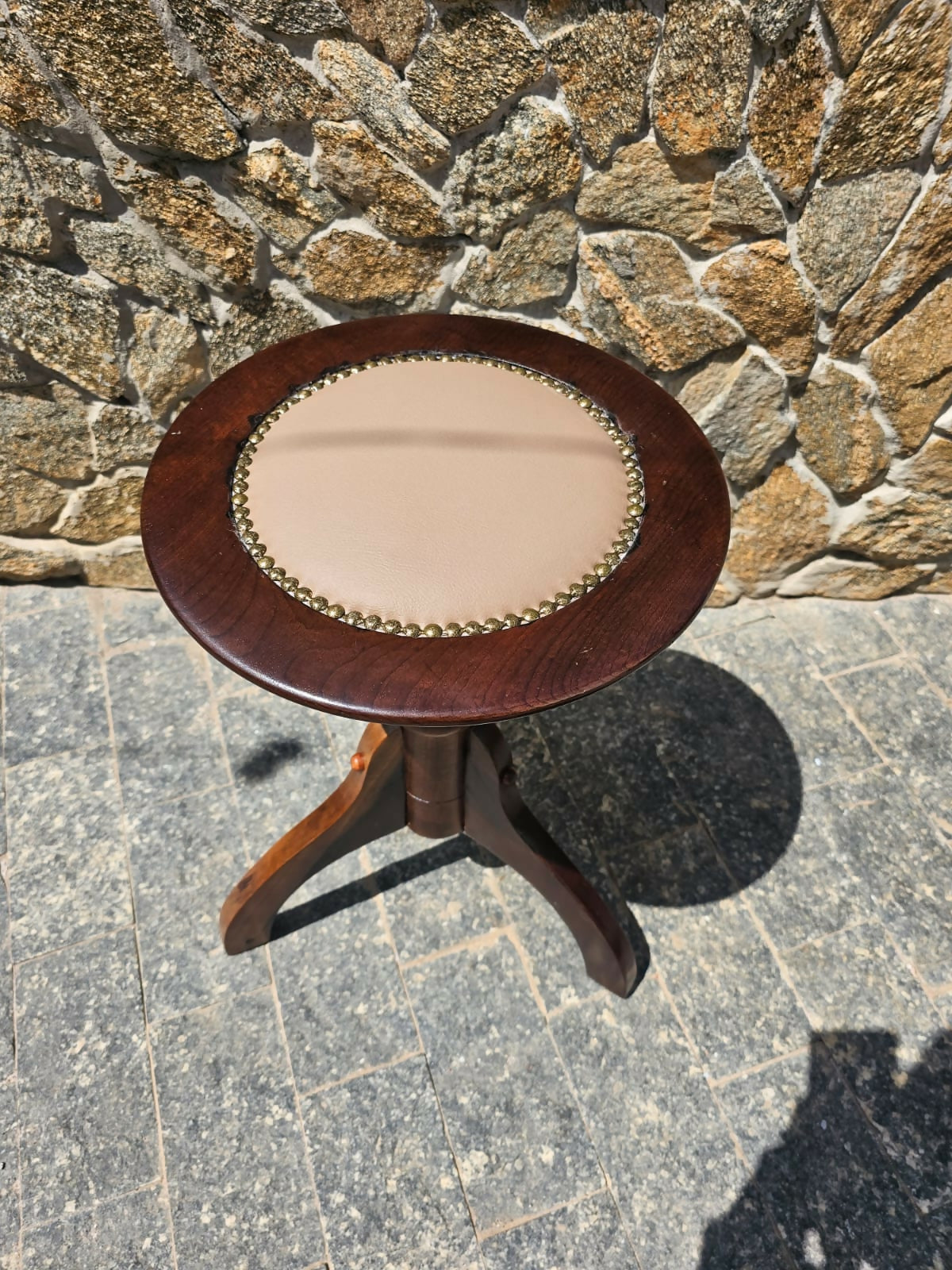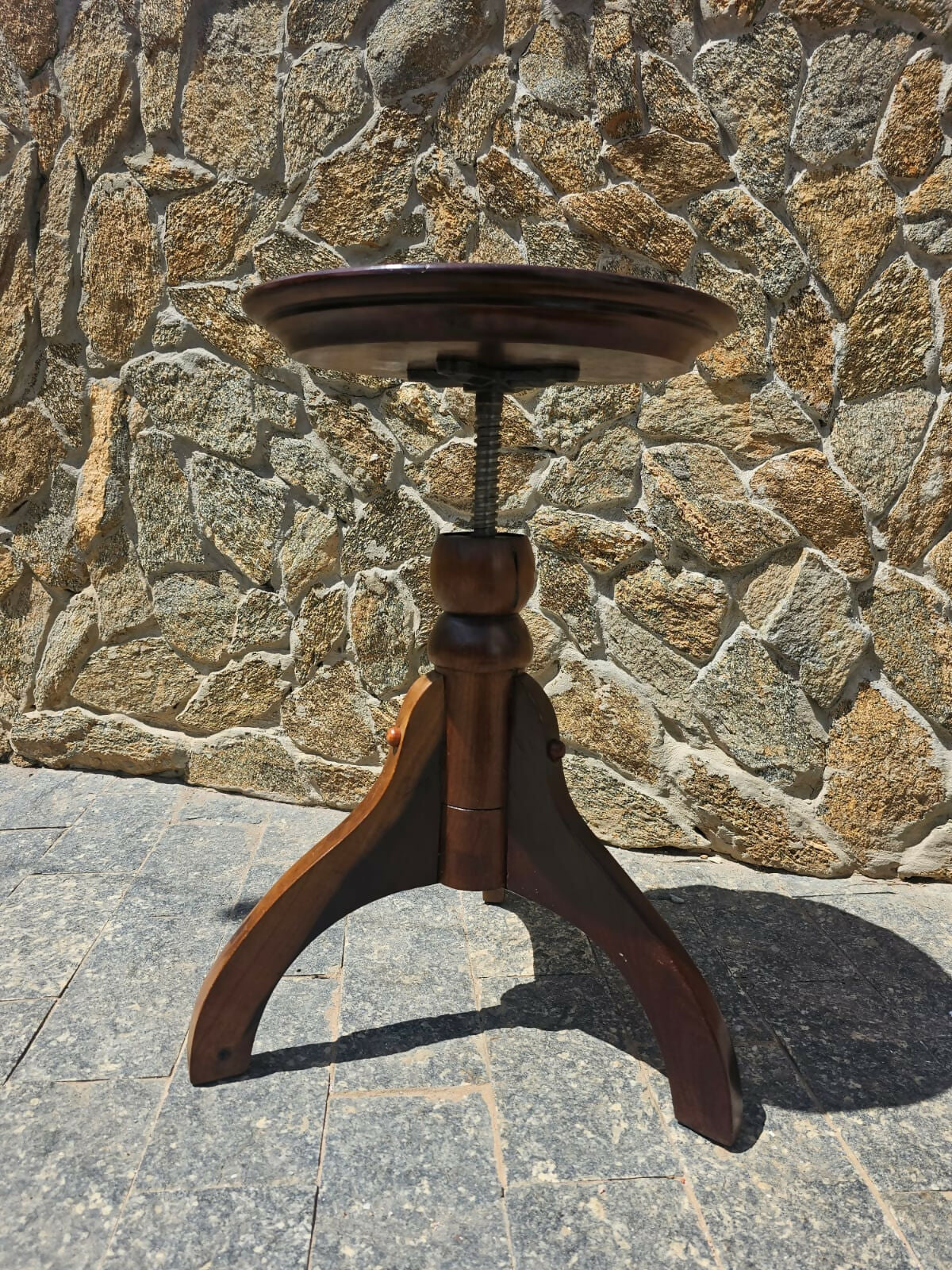 Da década de 30/40, altura regulável, assento em madeira e courino.
