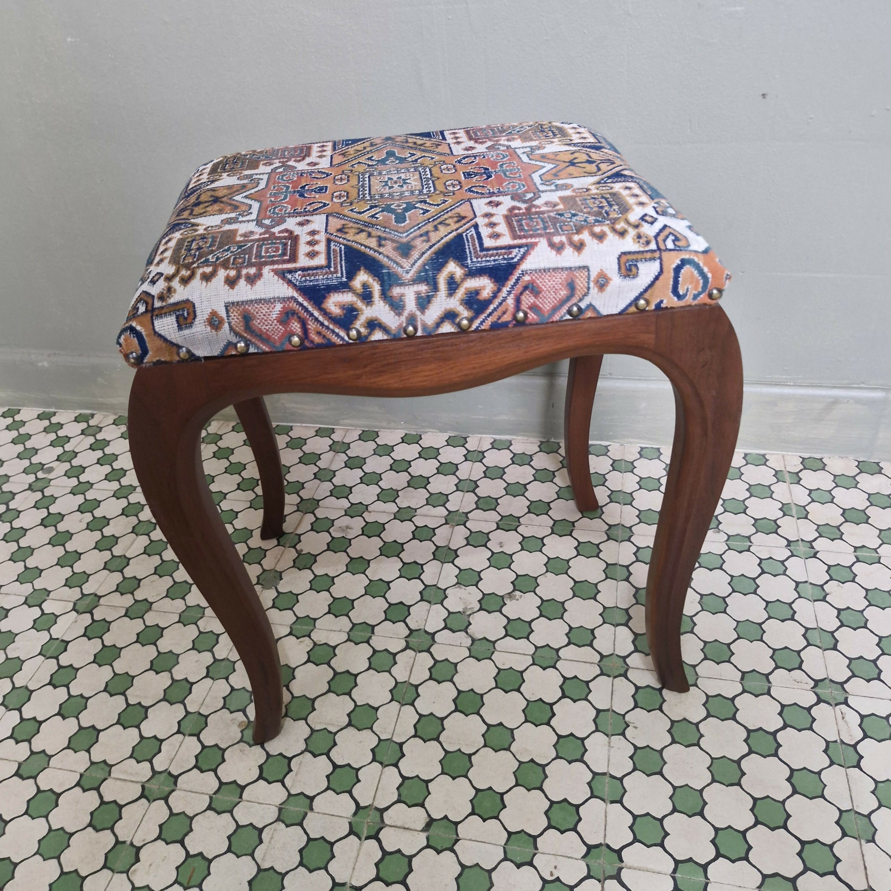 Belíssima banqueta Provençal com assento em tapete Belga,  peça restaurada para pronta entrega.