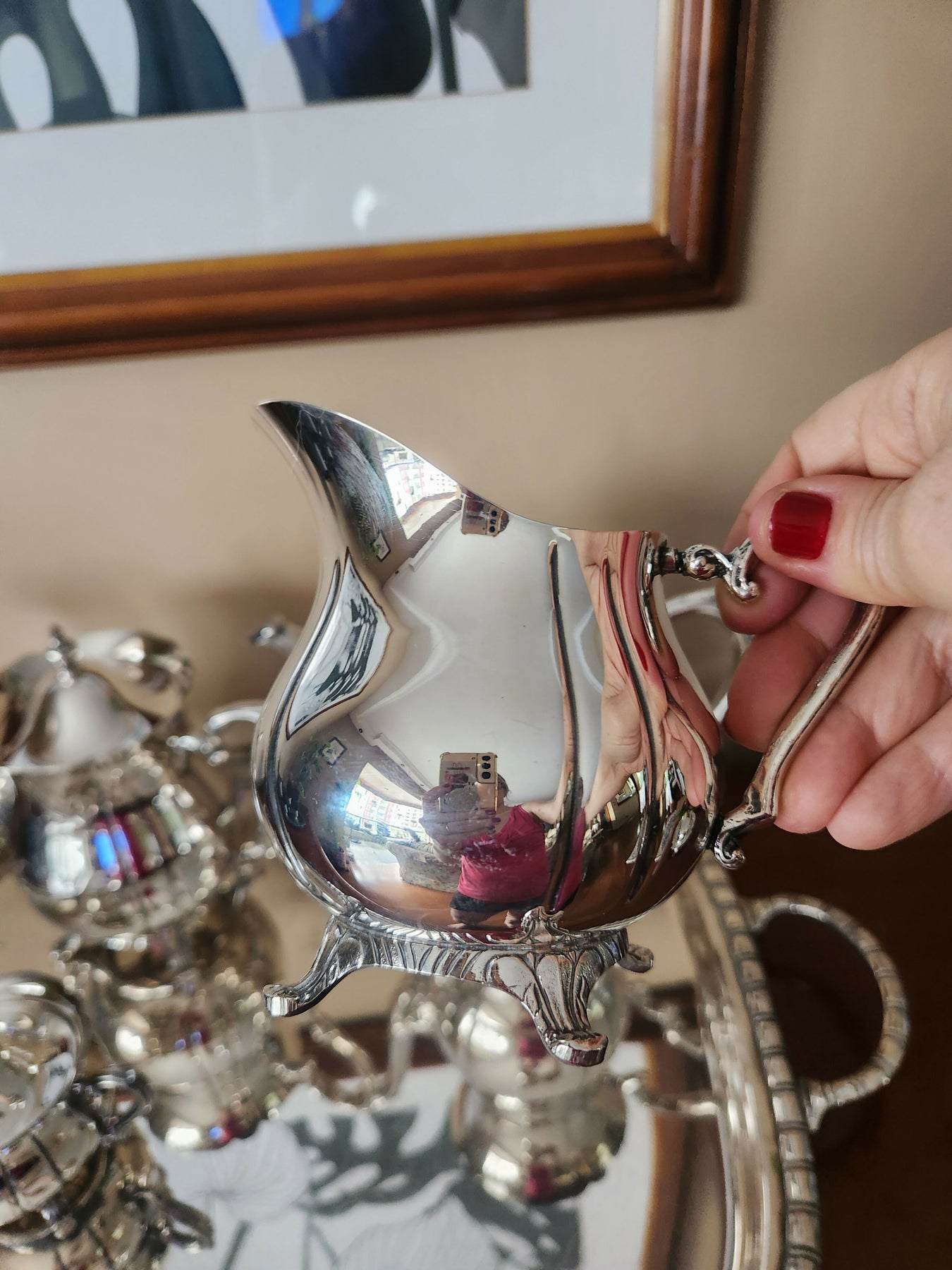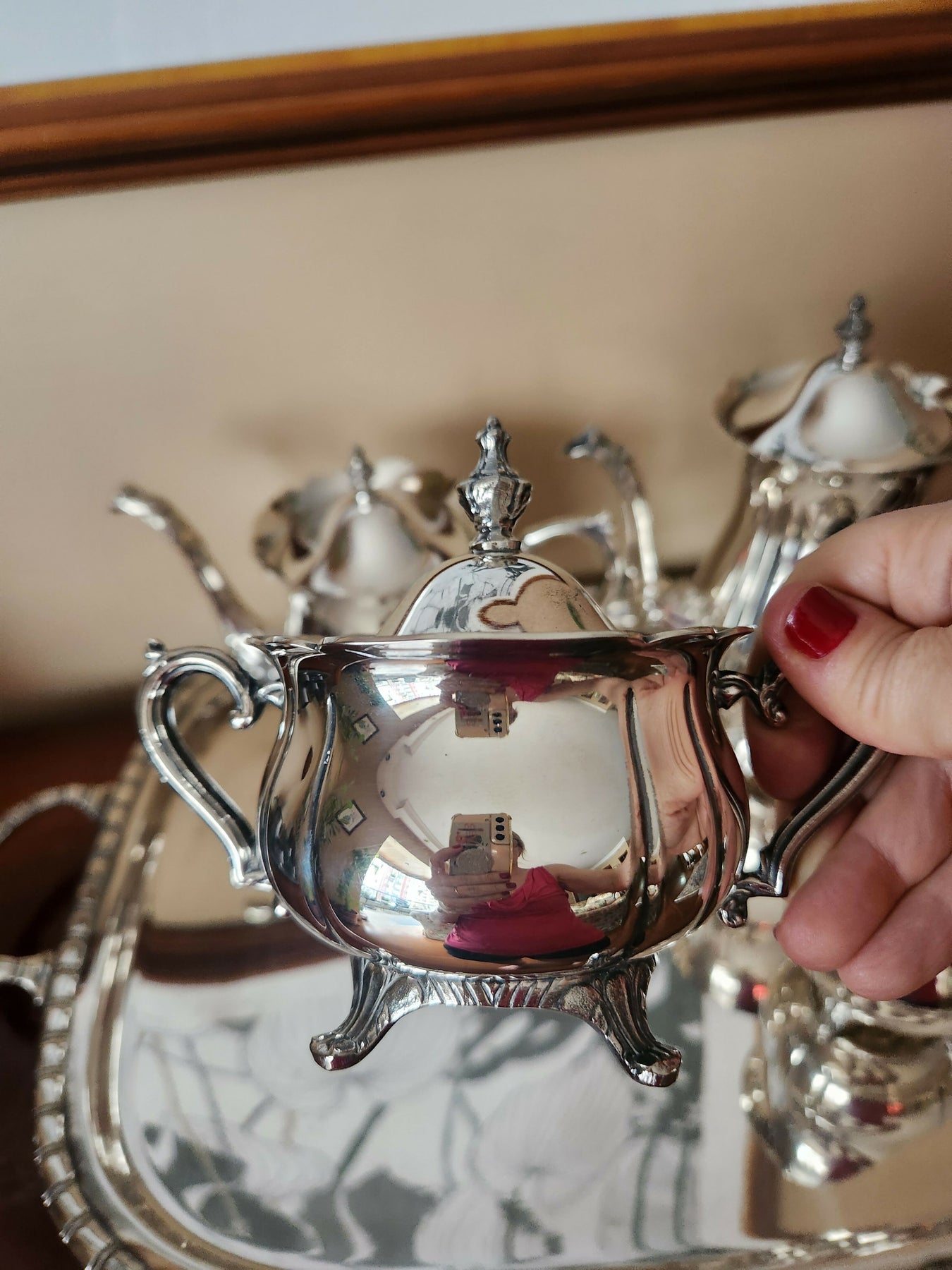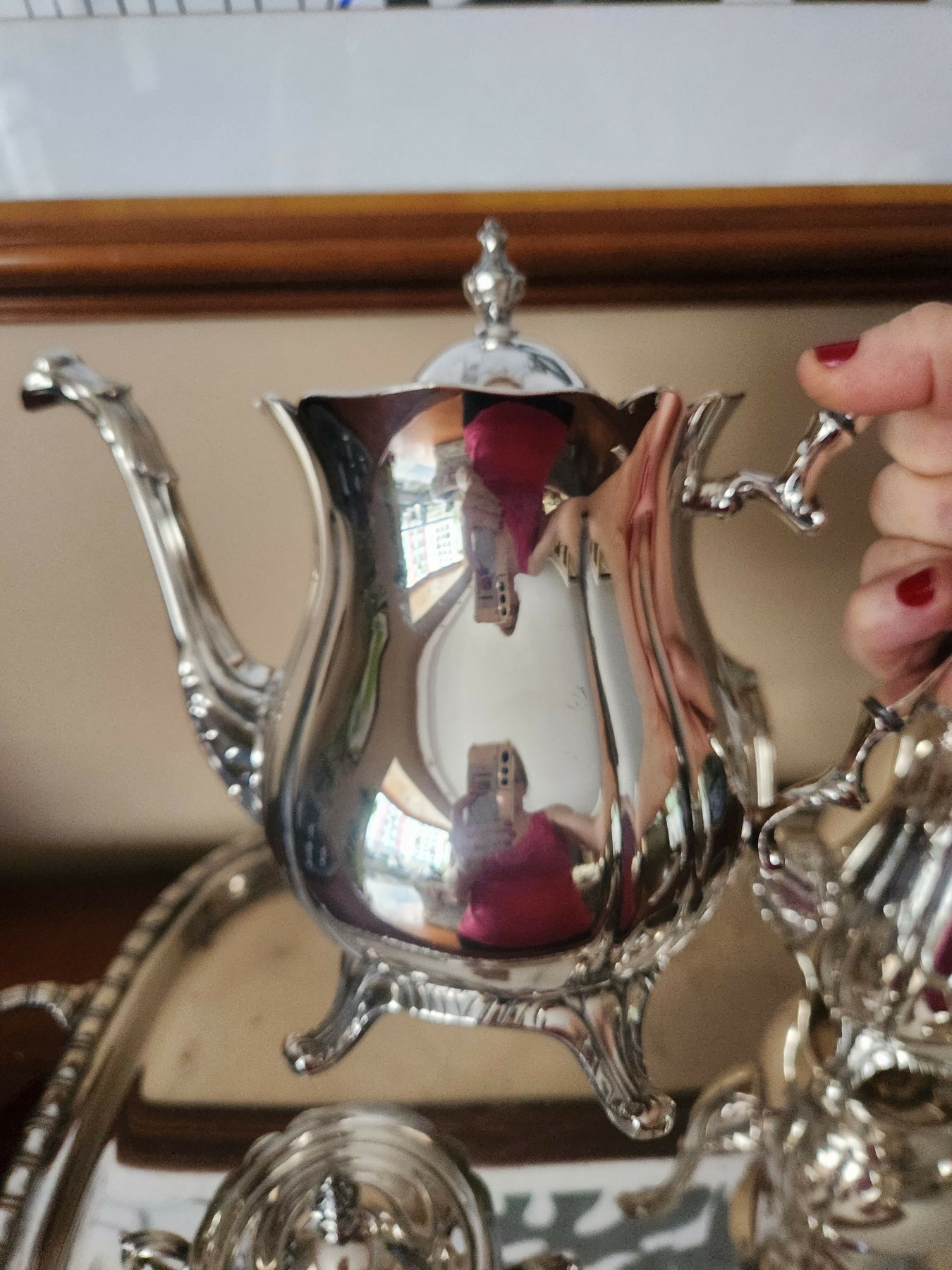 Lindo conjunto de cha e café em prata 90 Wolff com 5 peças: 1 bule para chá, 1 bule para café, 1 leiteira, 1 açucareiro e 1 bandeja. Design elegante e sofisticado.
