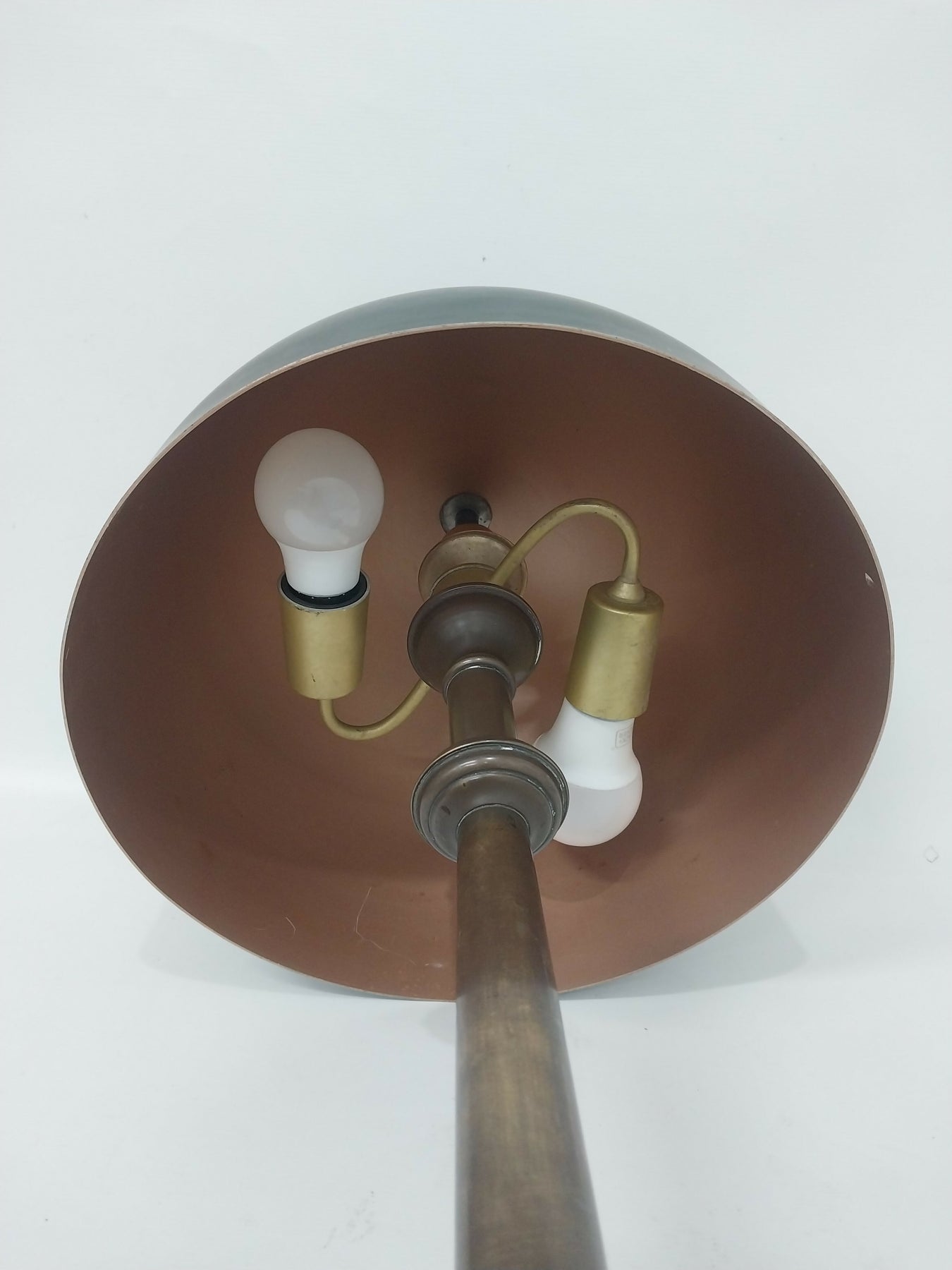 Luminária de Mesa Antiga Estilo Banker Lamps, em metal dourado com cúpula em metal reto fosco, bocal duplo, funcionando. 55x30 cm.