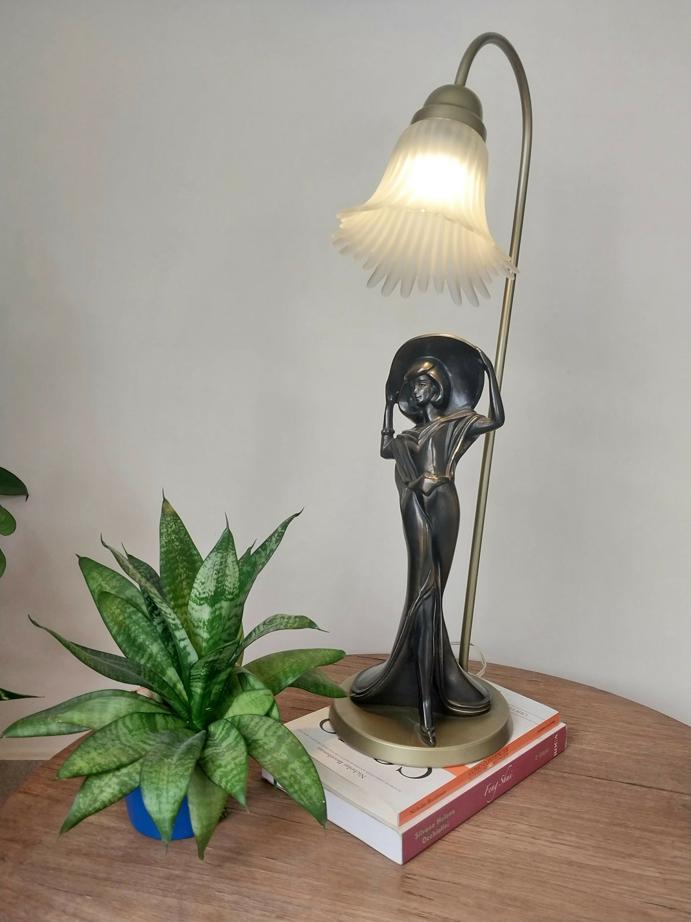 Luminária com base em formato de escultura feminina, inspirada no estilo Art Déco.