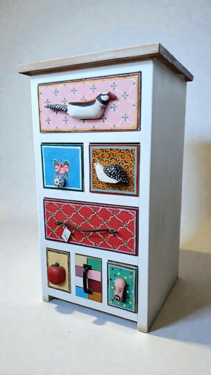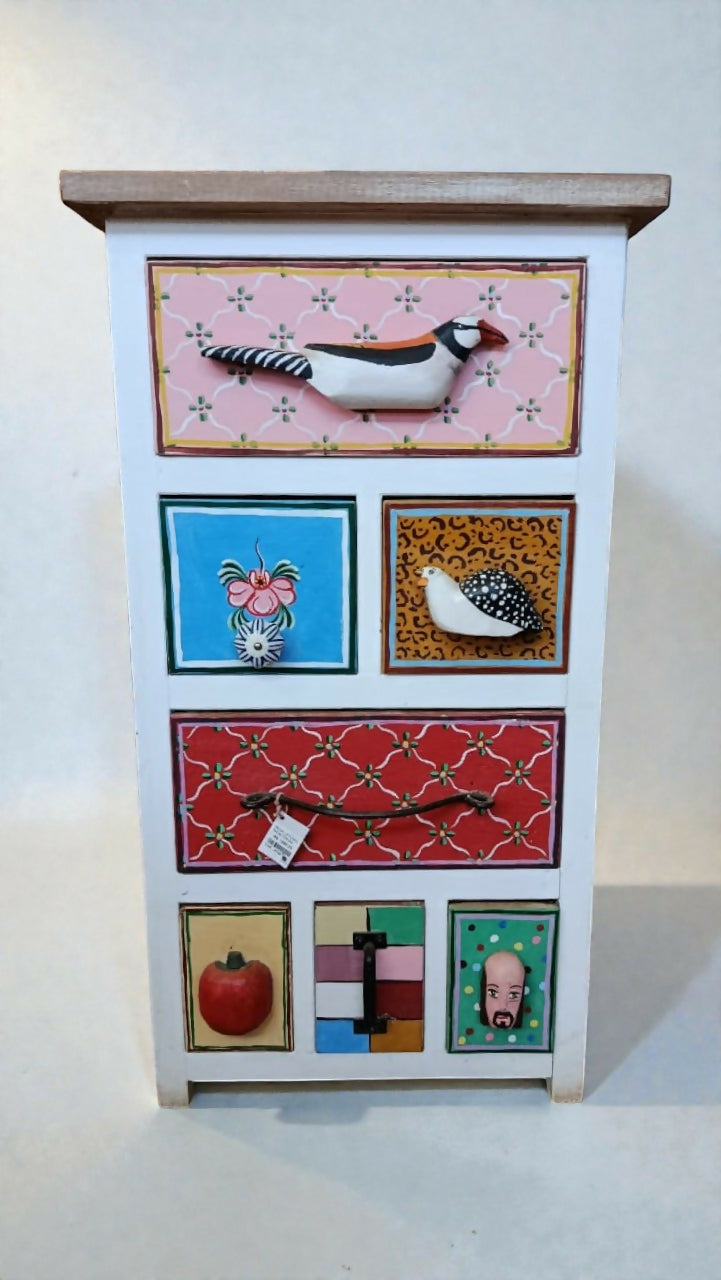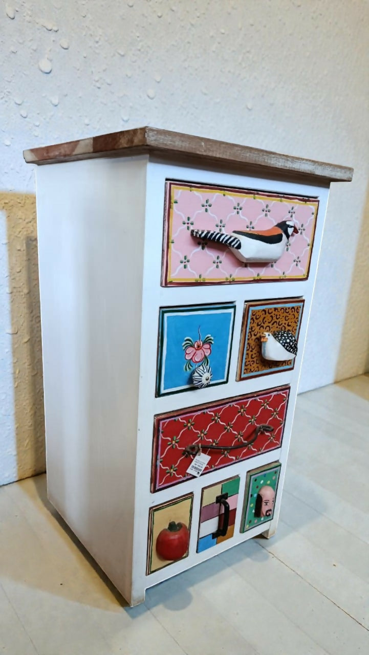 Mesa lateral alta produzida em madeira nobre, com excelente acabamento e alta durabilidade. A peça se destaca pelas gavetinhas pintadas à mão, cada uma com ilustrações únicas, cores vivas e detalhes artísticos que transformam o móvel em uma verdadeira obra decorativa.