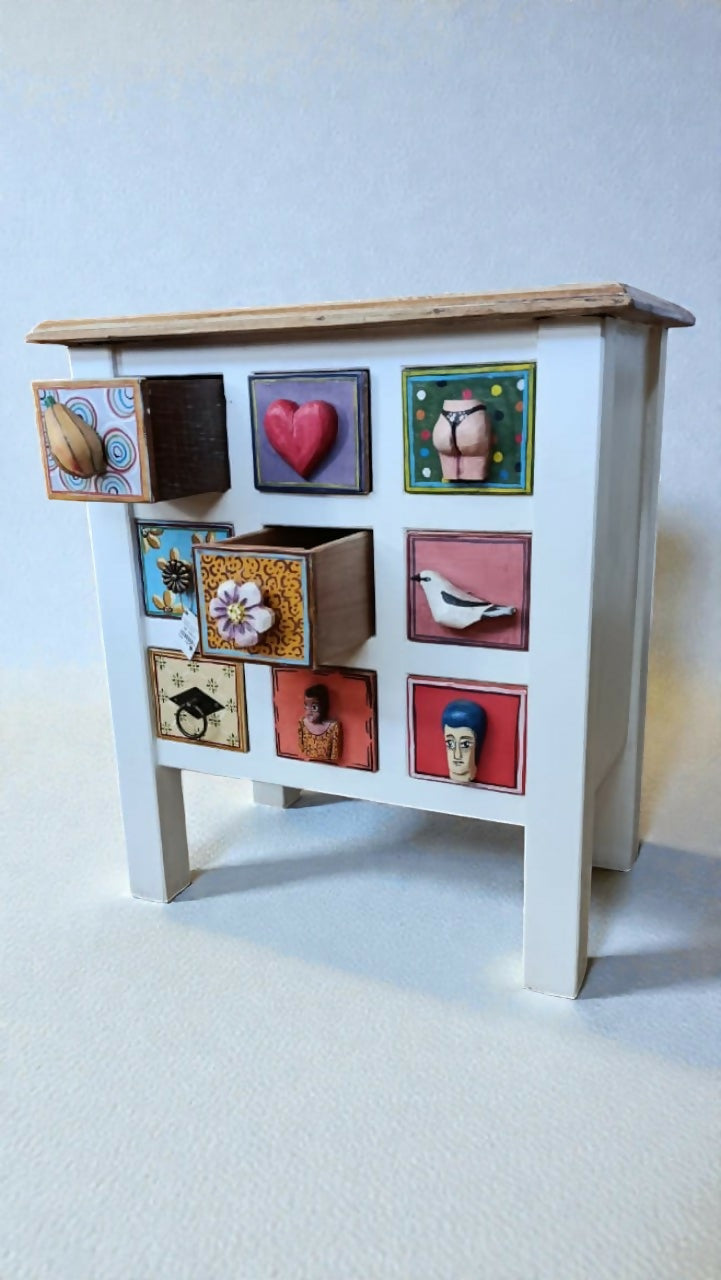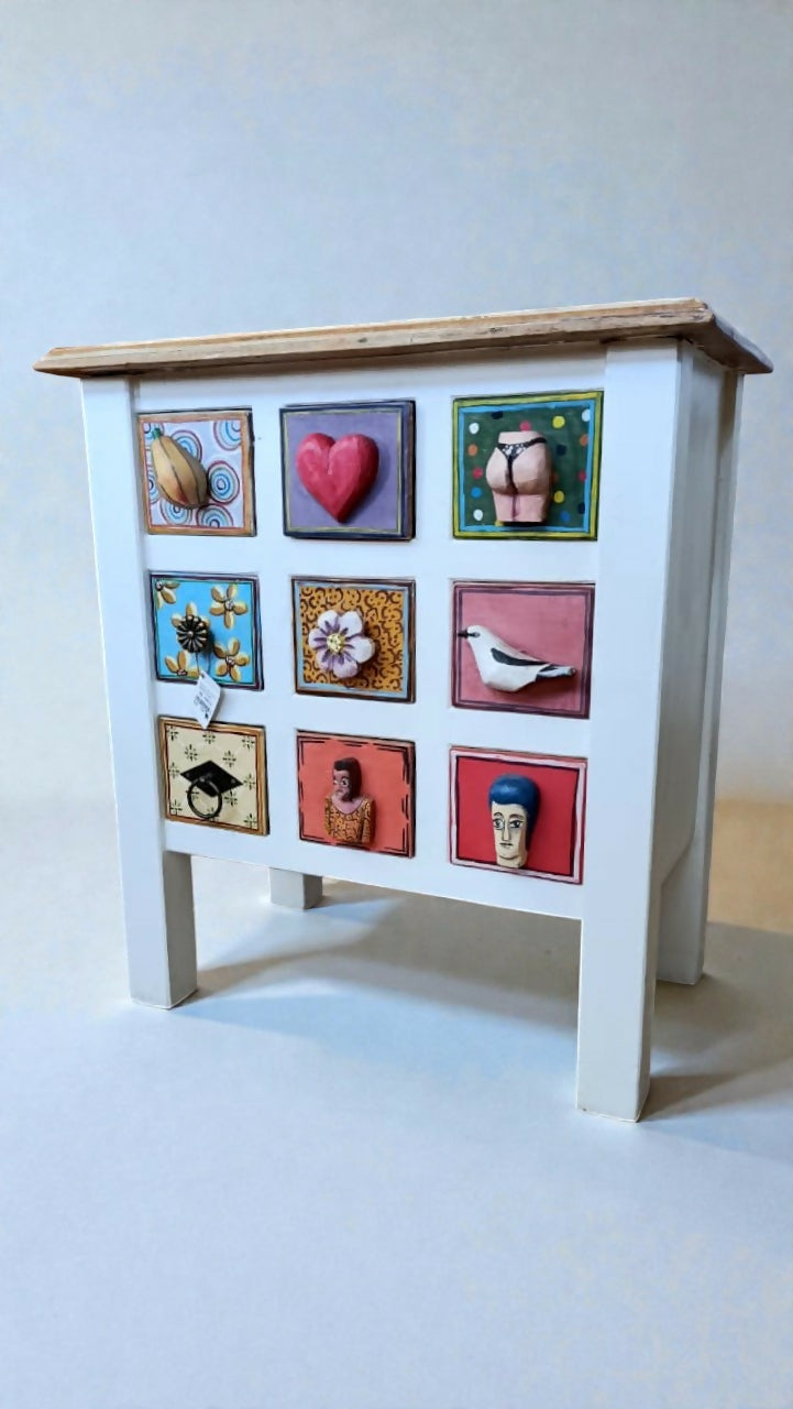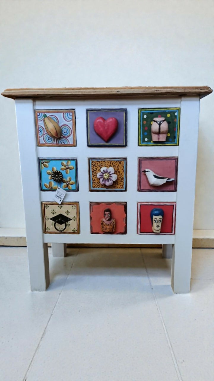 Mesa lateral baixa confeccionada em madeira nobre, com estrutura sólida, tampo em madeira natural e acabamento claro que realça o design artesanal. A peça possui gavetinhas pintadas à mão, cada uma com ilustrações exclusivas em cores vibrantes e relevos decorativos, tornando o móvel único e cheio de personalidade.