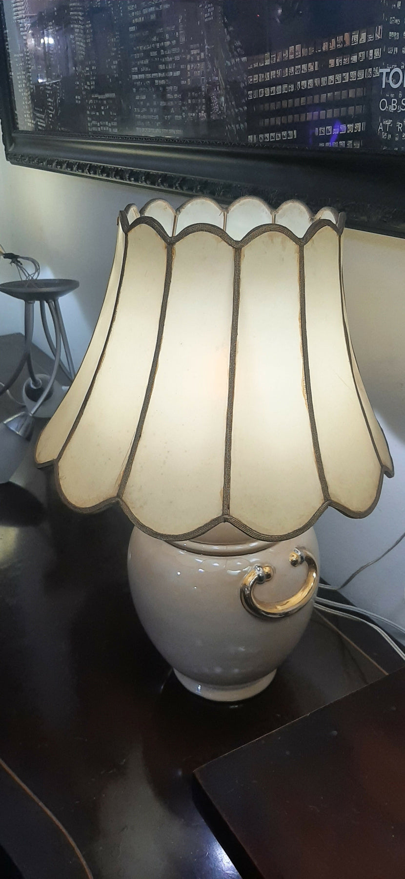 Belíssimo par de abajures vintage com base em porcelana e cúpula em acetato.