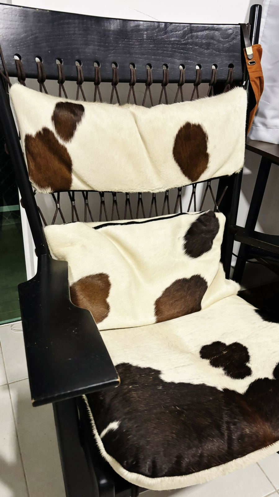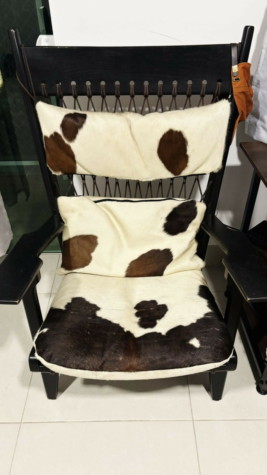 Estrutura em carvalho americano ebanizado, almofadas revestidas em pelo natural. Fabricada nos EUA. Peça única, em ótimo estado de conservação. Defeitos na madeira conforme fotos.