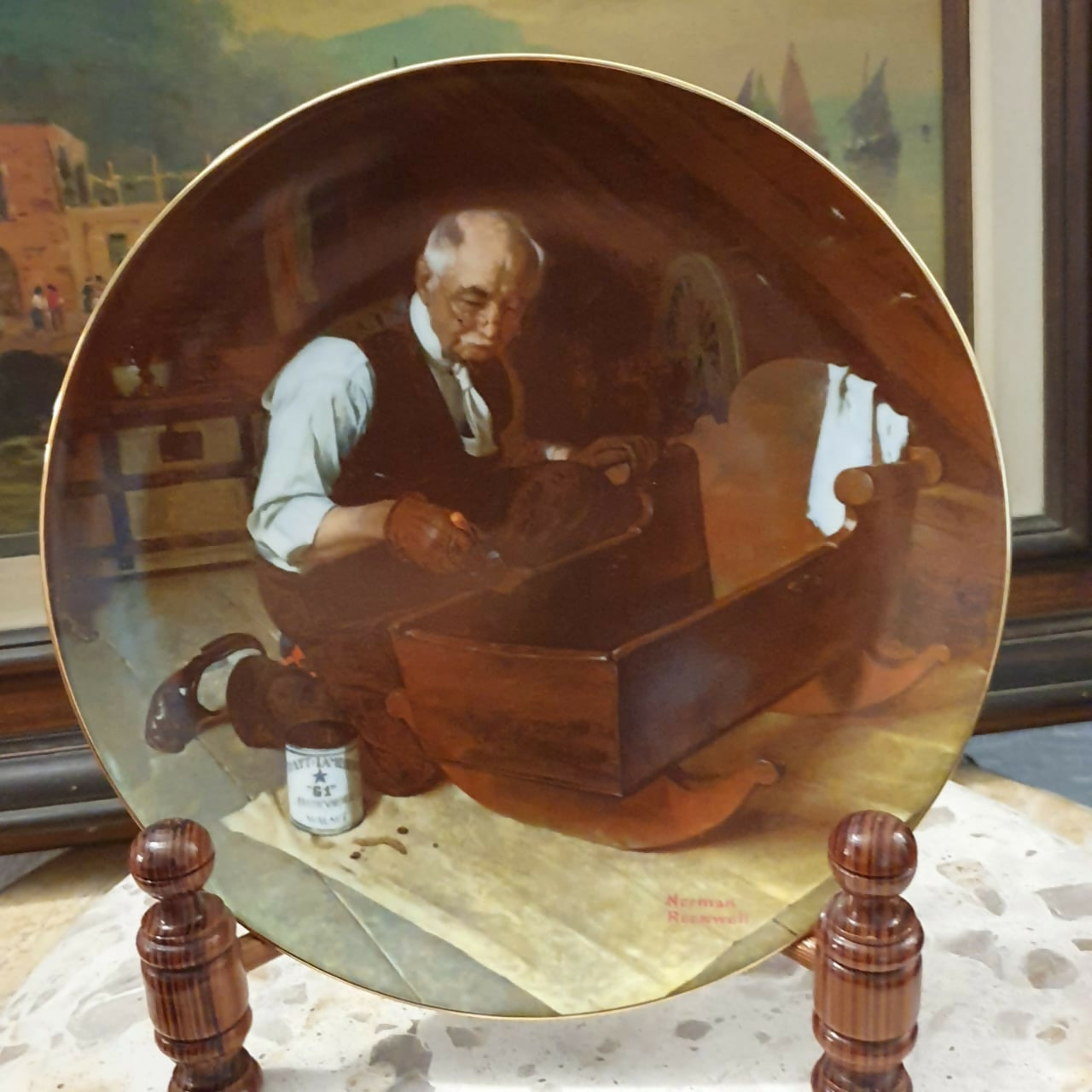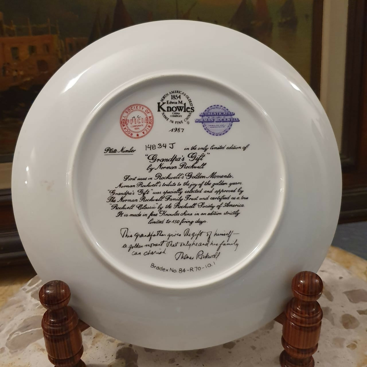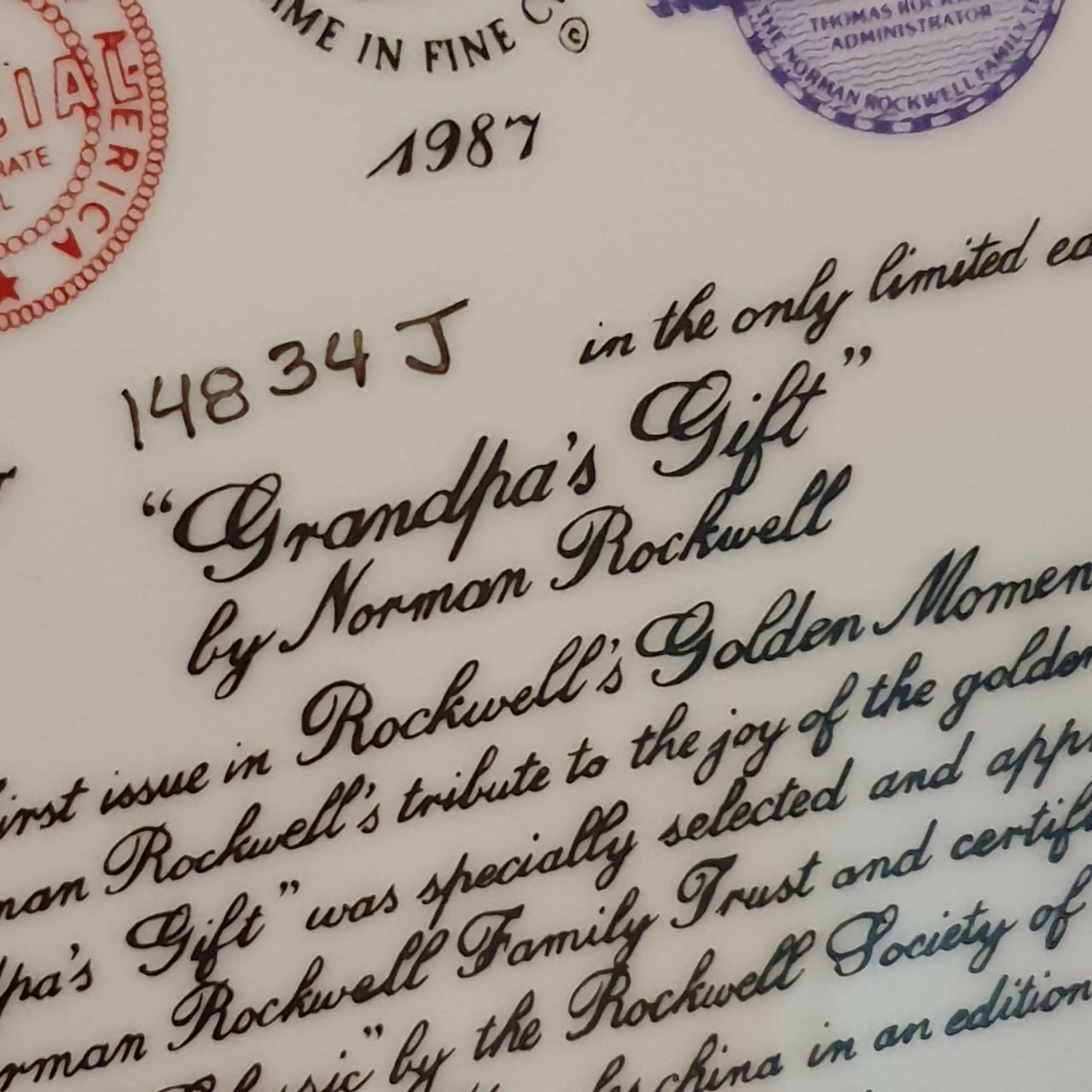 Incrível e muito raro, prato decorativo em porcelana americana Knowles, coleção Norman Rockwell,  modelo Grandpa's Gift" de 1987.