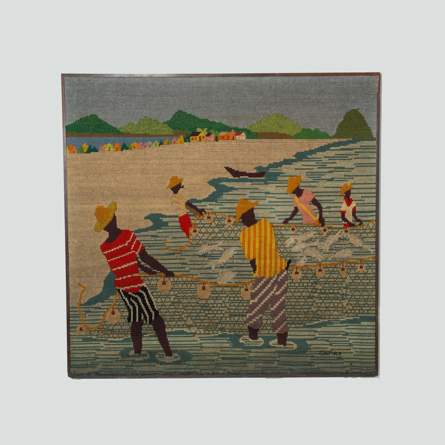 Djanira da Motta e Silva - Magnifica Tapeçaria feita a mão de excepcional qualidade, em bom estado de conservação. Alegre e colorida obra. Assinada. Obra de grandes dimensões. CID. Com a moldura. A artista além de pintora era ilustradora, também produzia tapeçaria e azulejaria. Geralmente a inspiração para as tapeçarias , assim como nas telas eram cenas do cotidiano.