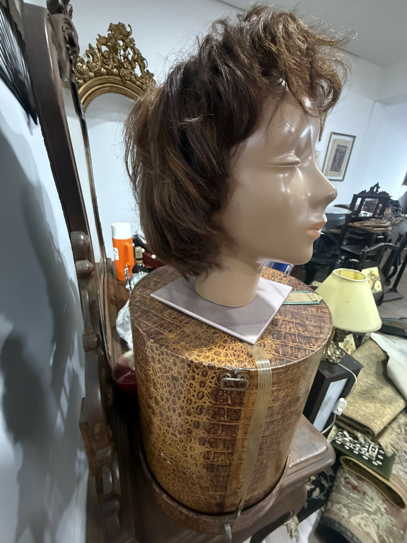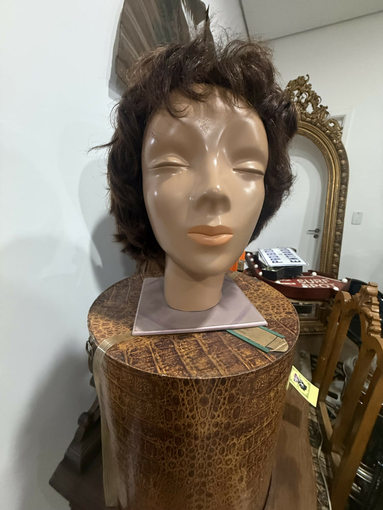 Conjunto completo e autêntico composto por caixa cilíndrica de peruca (Wig Case) com revestimento croco e cabeça-manequim original em baquelite, material de luxo usado entre as décadas de 1940 e 1960.