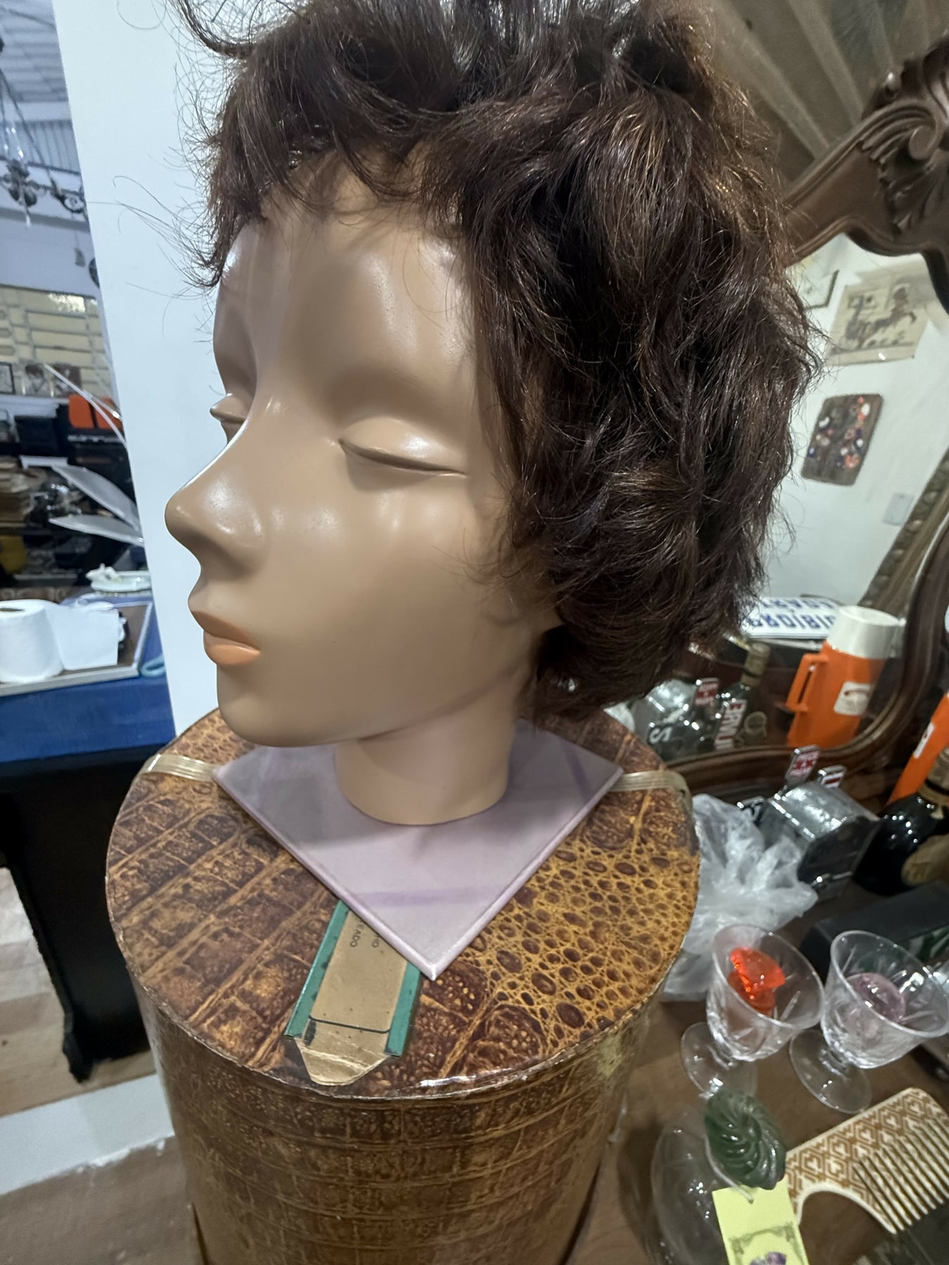 A cabeça em baquelite apresenta pátina e forma clássica utilizada por salões profissionais, perfeita para exposição ou conservação de perucas. A caixa mantém ferragens, formato e acabamento originais, em excelente estado.