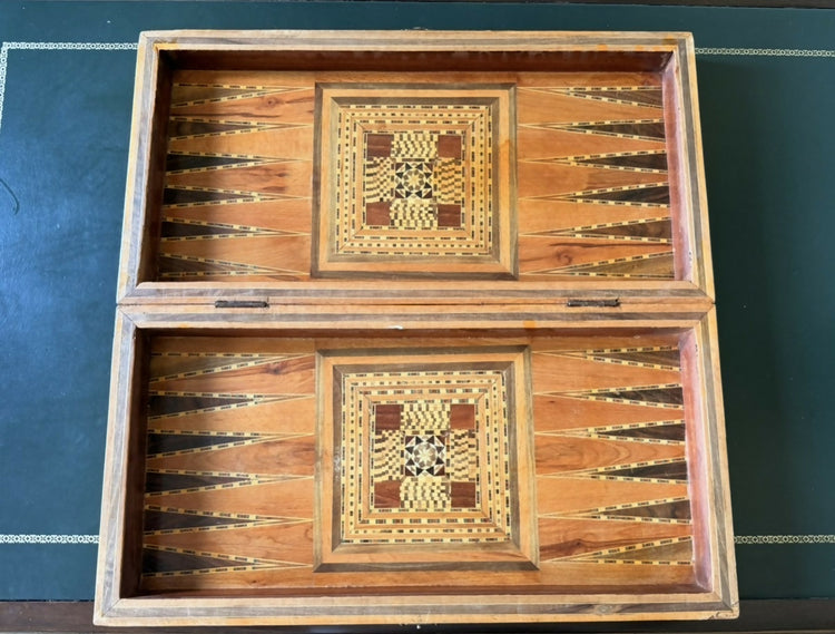 De um lado tabuleiro de xadrez (sem as peças) e no interior, jogo de gamão, que conta com algumas fichas de madeira.