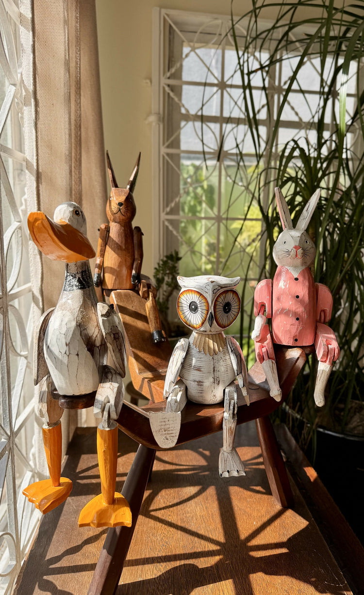 BICHOS esculpidos em madeira maciça, coruja, coelhos e pato articulados