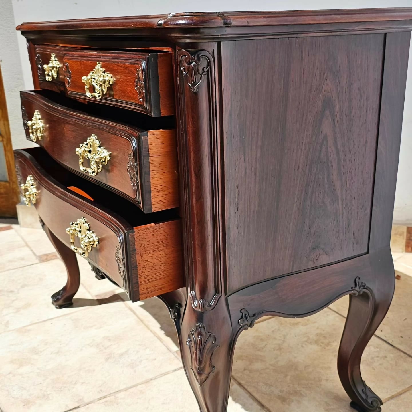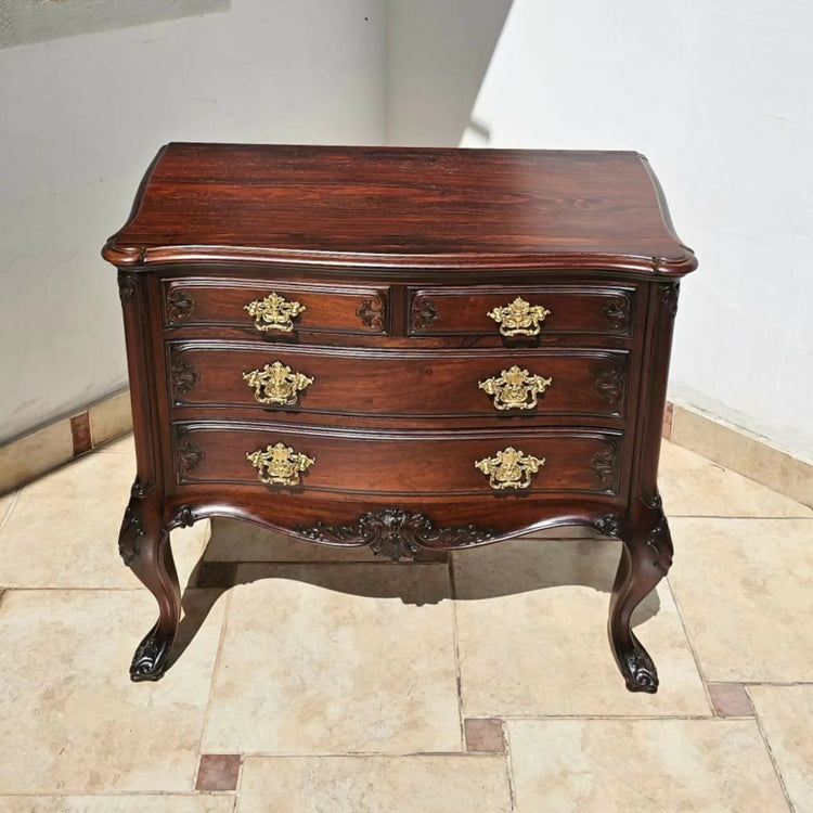 Antiga cômoda Dom José, jacarandá maciço, puxadores em bronze e selo original.