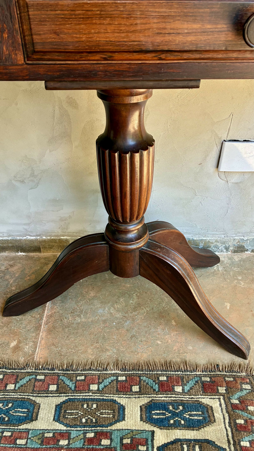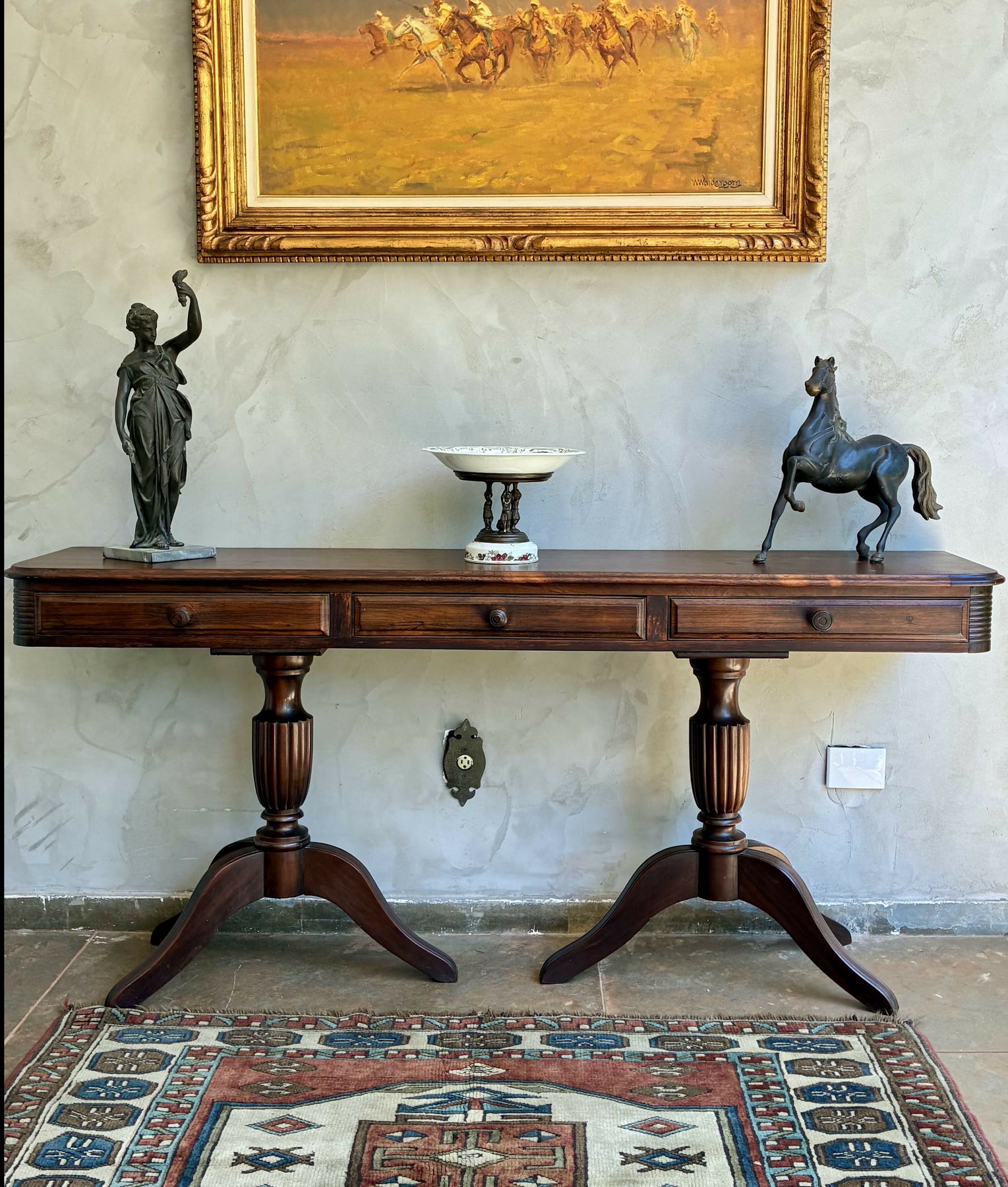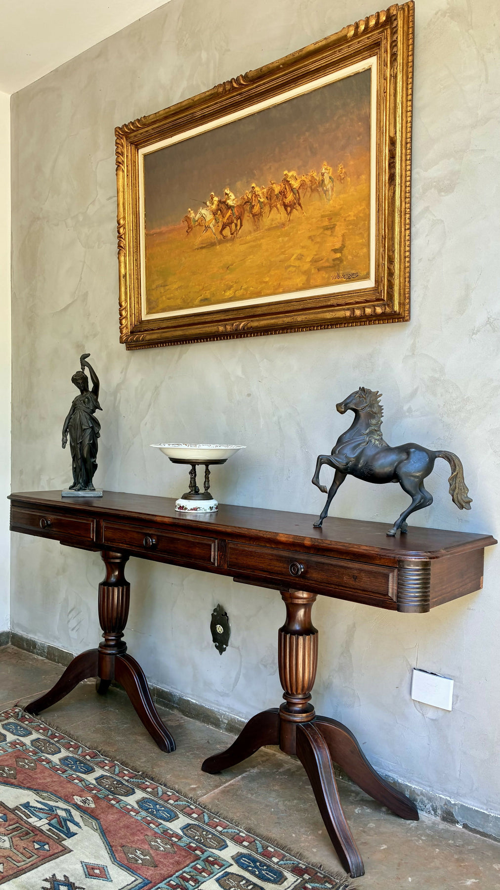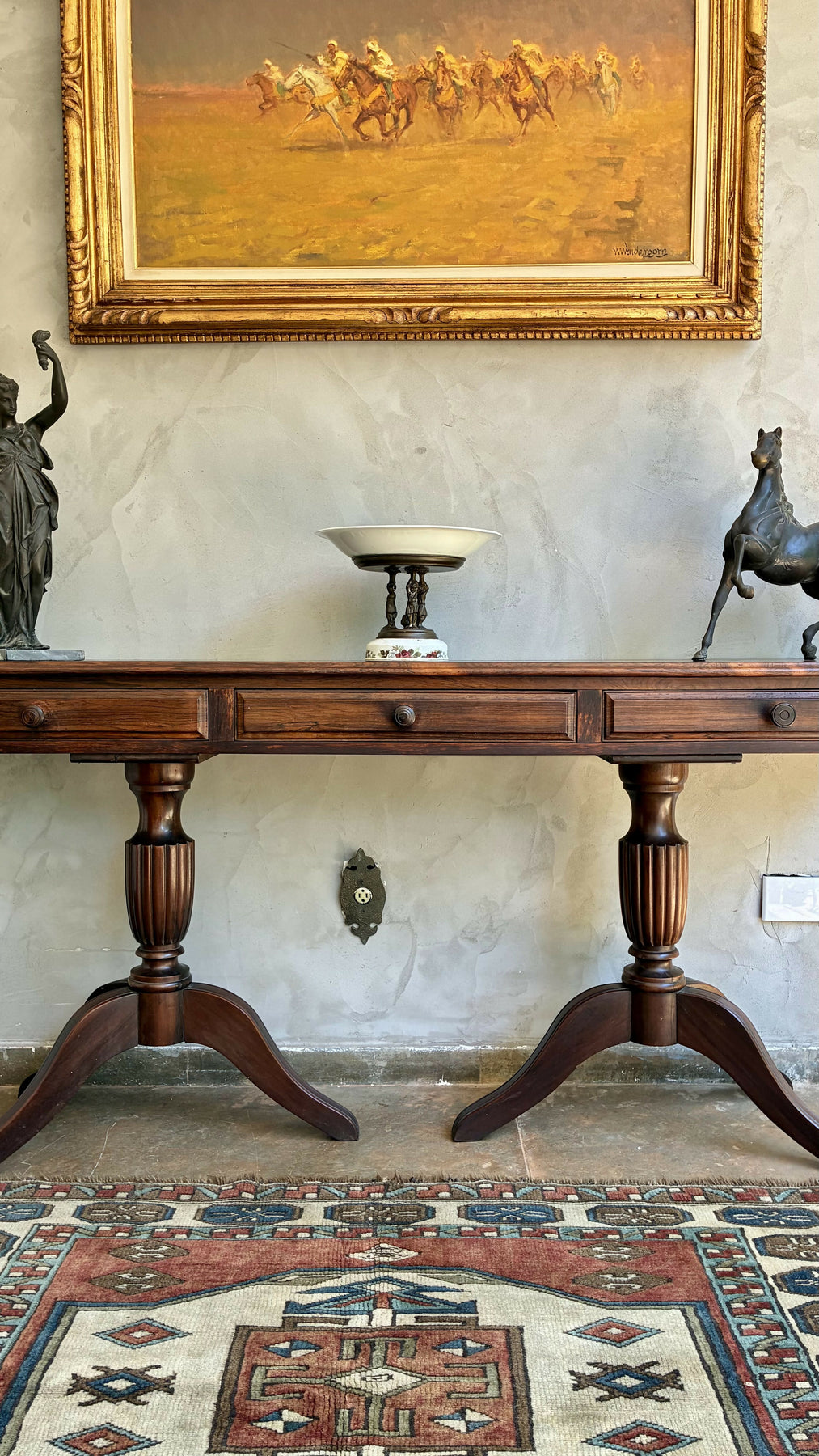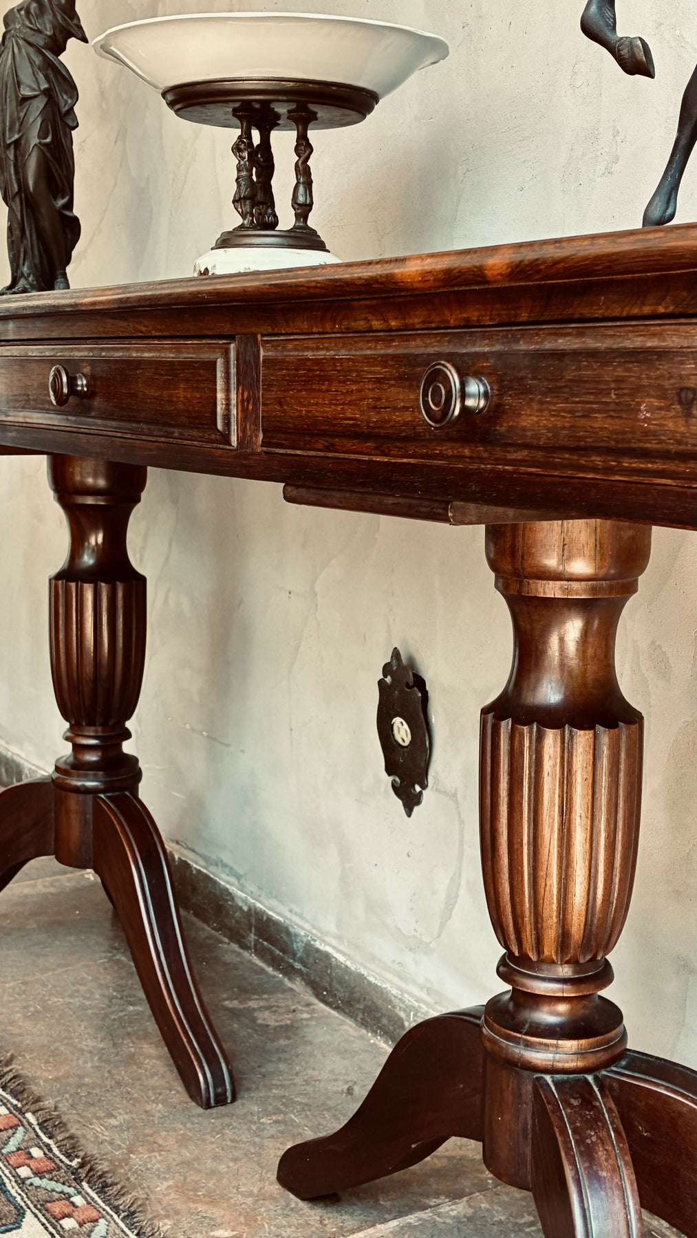 Aparador clássico em madeira. O tampo amplo e reto é sustentado por duas bases torneadas, com pés curvos em estilo tradicional, garantindo estabilidade e sofisticação.