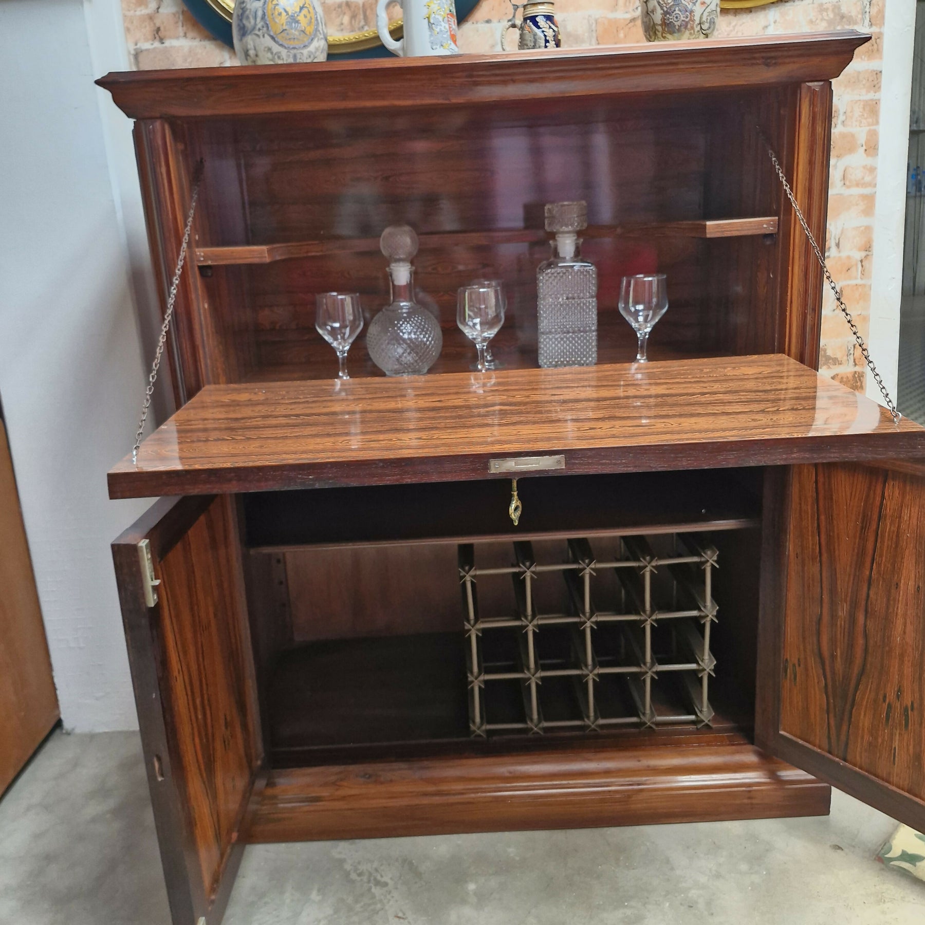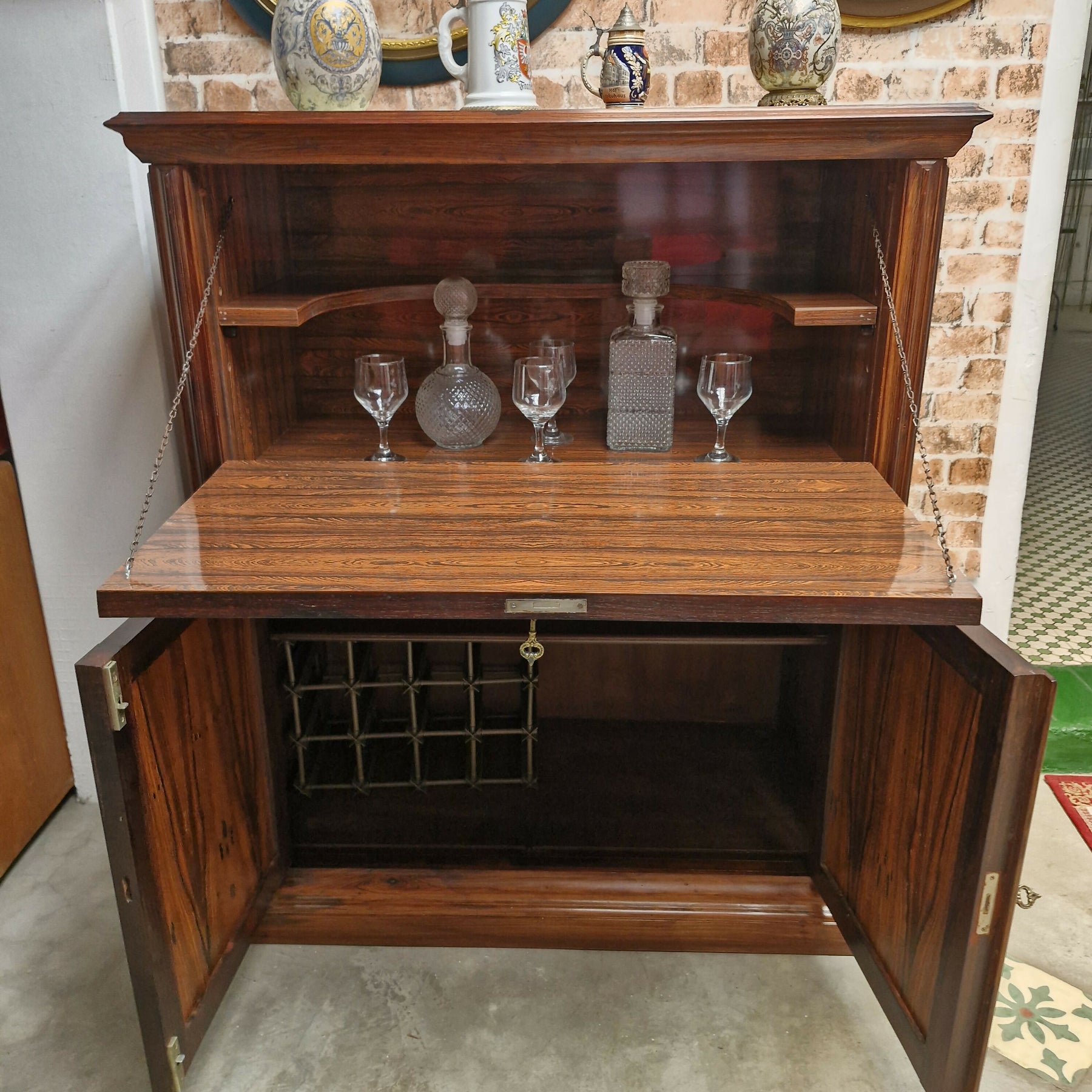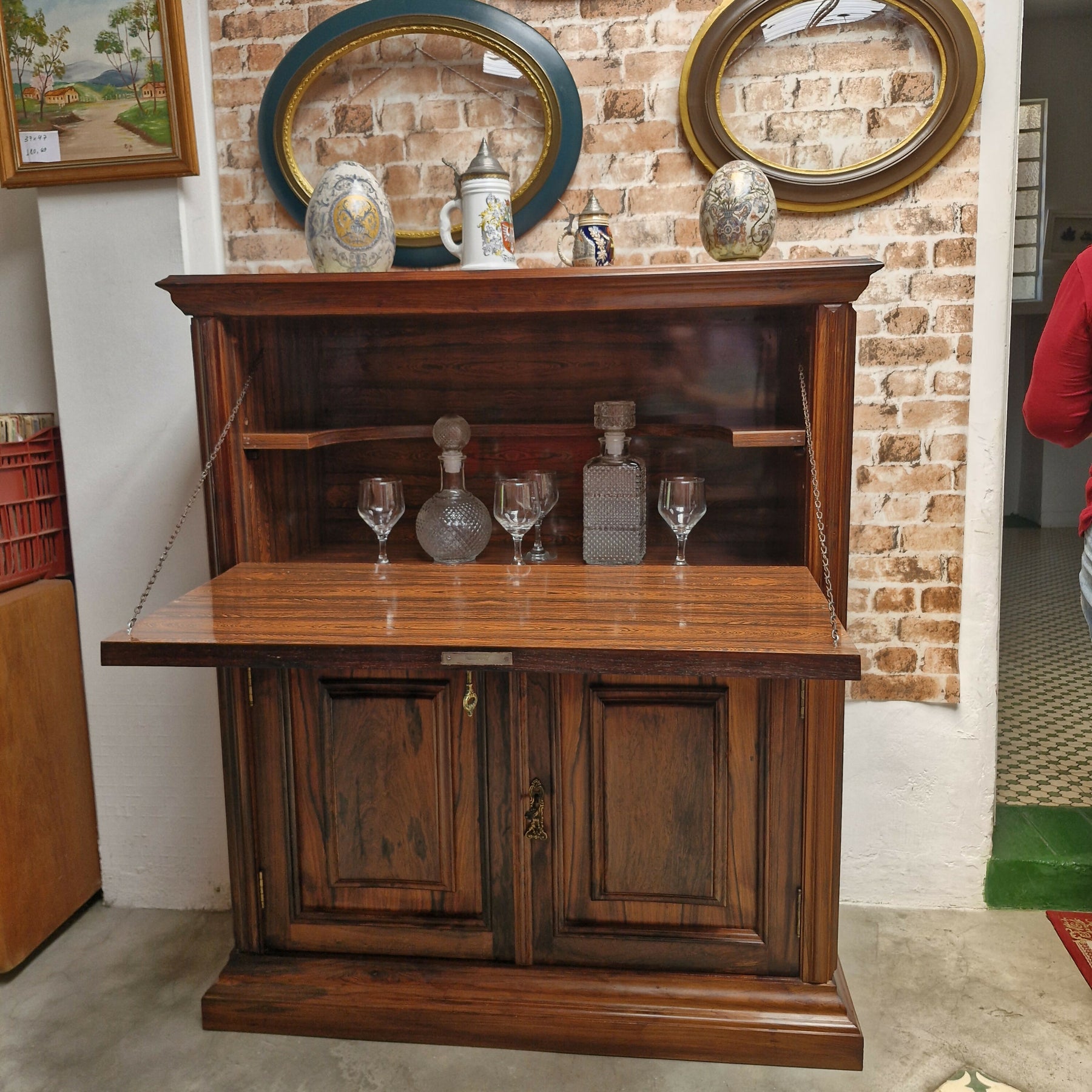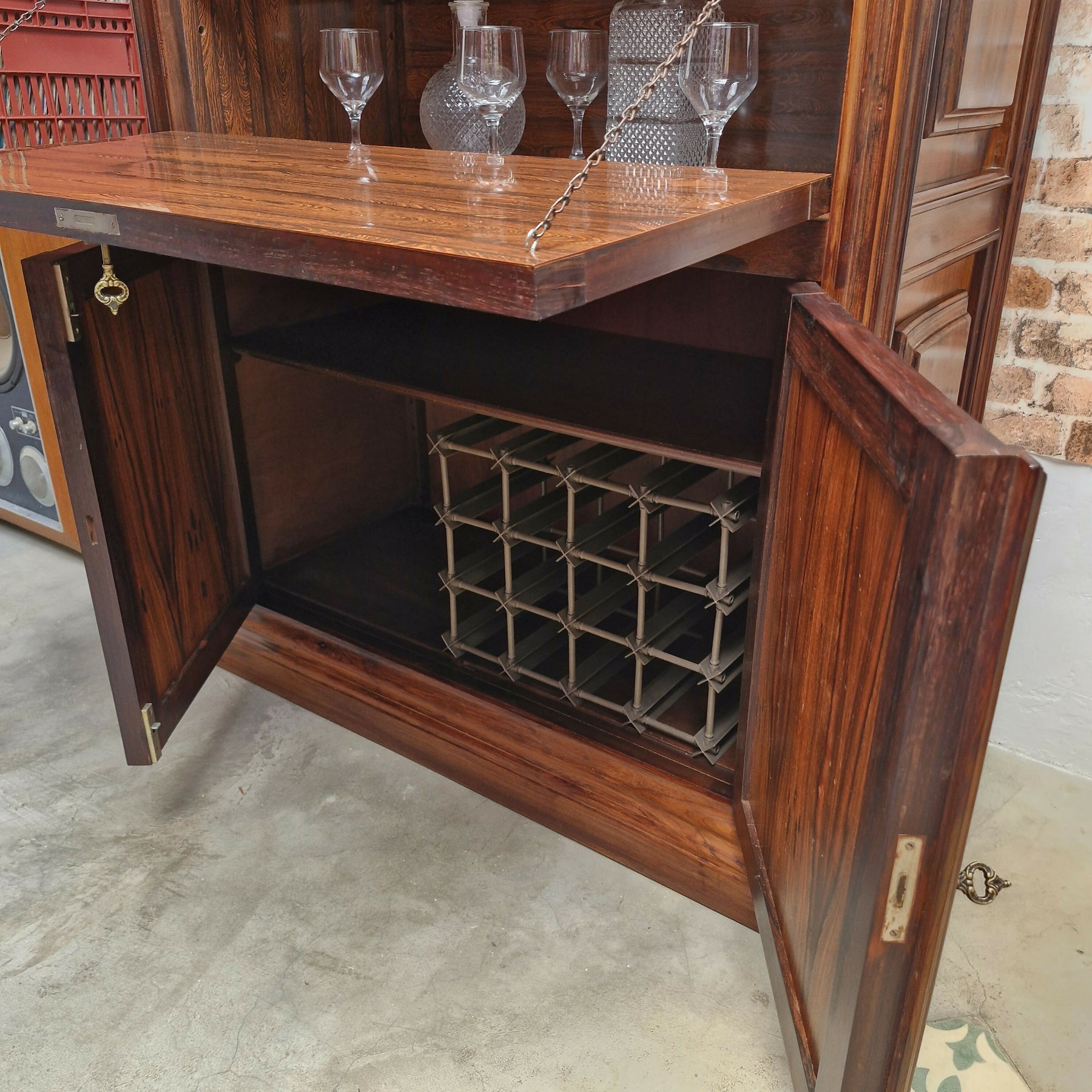 Belíssimo bar em jacaranda peça composta de porta basculante na parte superior com um prateleira interna e 2 portas na parte inferior  ambas com chsve movel em otimo estado para pronta entrega.