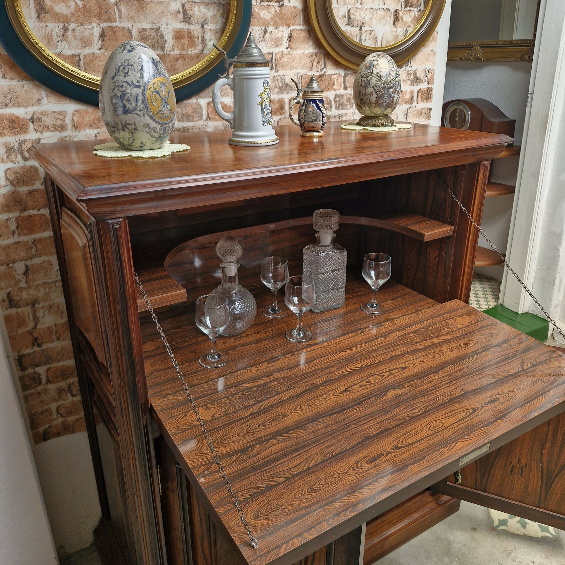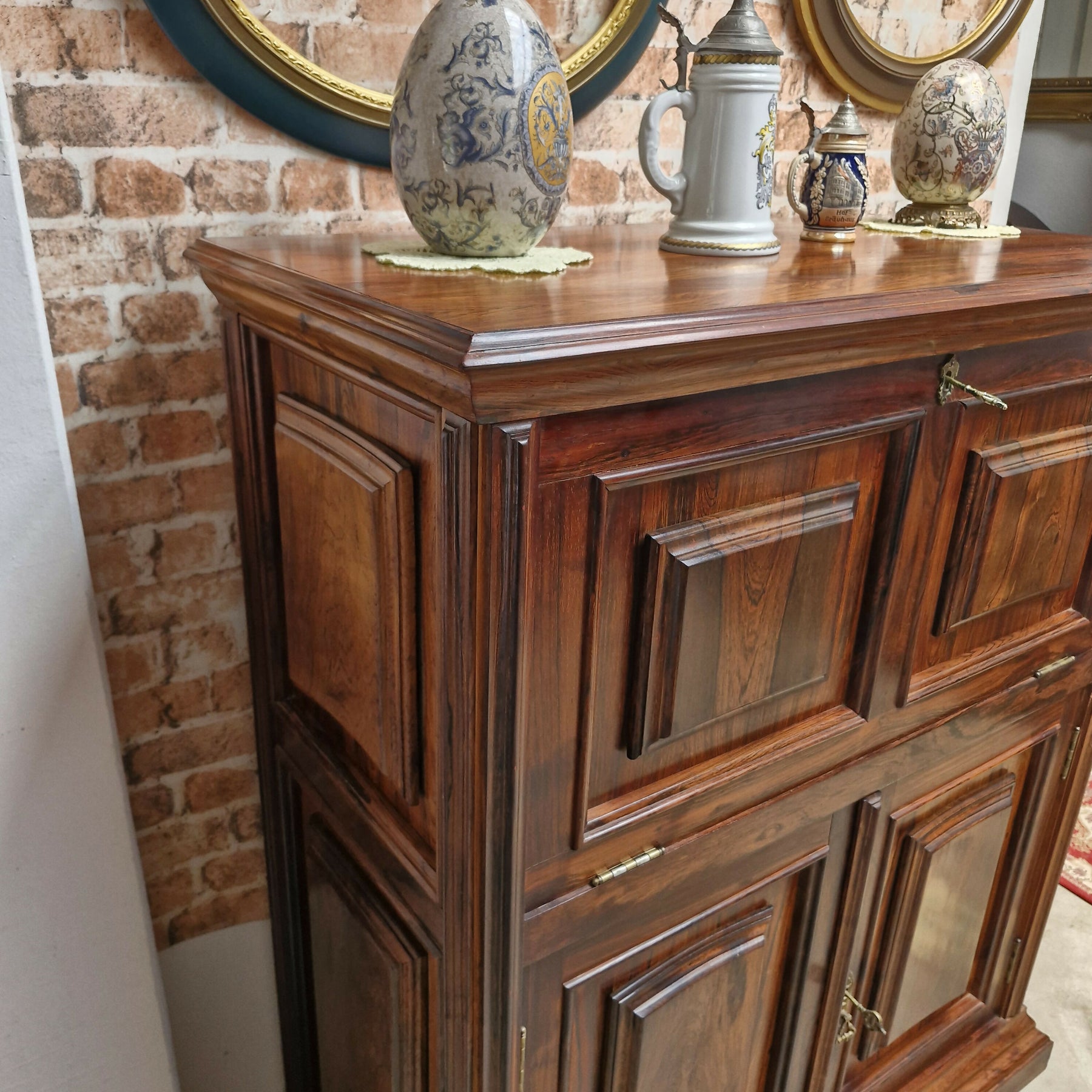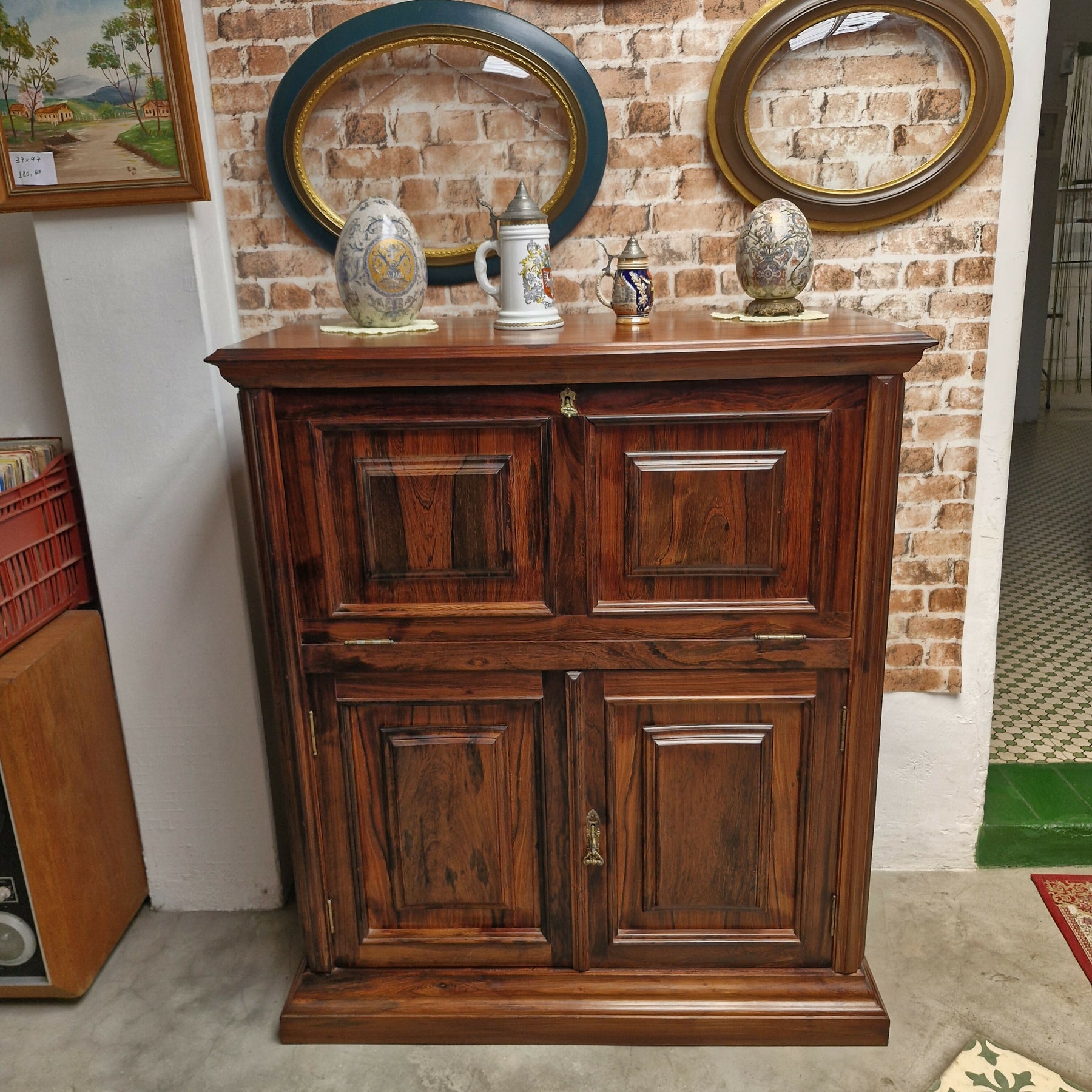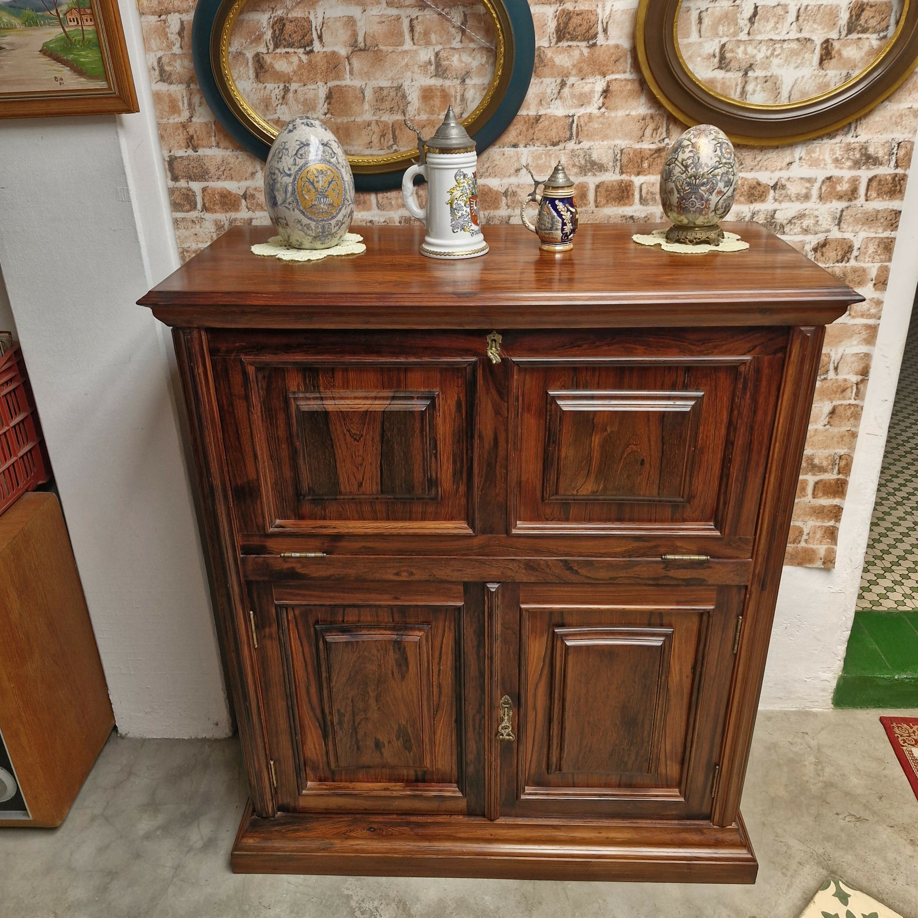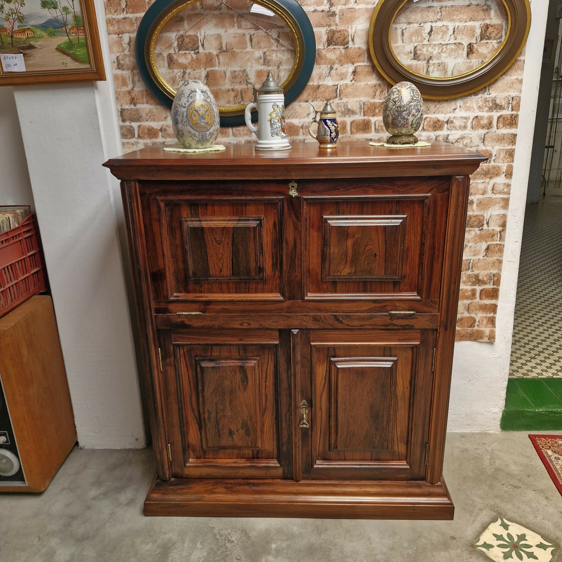 Belíssimo bar em jacaranda peça composta de porta basculante na parte superior com um prateleira interna e 2 portas na parte inferior  ambas com chsve movel em otimo estado para pronta entrega.