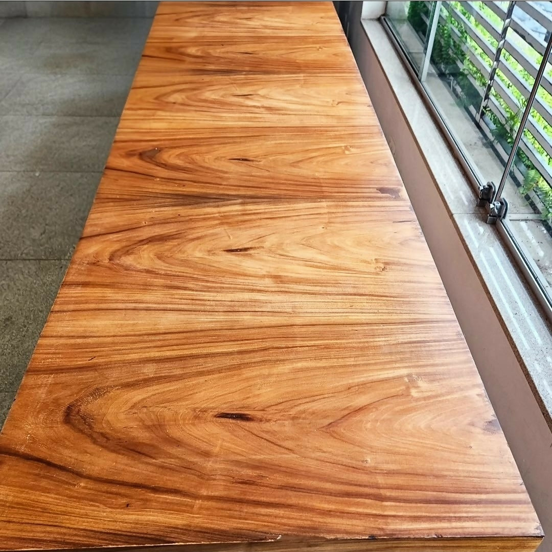 Com imponentes 3 metros de extensão, a peça foi produzida em caviúna maciça de alta qualidade: pés, encabeçamentos, gavetas e prateleiras. O tampo e as portas foram feitas em lâminas da mesma madeira, com restauros pontuais, necessários pelo desgaste da passagem do tempo. Possui alguns pequenos riscos e marcas na madeira, que não interferem na aparência geral, permitindo sua utilização imediata.