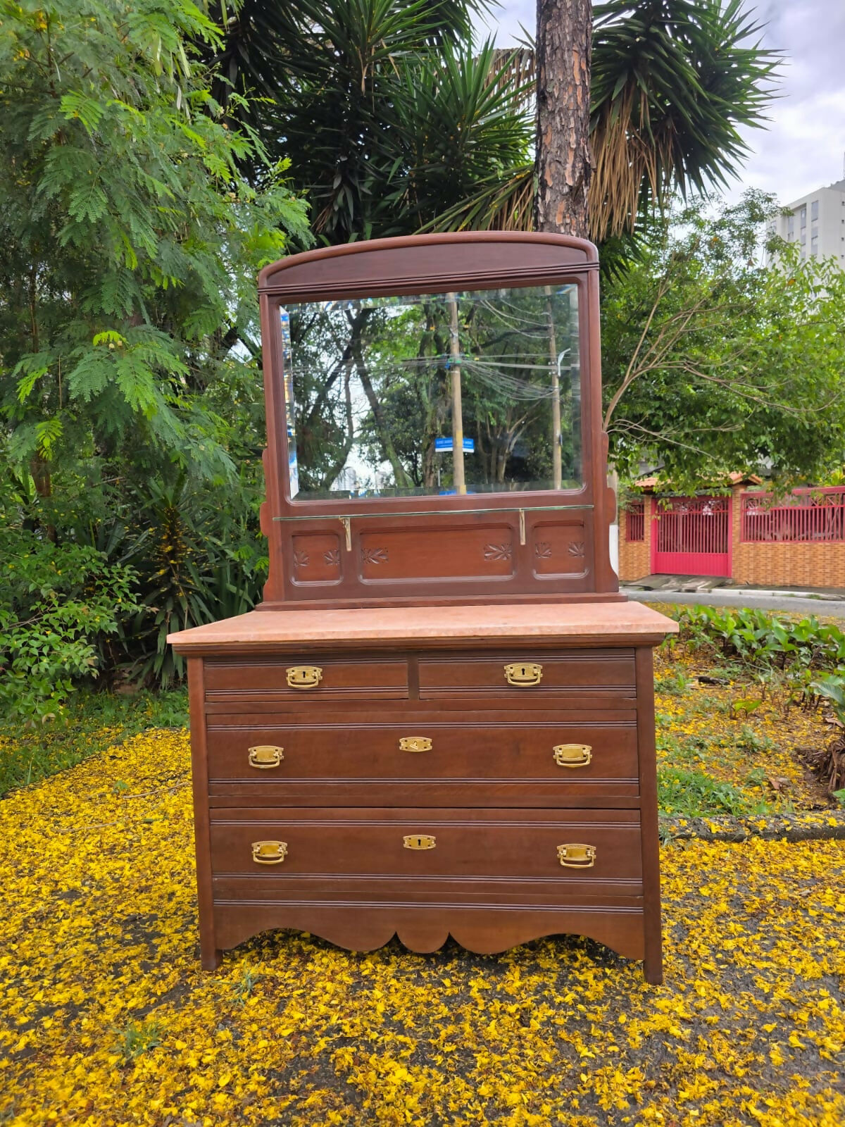Cômoda/Penteadeira Art Nouveau em imbuia, com espelho bisotê e delicados detalhes entalhados.