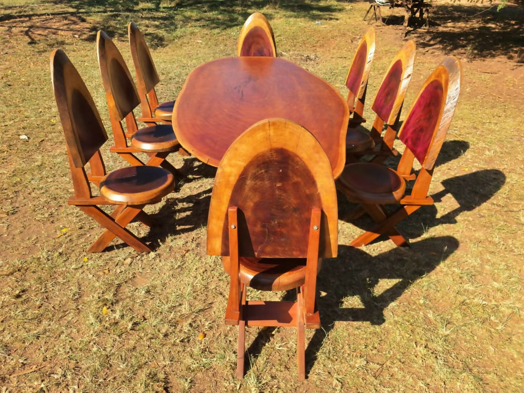 Lindo Conjunto de Mesa e Cadeiras rústicas em Madeira de lei. A mesa é de prancha de madeira Natural, com corte feito na diagonal, mantendo-se todas as características naturais da árvore (Cerne, alburno e casca), tornando-a uma peça única e rara na região. Altura: 81cm Comprimento: 272cm Largura: 112cm Além da mesa, o Conjunto também possui 8 cadeiras de Madeira Natural Roxinho, com encostos cortados na diagonal e assentos cortados na horizontal. As cadeiras possuem assento e encosto com cavidades arredondadas, tornando-as confortáveis. O Conjunto possui cerca de 30 anos e foi adquirido no estado do Tocantins. *O Conjunto está em Bebedouro SP e entregamos em demais regiões. (17) 99614-4336 / José