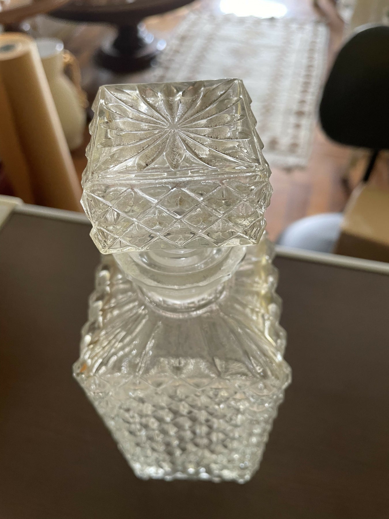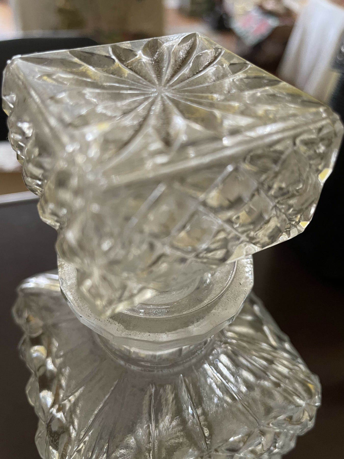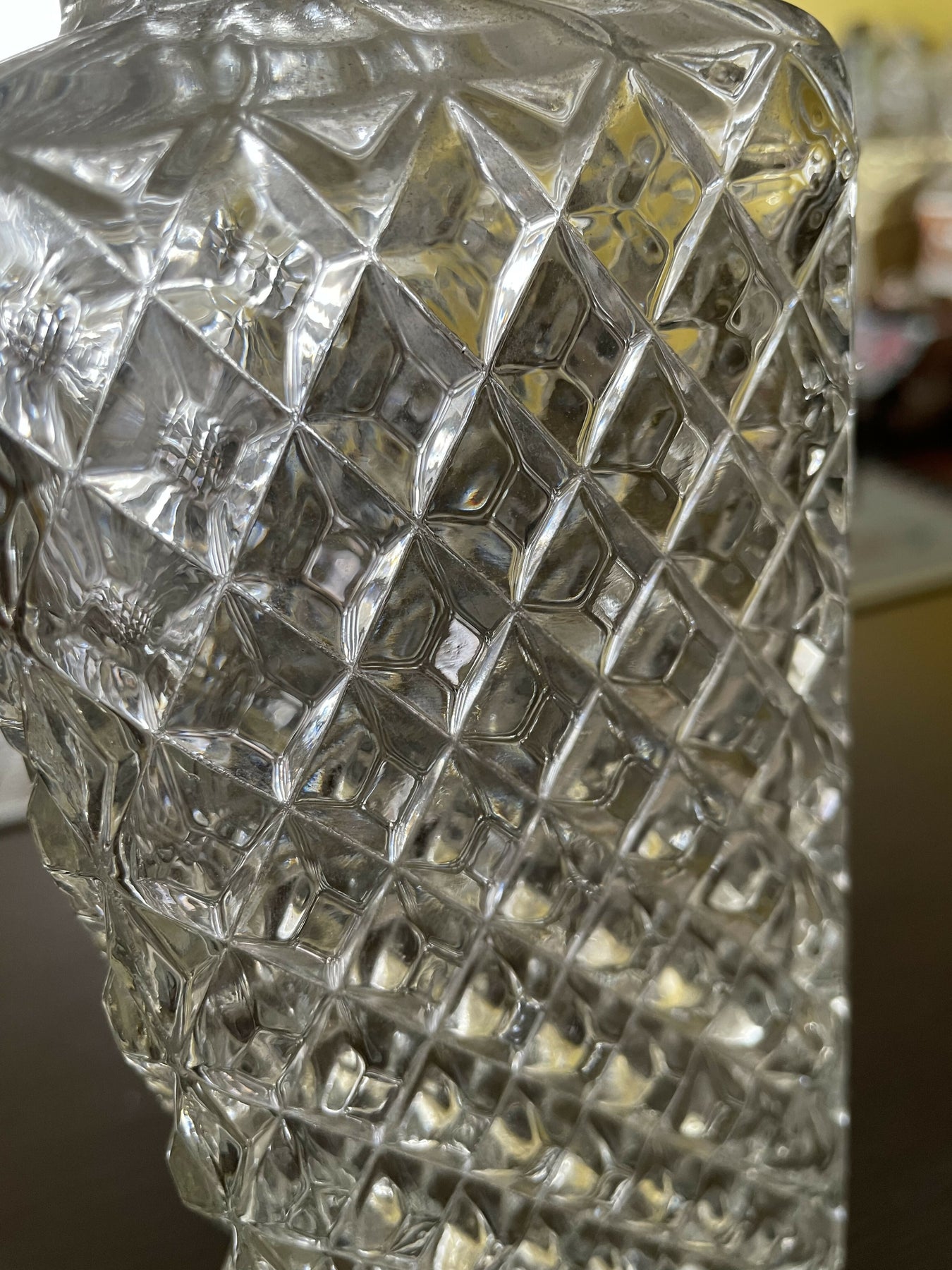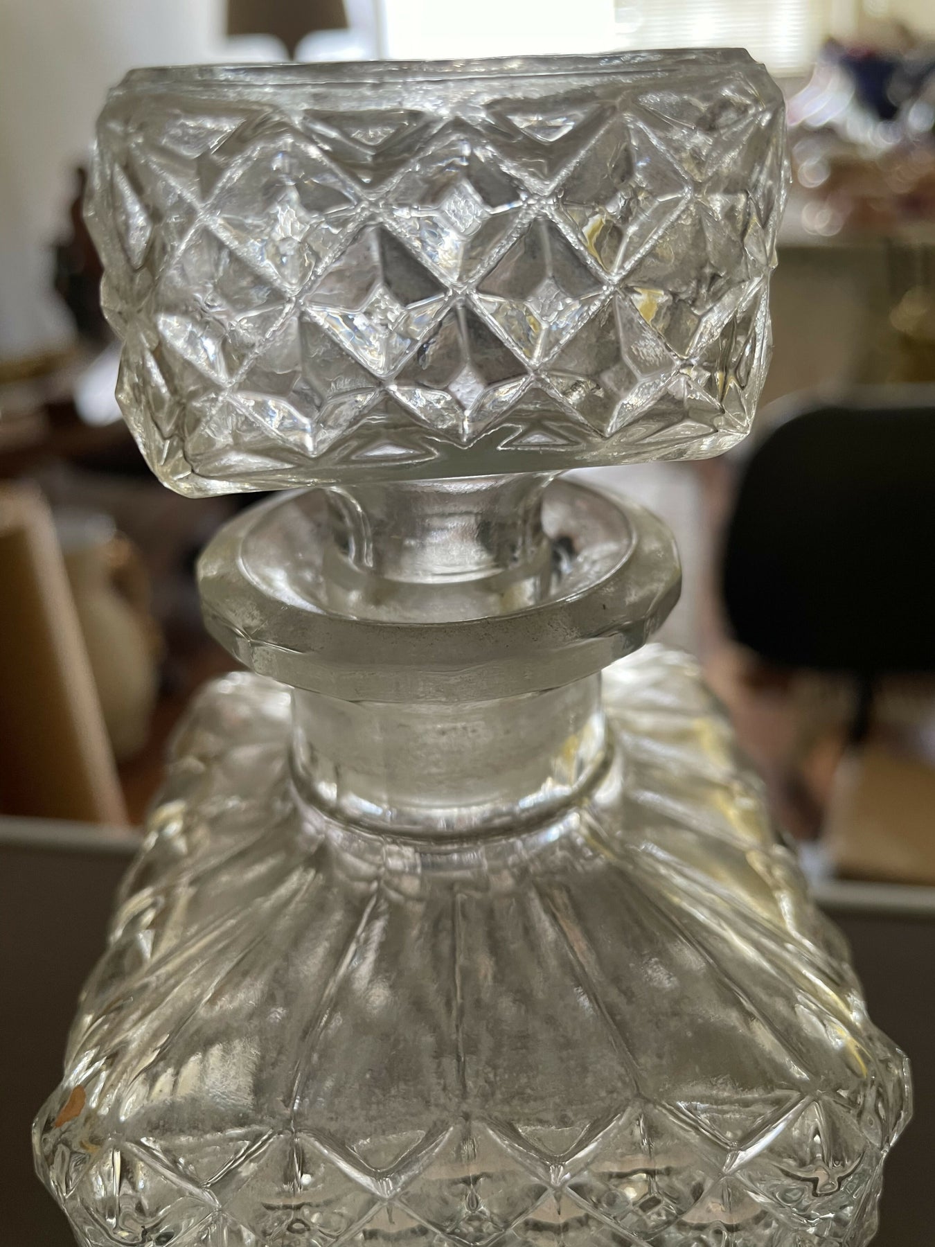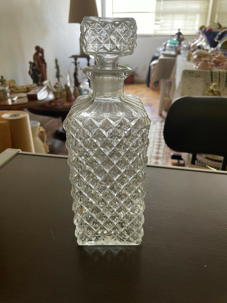 Linda  licoreira antiga de vidro, conhecida pela lapidação bico de jaca. É um item de decoração sofisticado e funcional, ideal para armazenar e servir licores ou outras bebidas. Apresenta um padrão geométrico de lapidação em forma de diamante que adiciona textura e brilho à peça. Inclui uma tampa de encaixe.