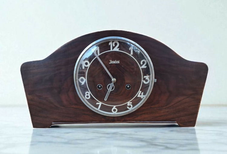 Clássico Relógio de mesa Junghans, fabricante alemã tradicional fundada em 1861. Funcionamento do mecanismo com duas cordas manuais: Uma para movimento do relógio e outra para sistema de batidas. Cordas cheias tem duração de uma semana de funcionamento. Sons "Bim-Bam", bate quantidade de horas cheias e meias-horas. Internamente, possui pêndulo, utilizado para controlar a liberação do "tic-tac" no mecanismo do relógio. A caixa é em Madeira Nogueira, também fabricada na Alemanha. Possui selos, números de série / lote gravados na caixa. Possui estilo Art Déco e foi fabricado no primeiro trimestre de 1938. Recentemente foi feito limpeza e lubrificação no mecanismo, funcionando perfeitamente e com poucos sinais de uso. Envio para qualquer lugar via transportadora. (17) 99614-4336 / José