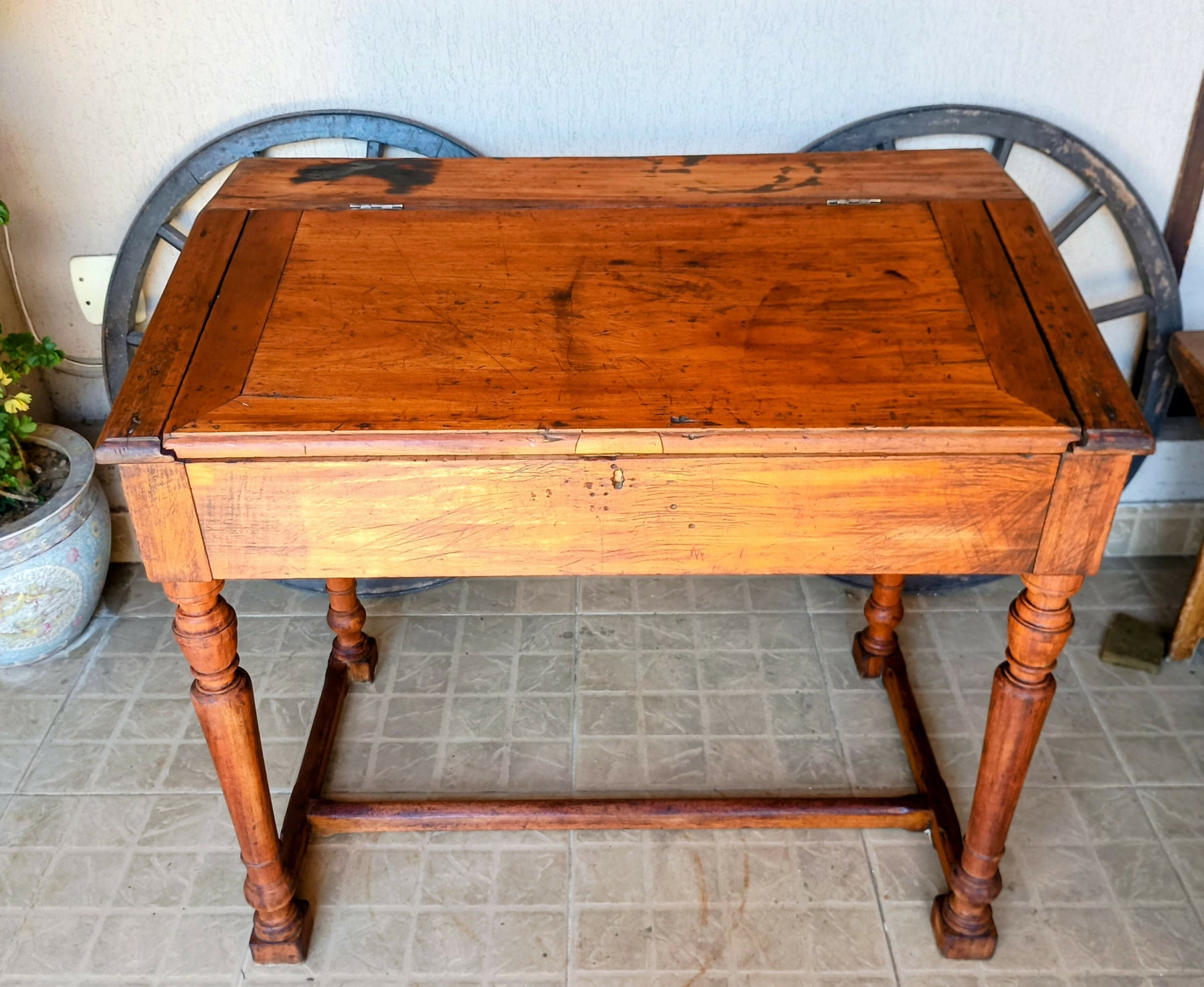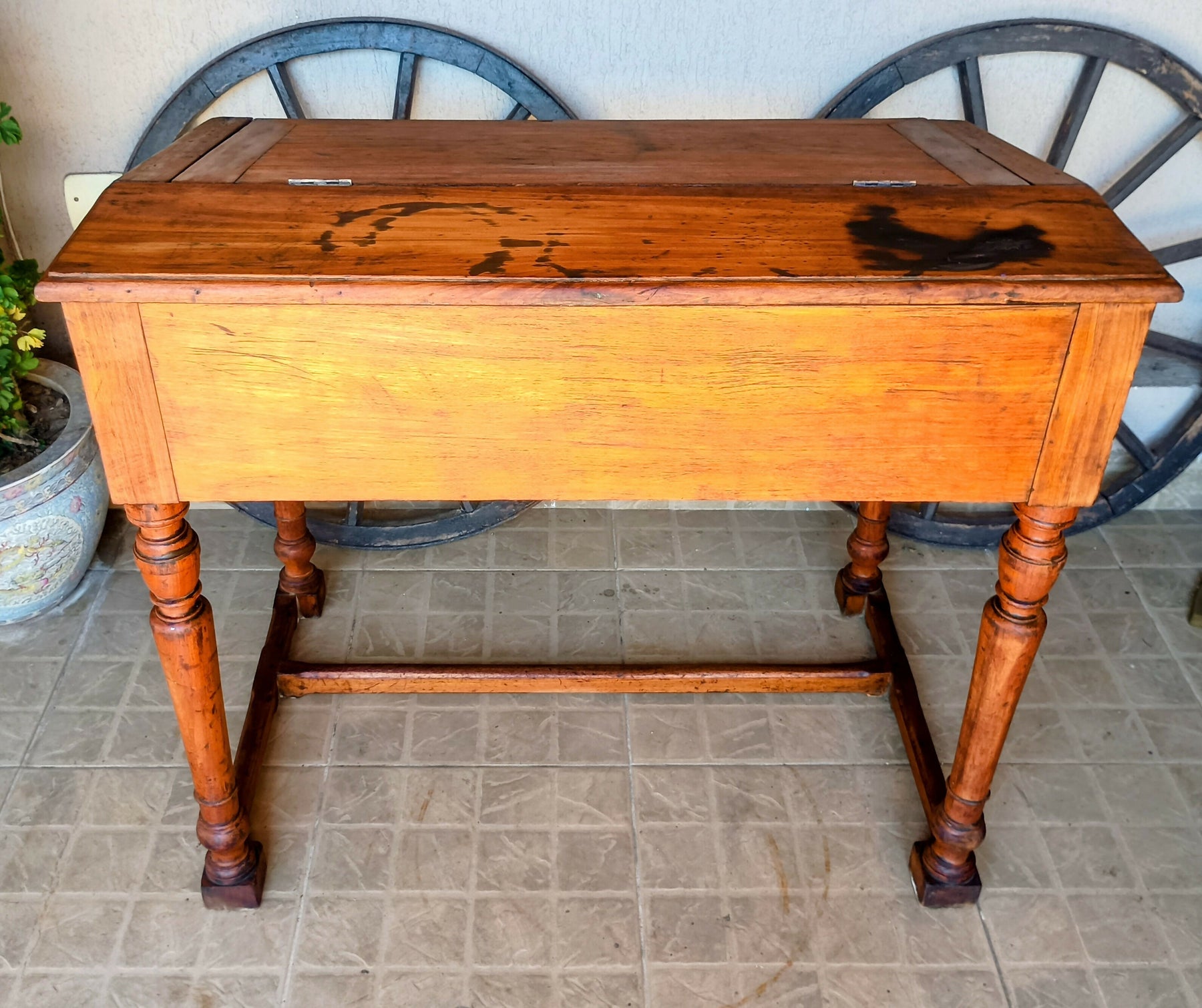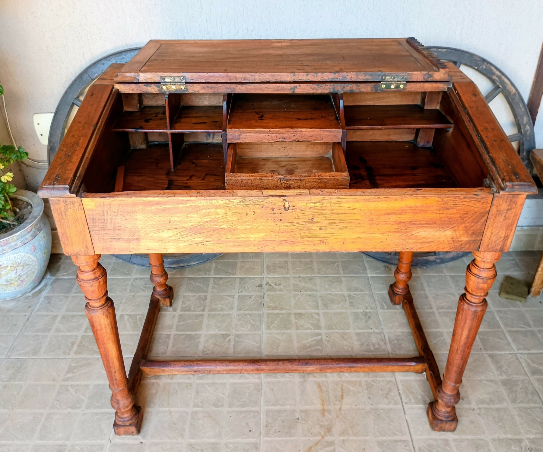 Autêntica escrivaninha antiga em madeira maciça, exemplar raro de mobiliário funcional do período colonial tardio / imperial brasileiro. Peça de forte presença histórica, originalmente utilizada para escrita, organização de documentos e correspondência.