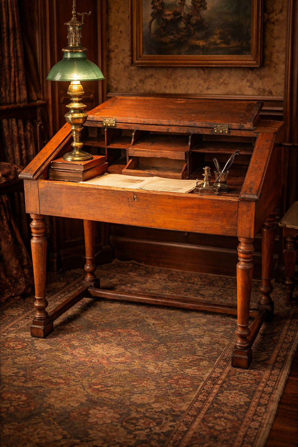 O móvel apresenta tampo basculante, que ao ser aberto revela um elegante e funcional conjunto interno de nichos organizadores e gaveta central, característica típica das escrivaninhas de contador e mesas de escrita do período.