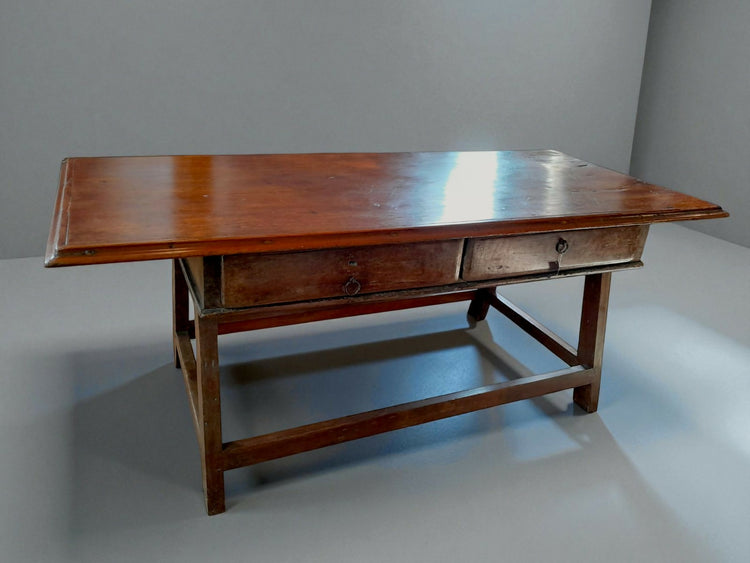 Mesa antiga em madeira nobre com base em estilo cavalete, peça sólida e de construção tradicional. Tampo amplo, com acabamento preservado e sinais naturais do tempo que valorizam o caráter histórico do móvel. Possui estrutura reforçada e duas gavetas frontais funcionais, ideais para guardar utensílios ou itens de apoio. O design simples e elegante combina rusticidade e autenticidade, tornando a mesa adequada para salas de jantar, áreas gourmet, escritórios ou composições decorativas com mobiliário vintage. Estado geral muito bom, mantendo sua originalidade.
