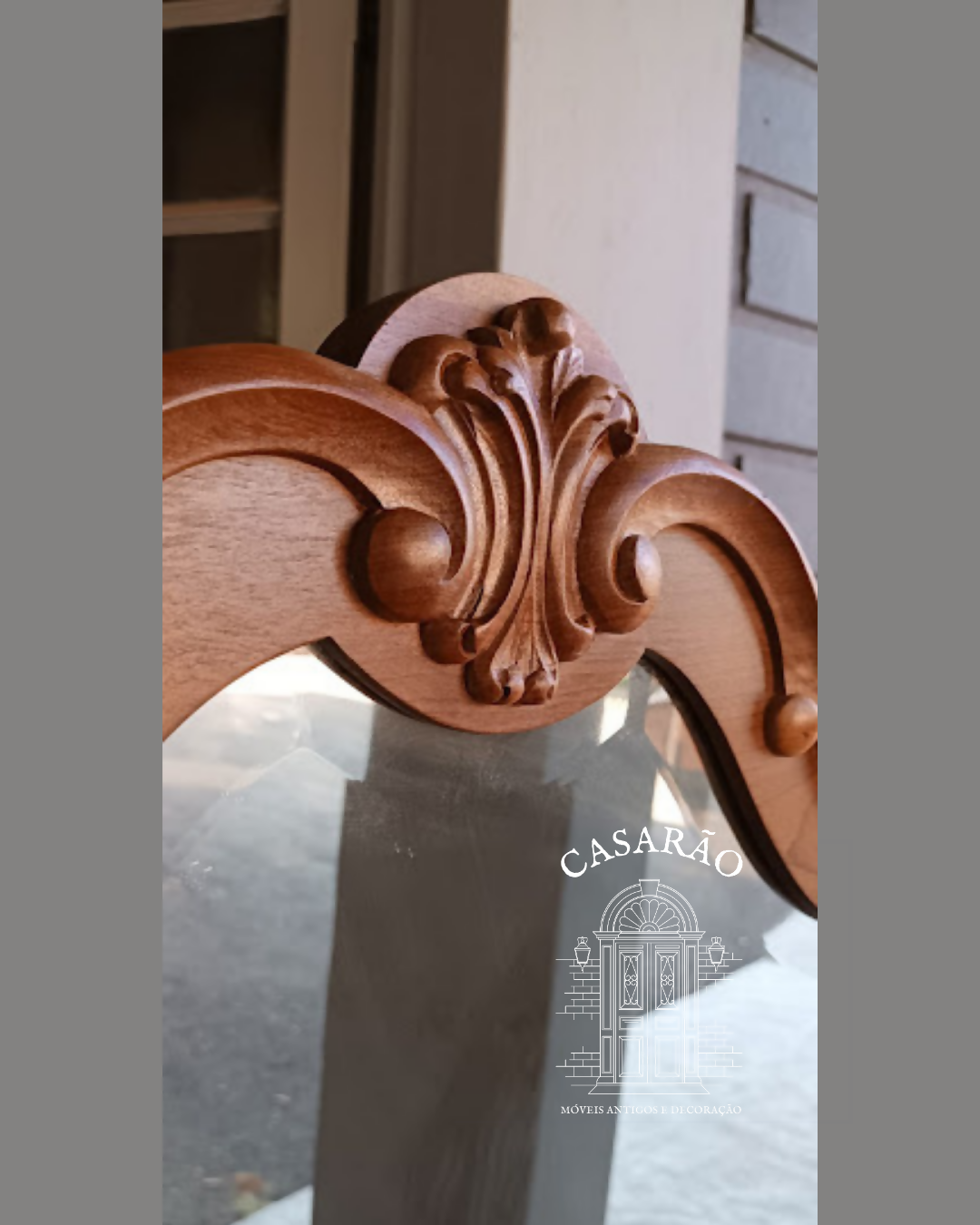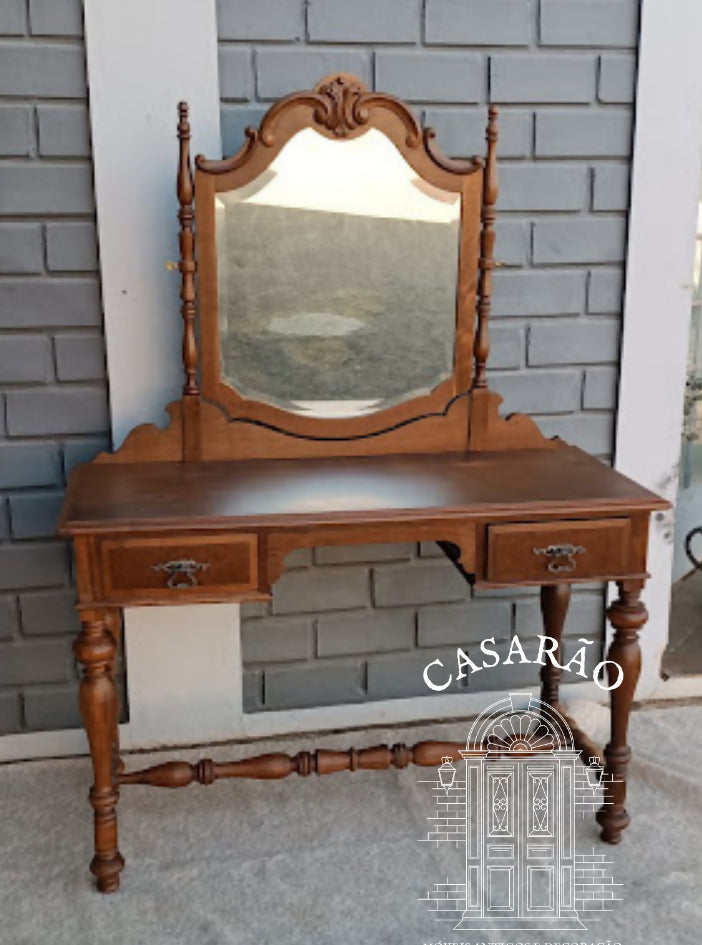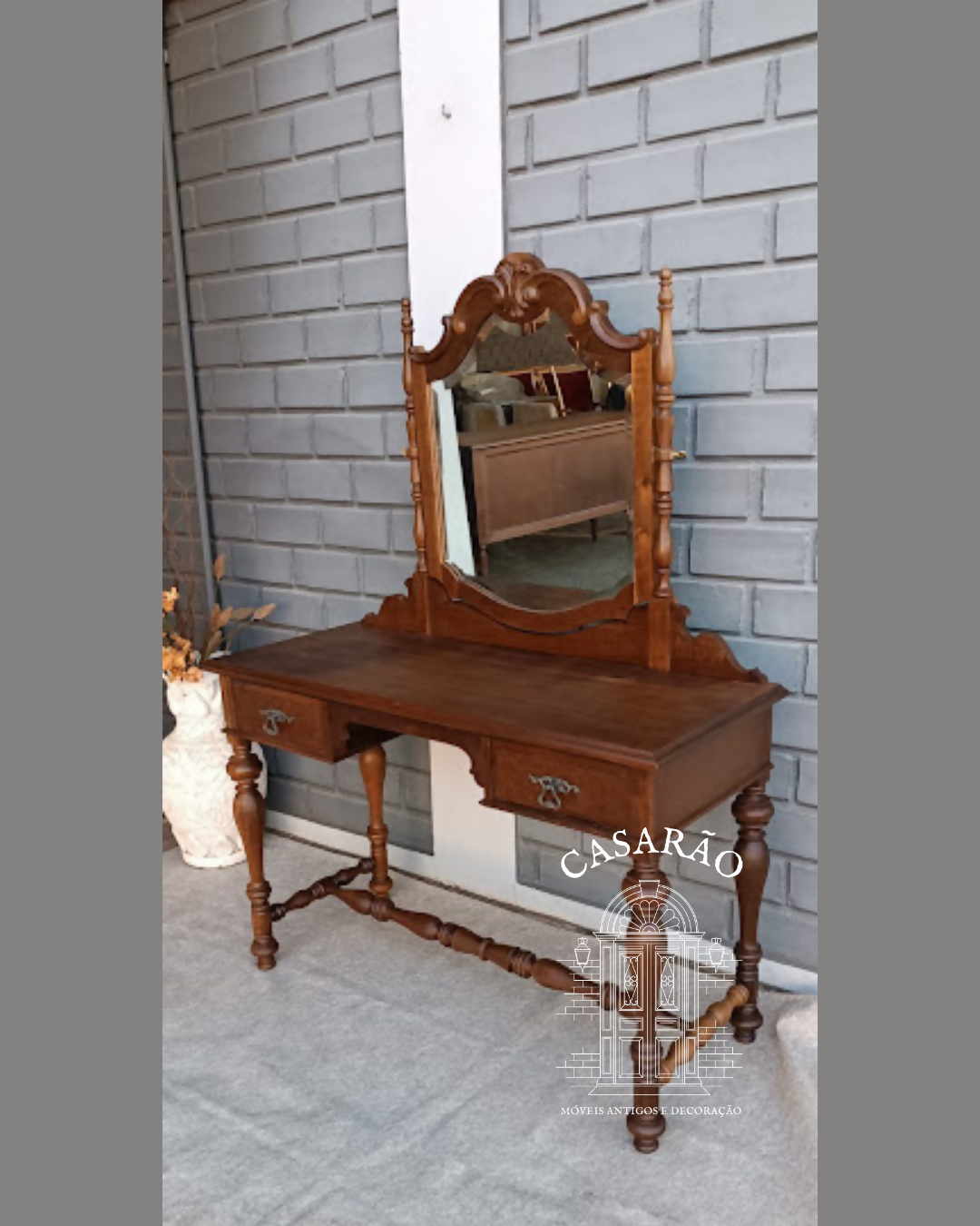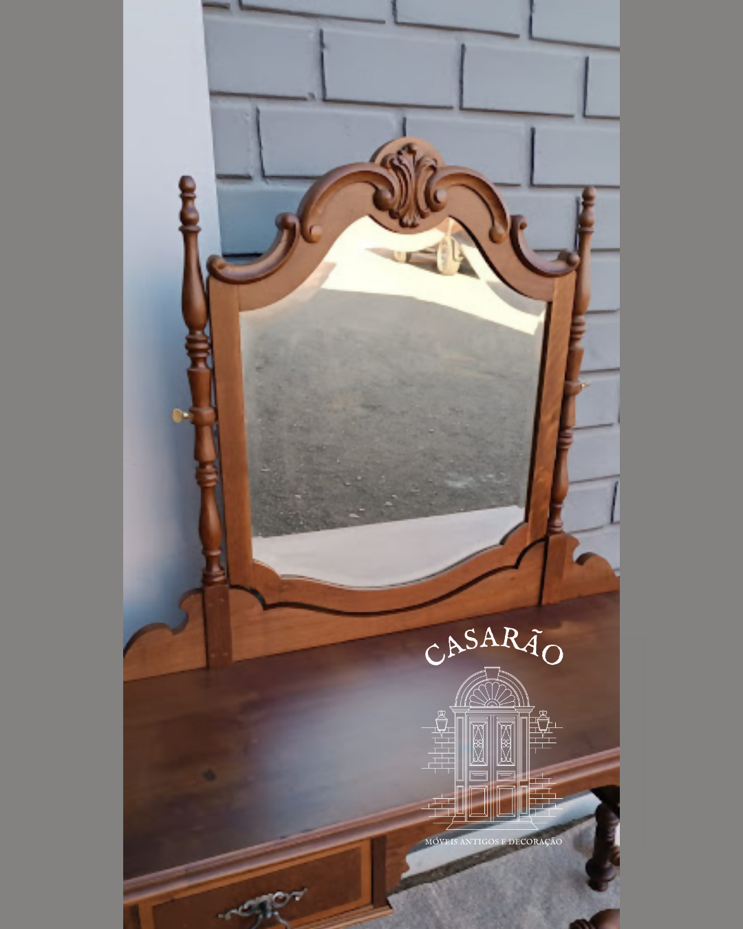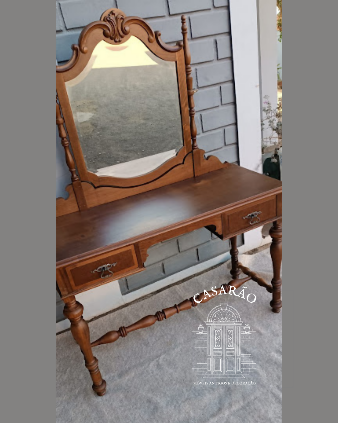 Penteadeira madeira imbuia, estilo colonial, espelho bisotê, 2 gavetas, restaurada.