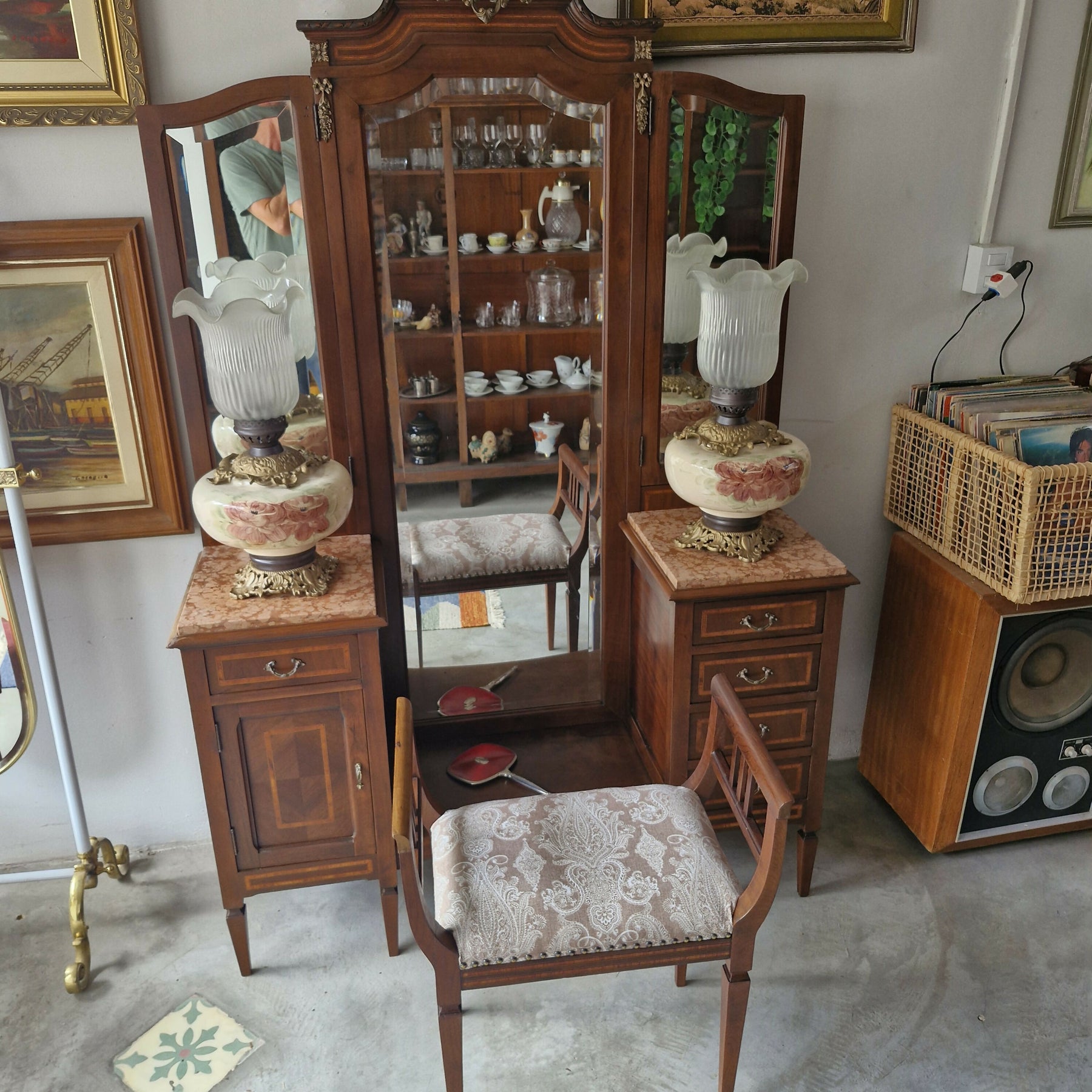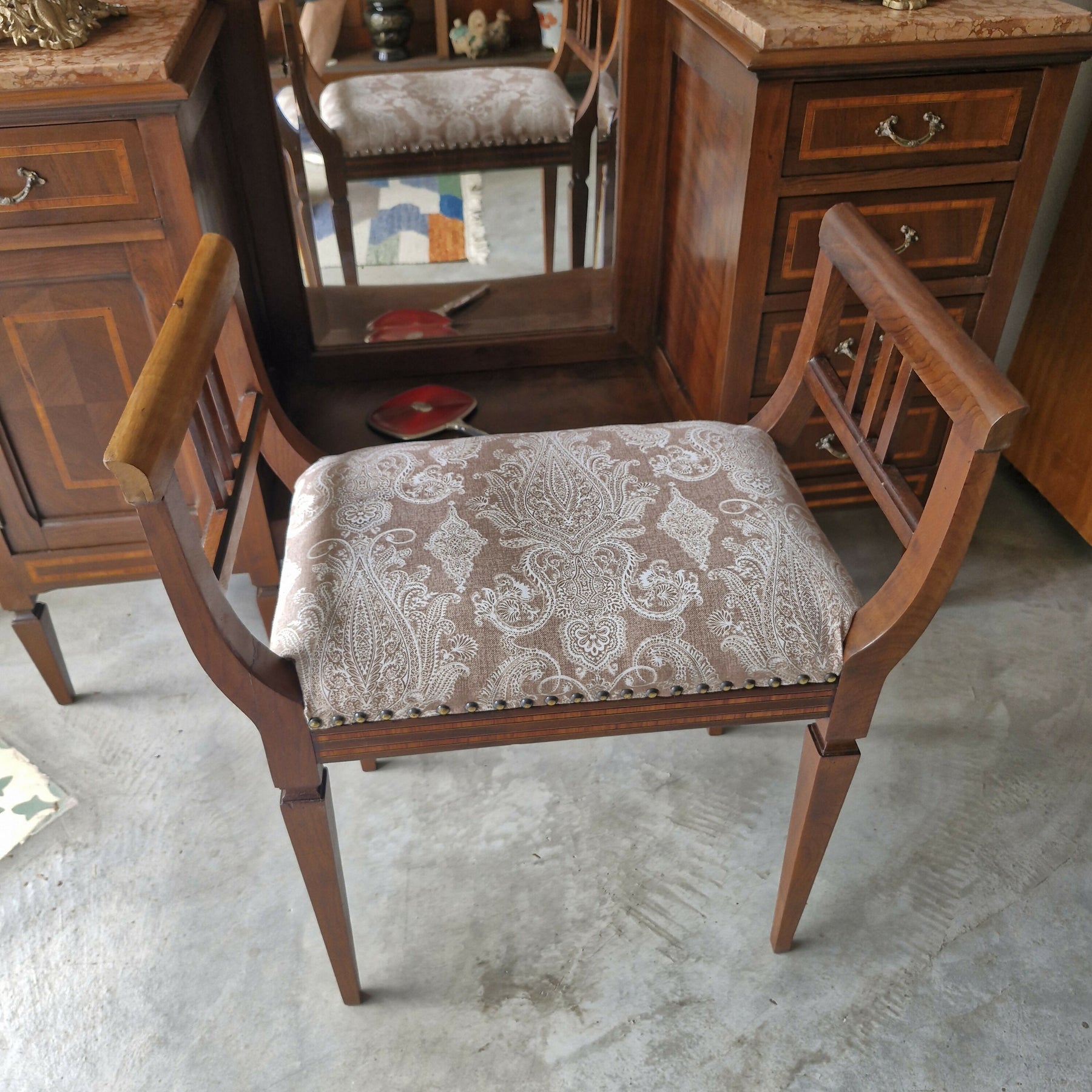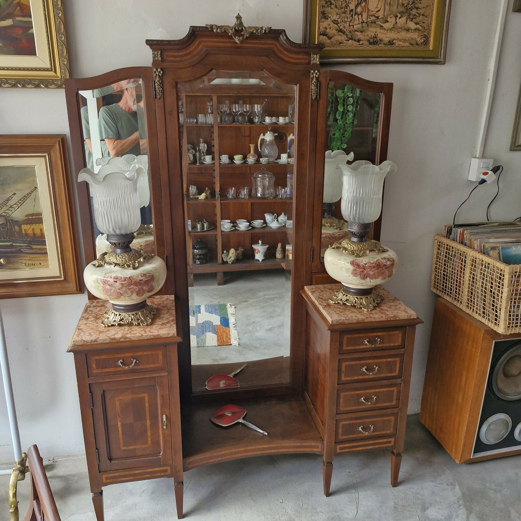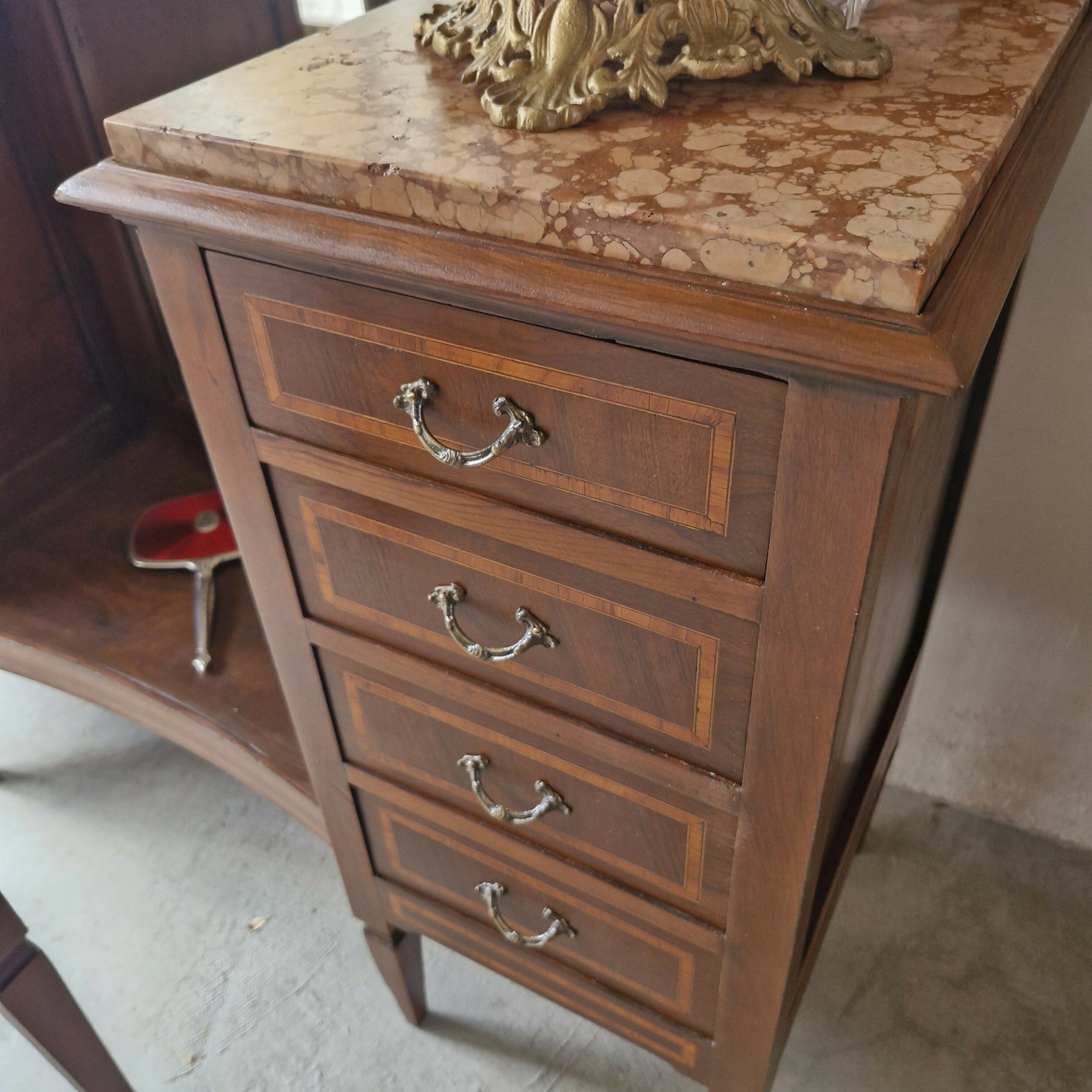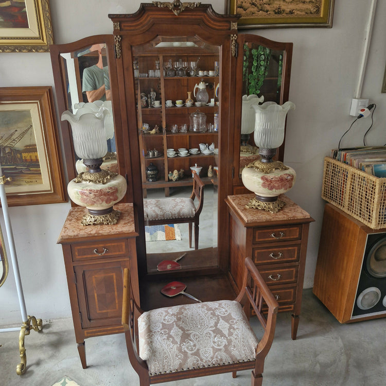 Maravilhosa Penteadeira Pechinche com 3 espelhos bisotados, apliques de bronze,  e rica marchetaria,  contendo uma porta e 5 gavetas, tampos com mármore rosa, peça restaurada em perfeito estado para pronta entrega, acompanha linda banqueta Marchetada.