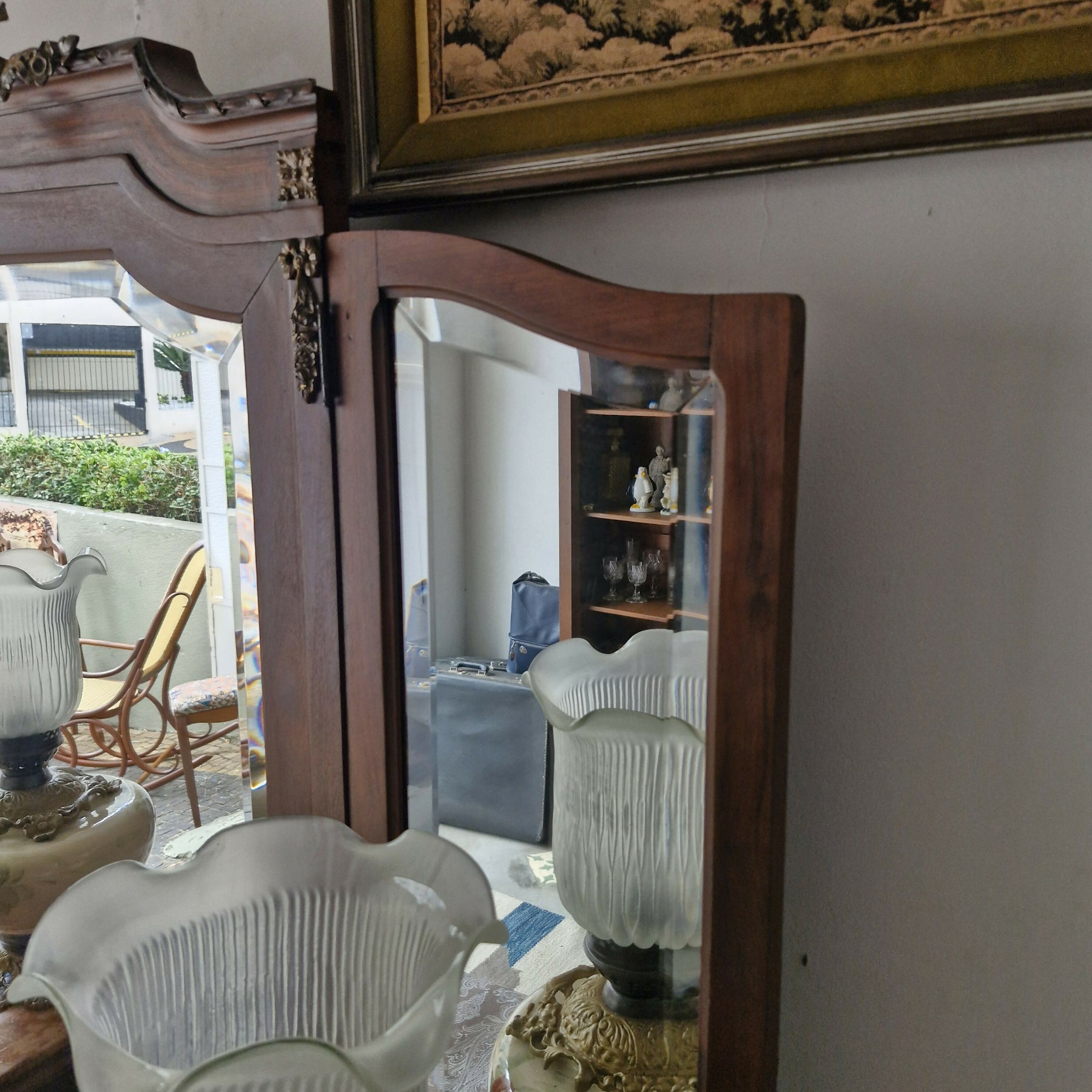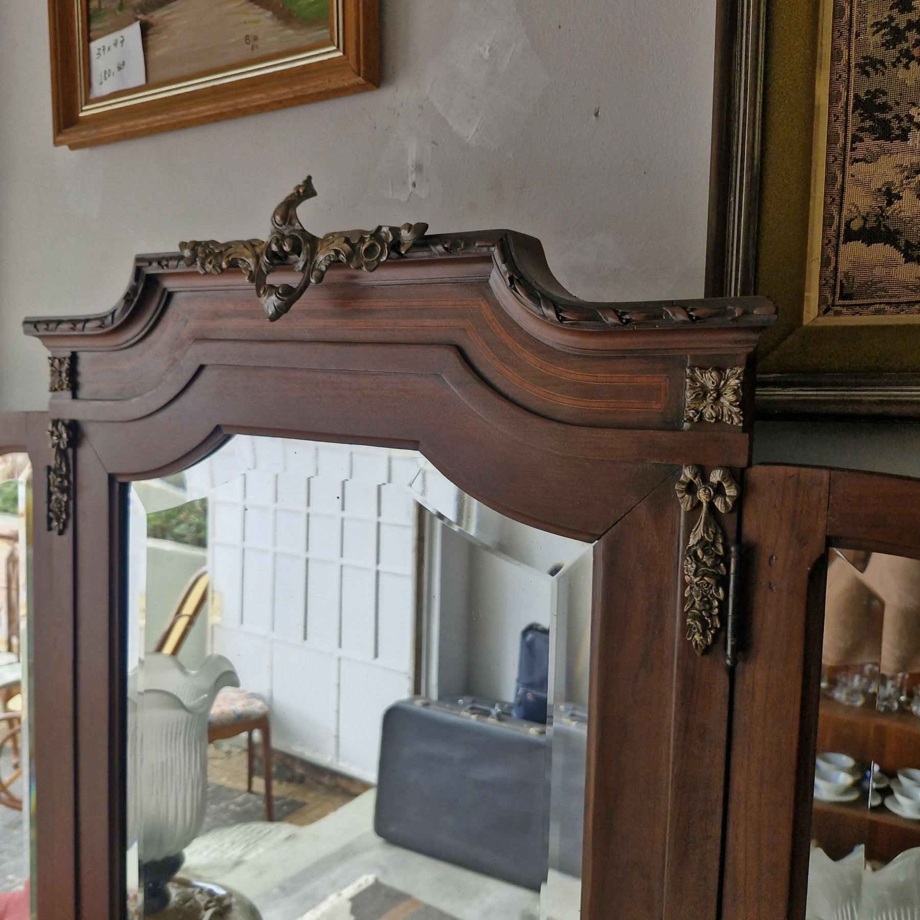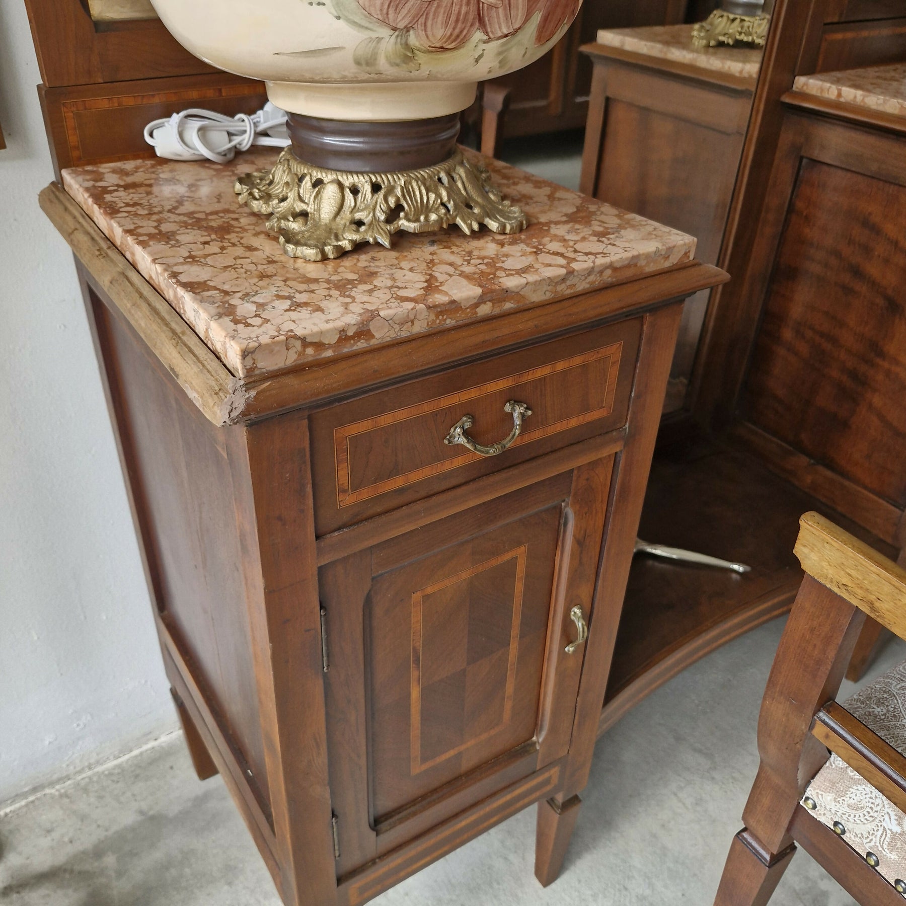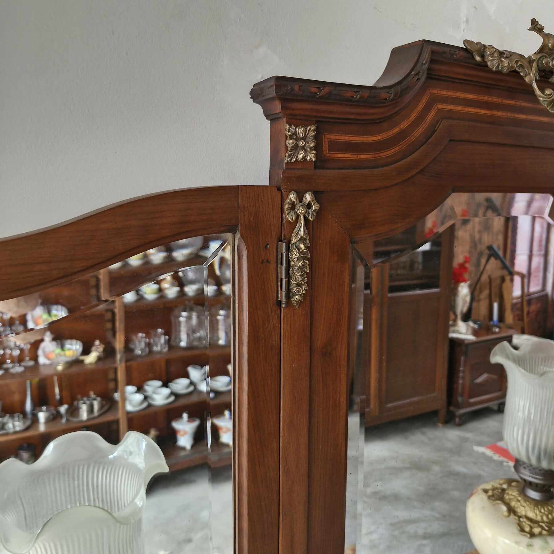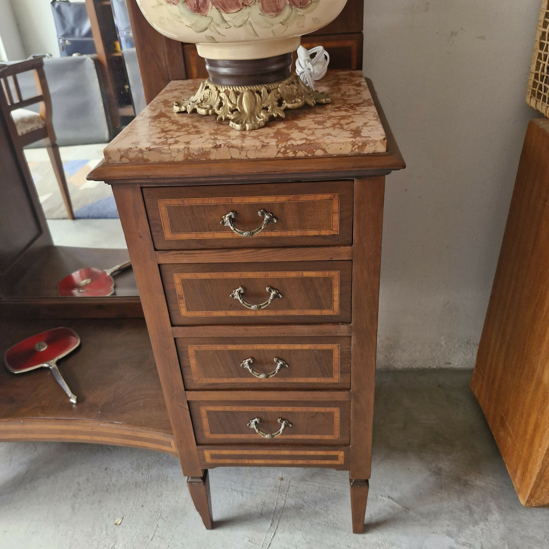 Maravilhosa Penteadeira Pechinche com 3 espelhos bisotados, apliques de bronze,  e rica marchetaria,  contendo uma porta e 5 gavetas, tampos com mármore rosa, peça restaurada em perfeito estado para pronta entrega, acompanha linda banqueta Marchetada.