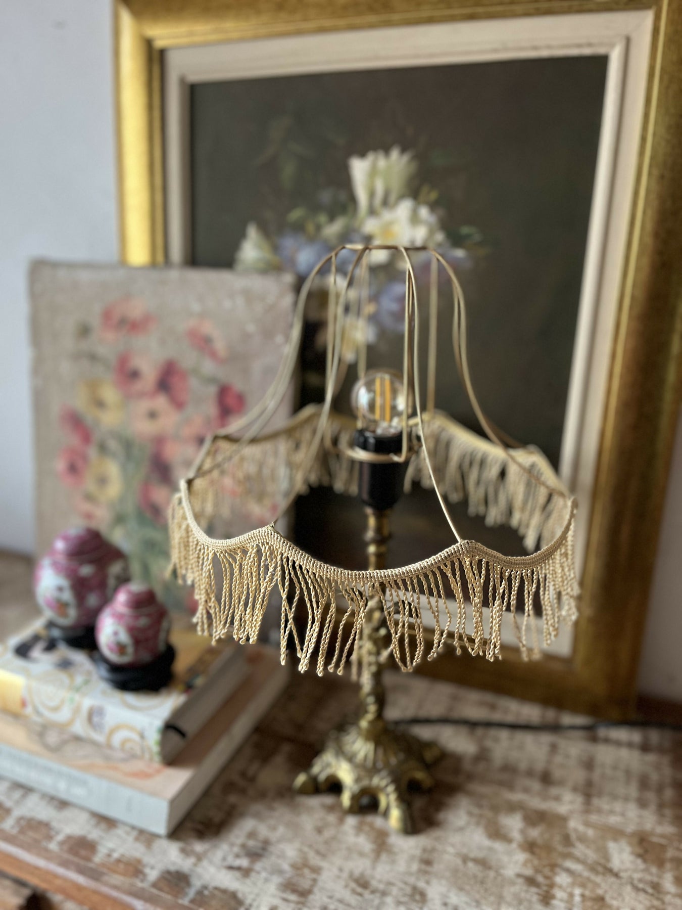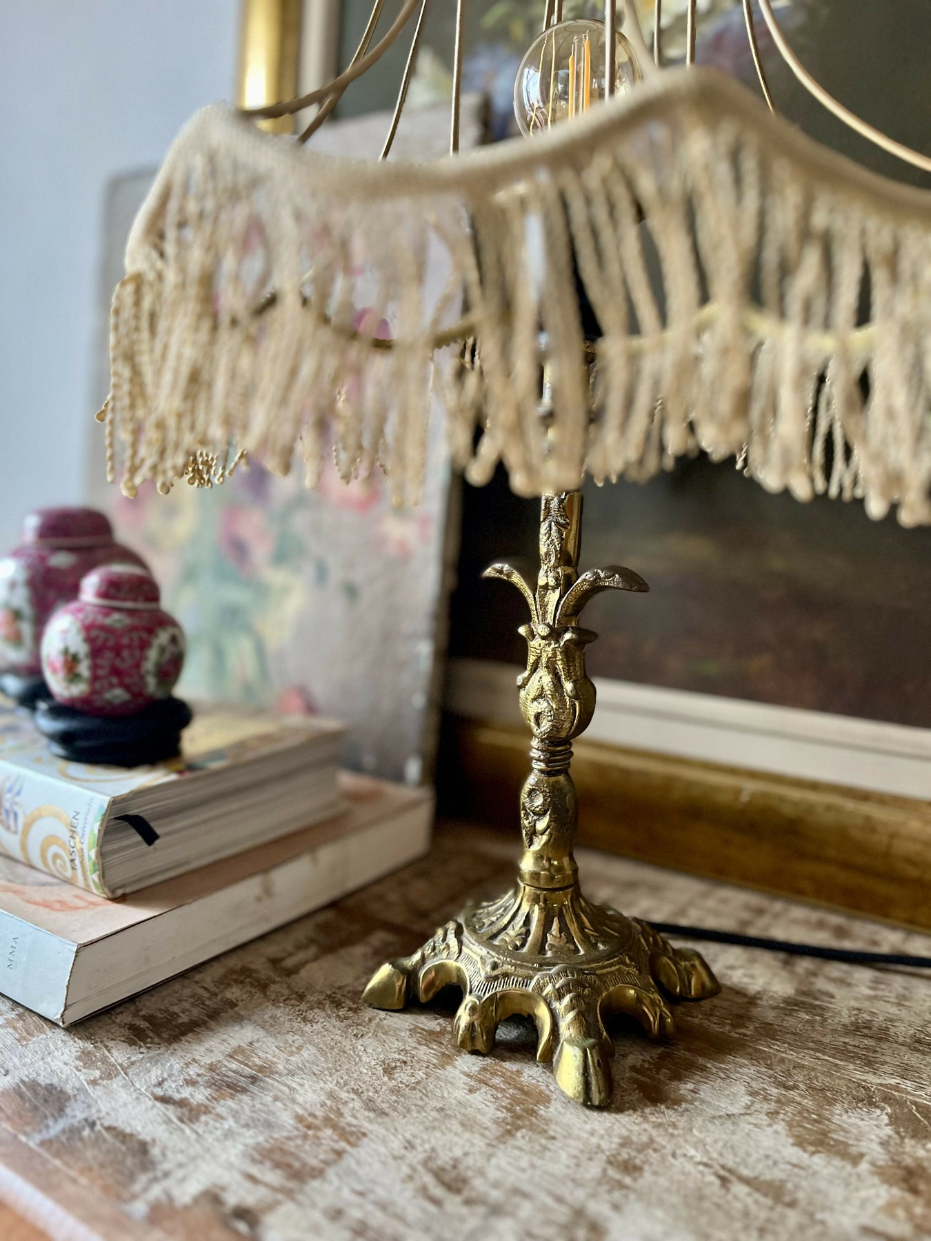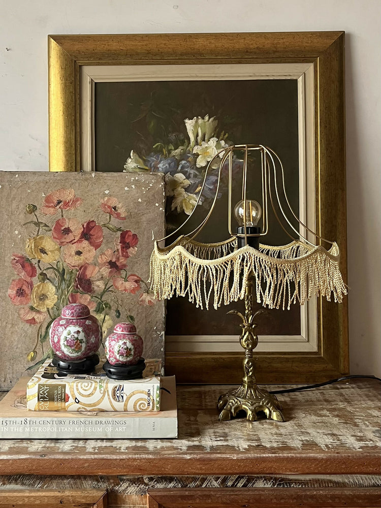 Esta base de ferro fundido com um bonito banho de latão - já um pouco desgastado e muito charmoso - ficou mais moderna com uma cúpula vazada de franjinhas. Criativo, elegante, diferente!