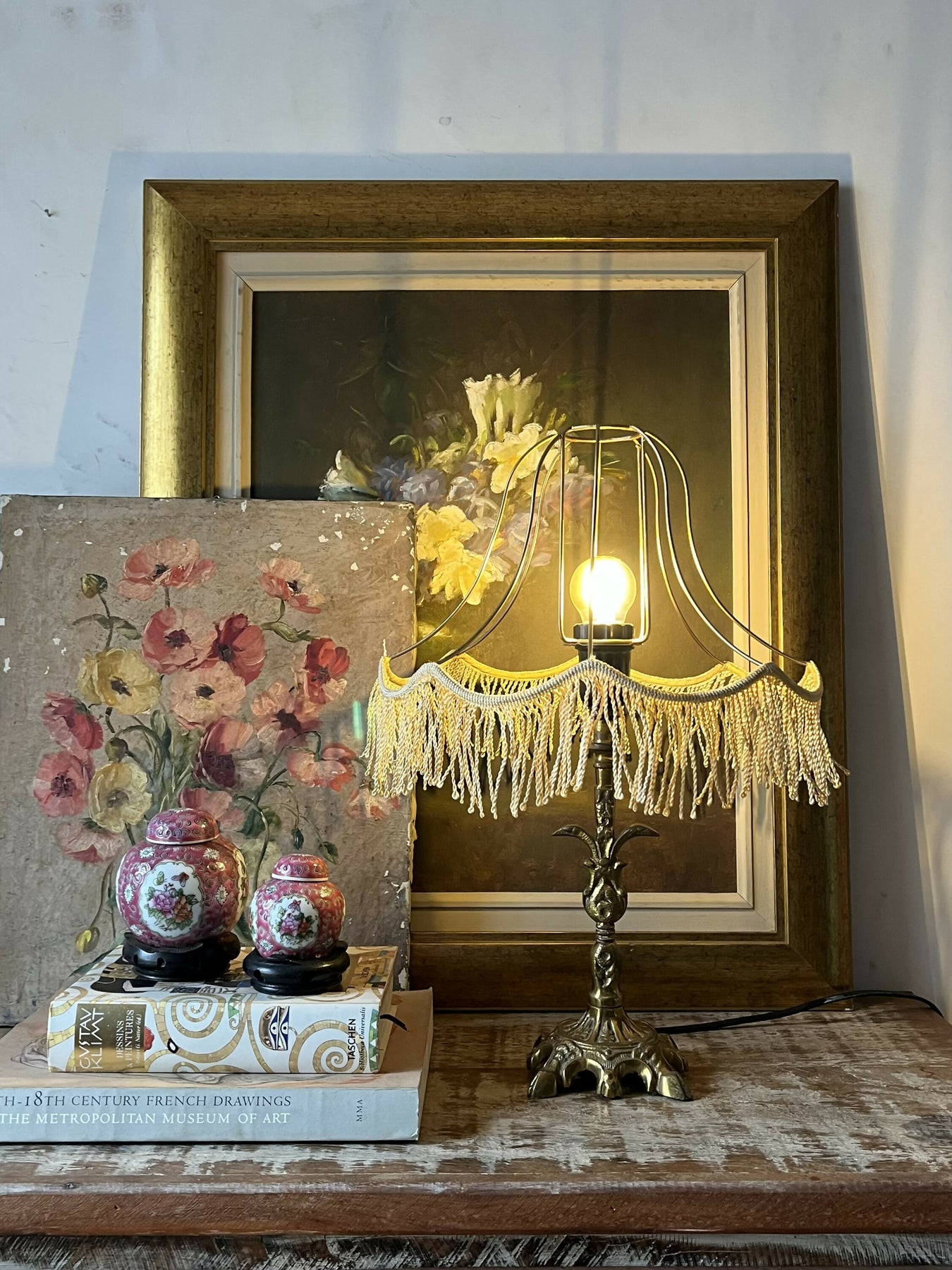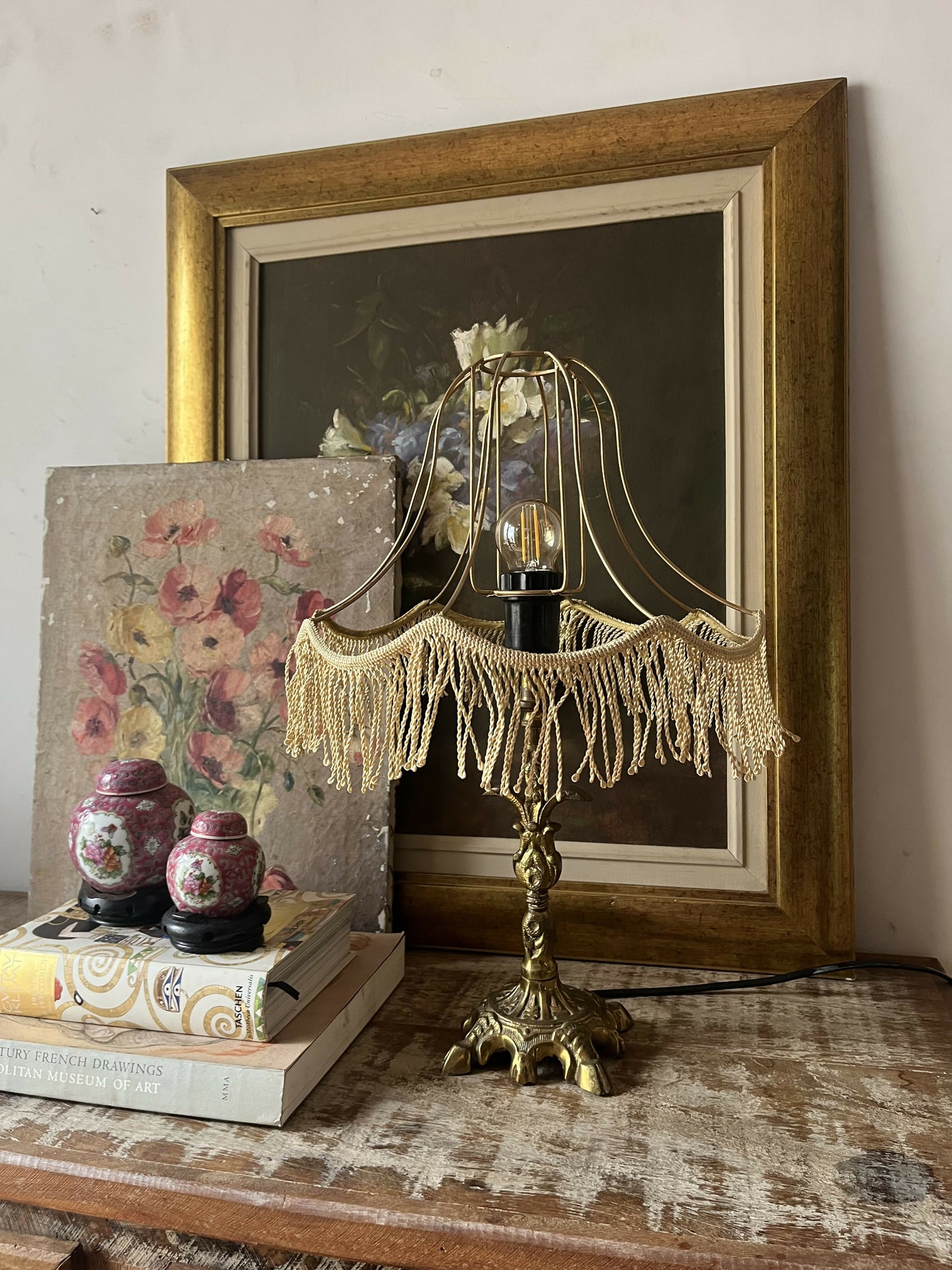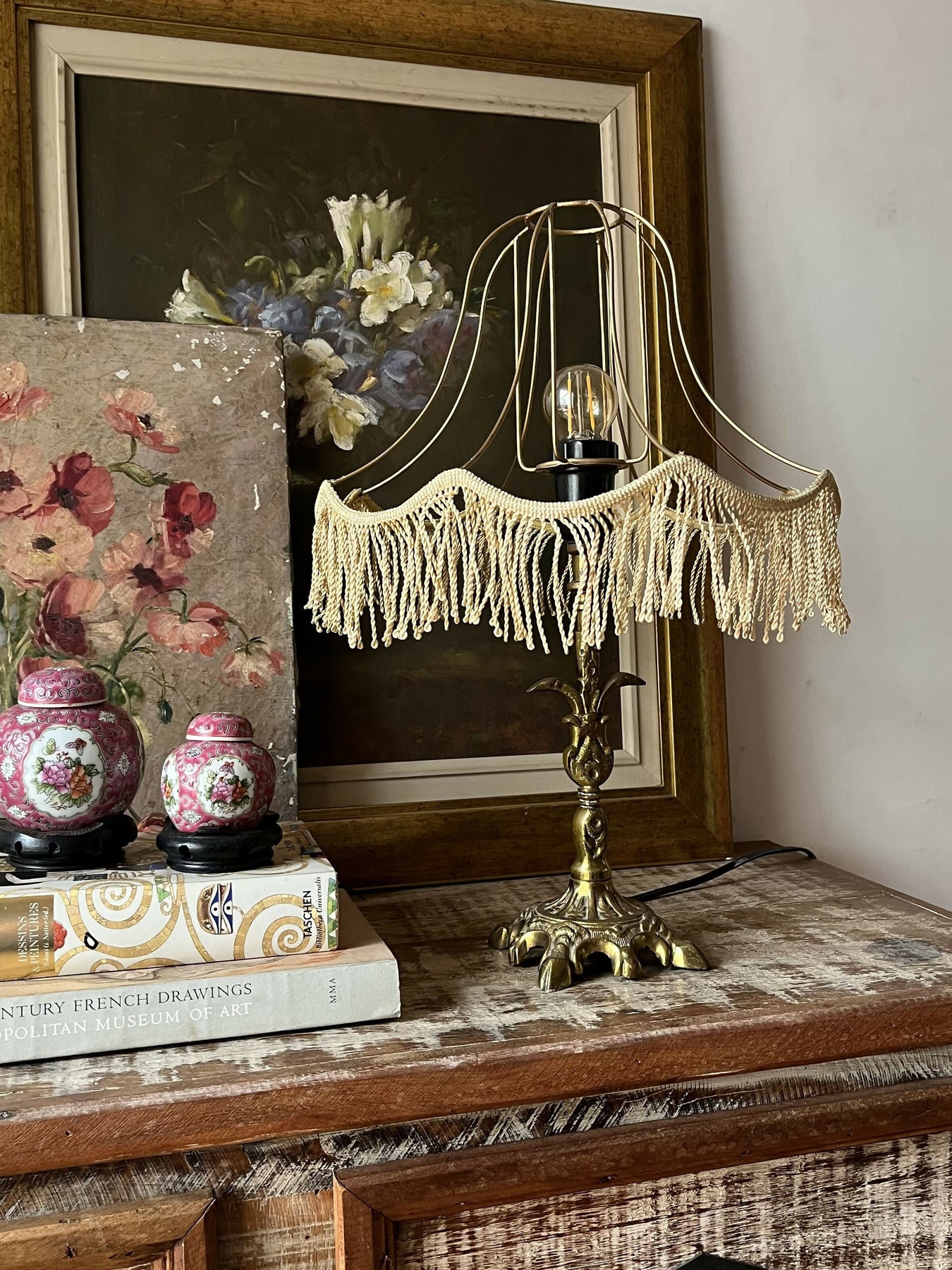 Esta base de ferro fundido com um bonito banho de latão - já um pouco desgastado e muito charmoso - ficou mais moderna com uma cúpula vazada de franjinhas. Criativo, elegante, diferente!