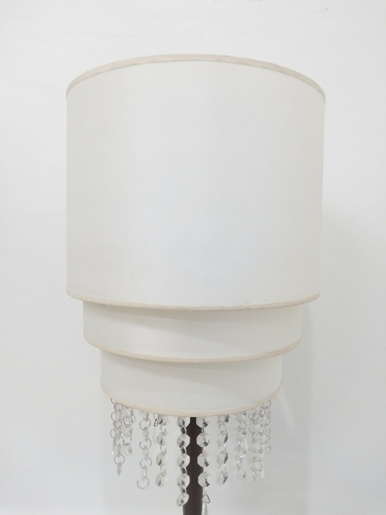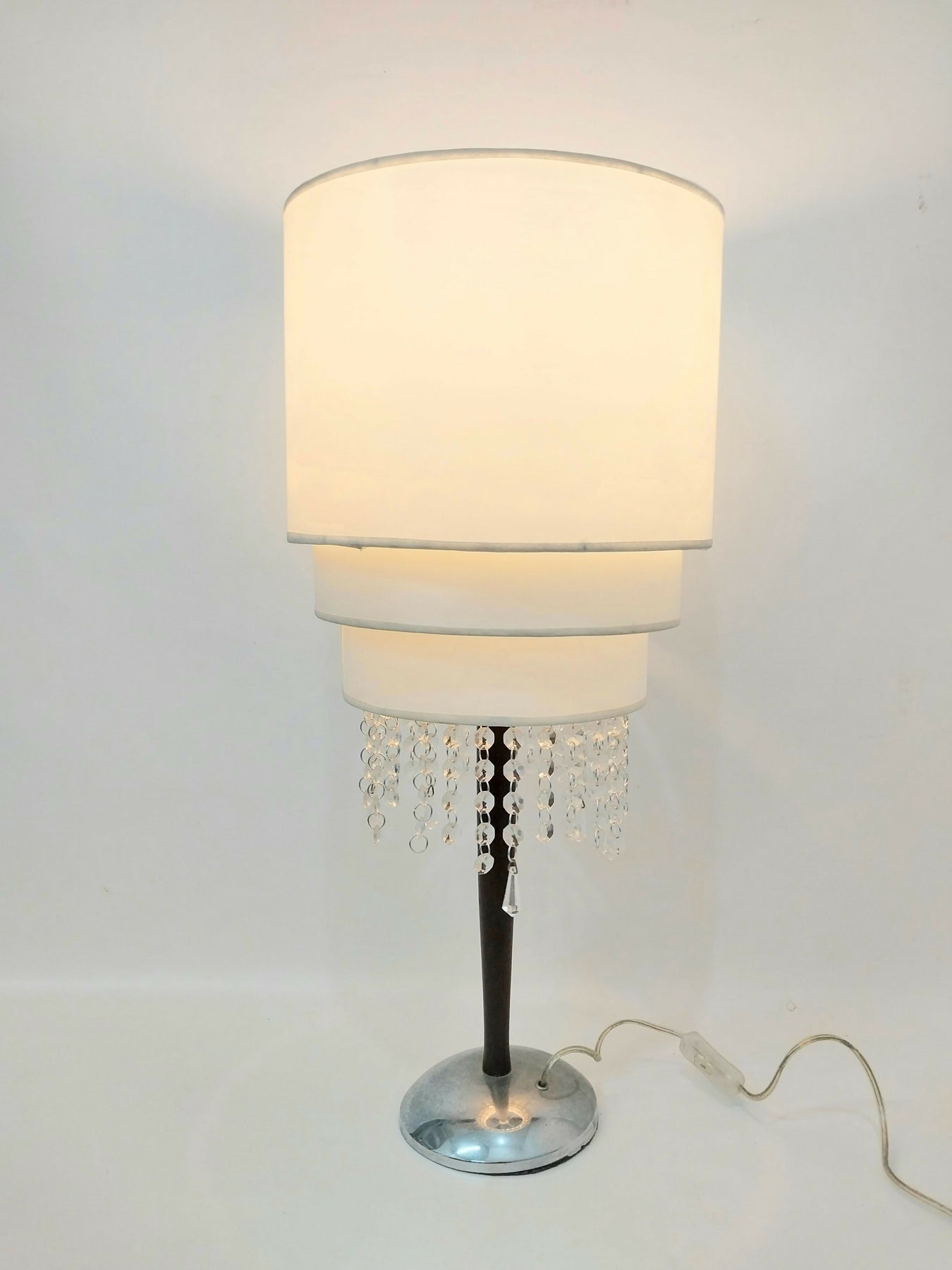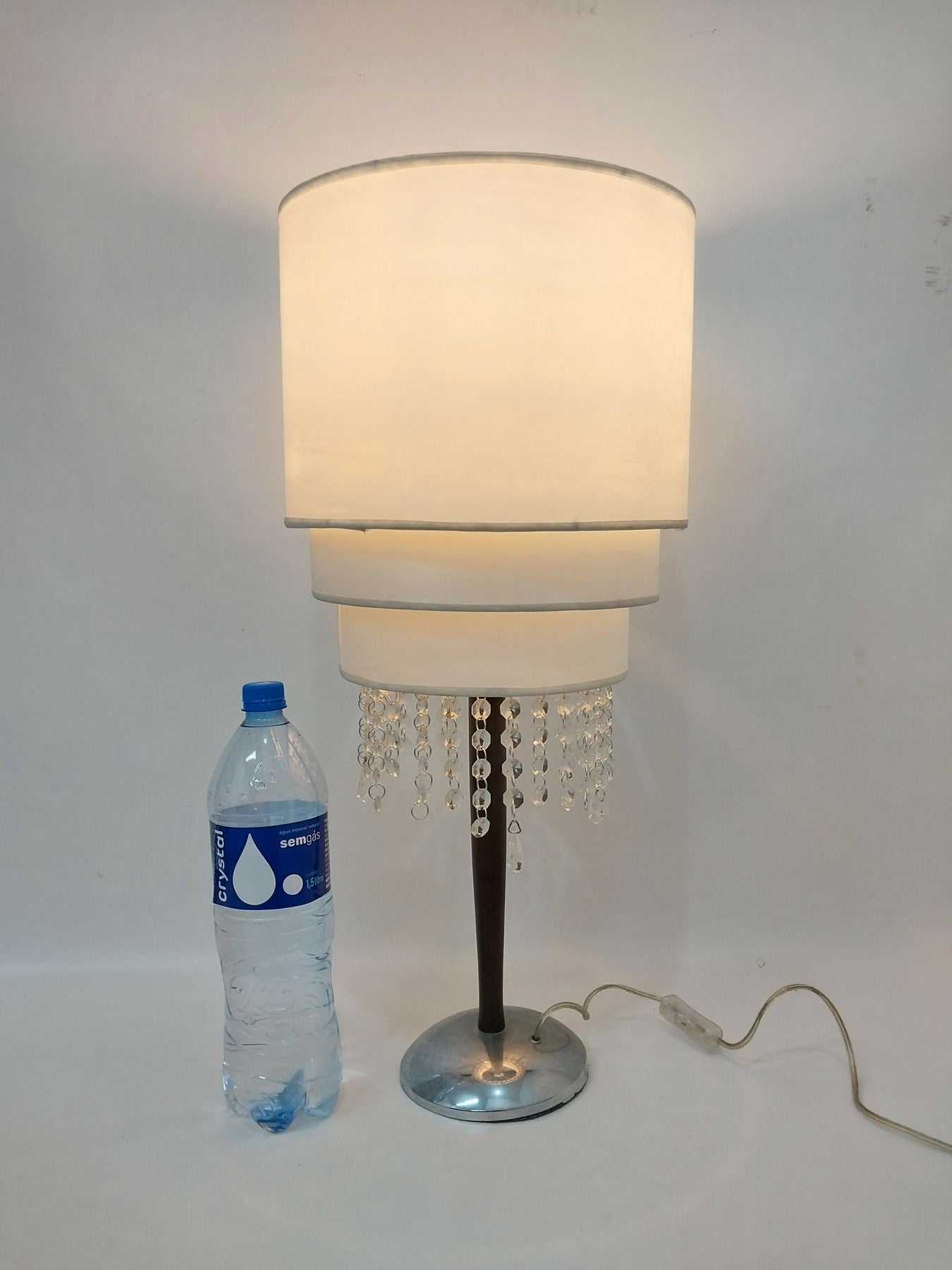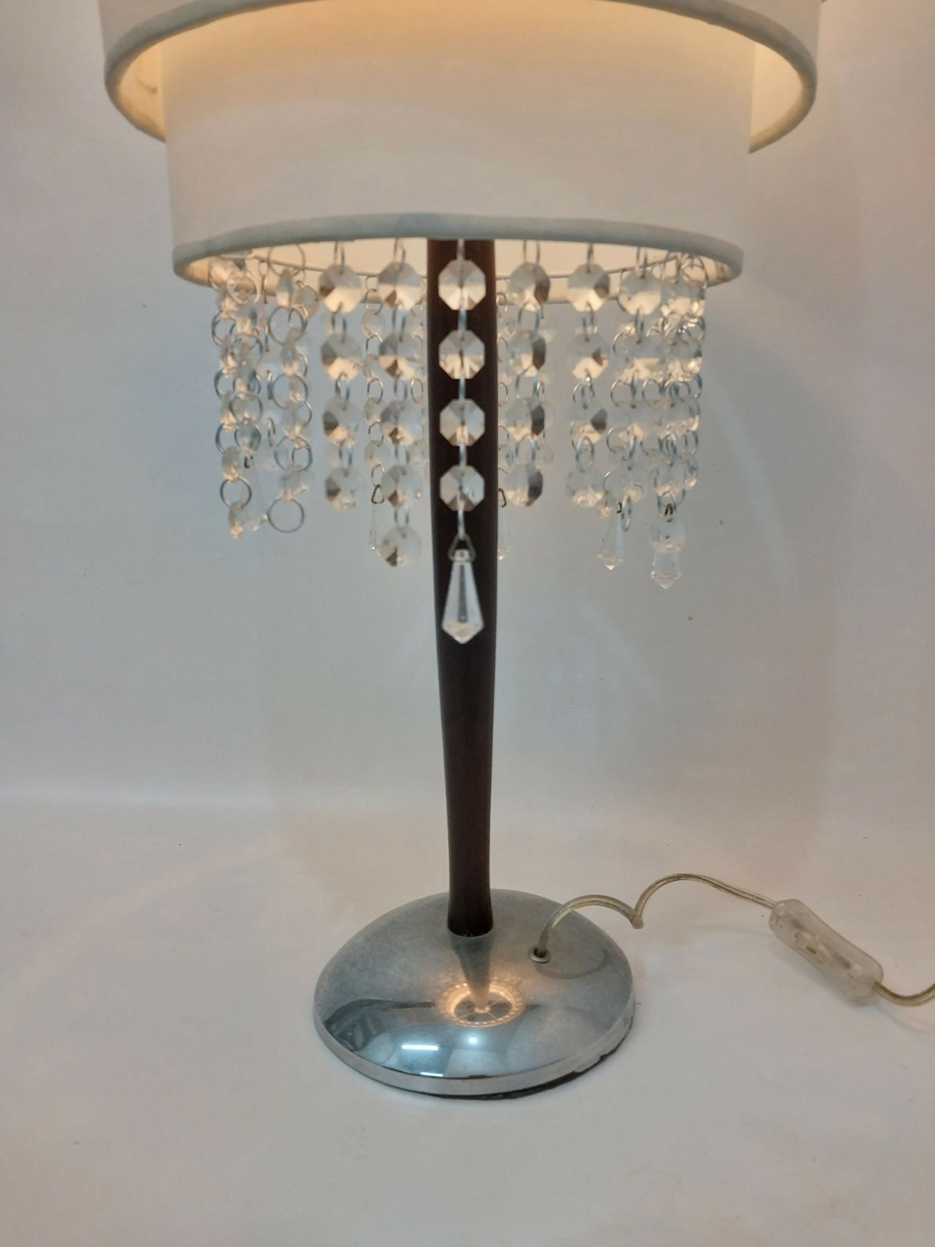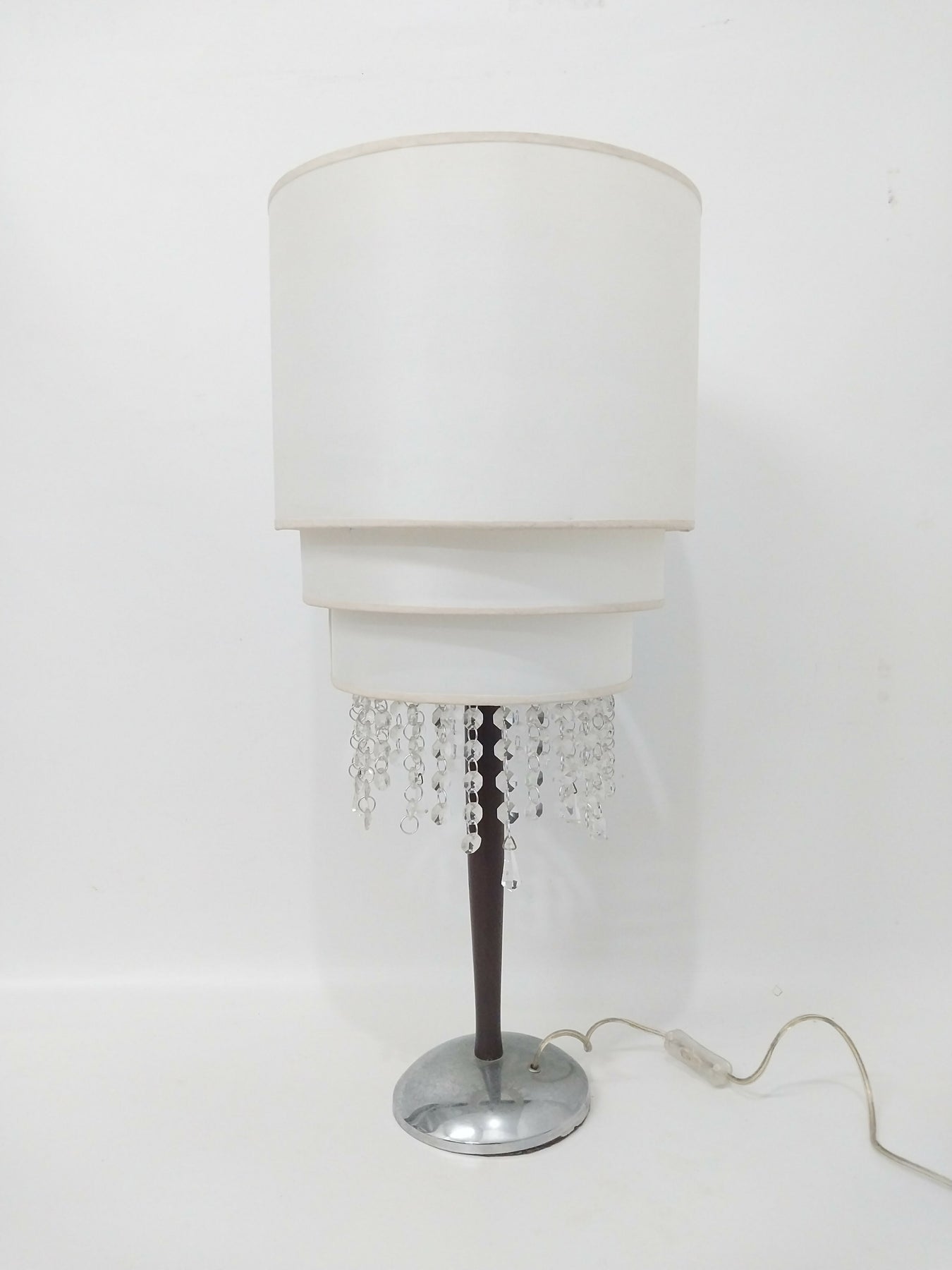 Abajur vintage design com base em metal cromado e corpo em madeira, cúpula trila adornada com pendentes, em muito bom estado. 65x30 cm.