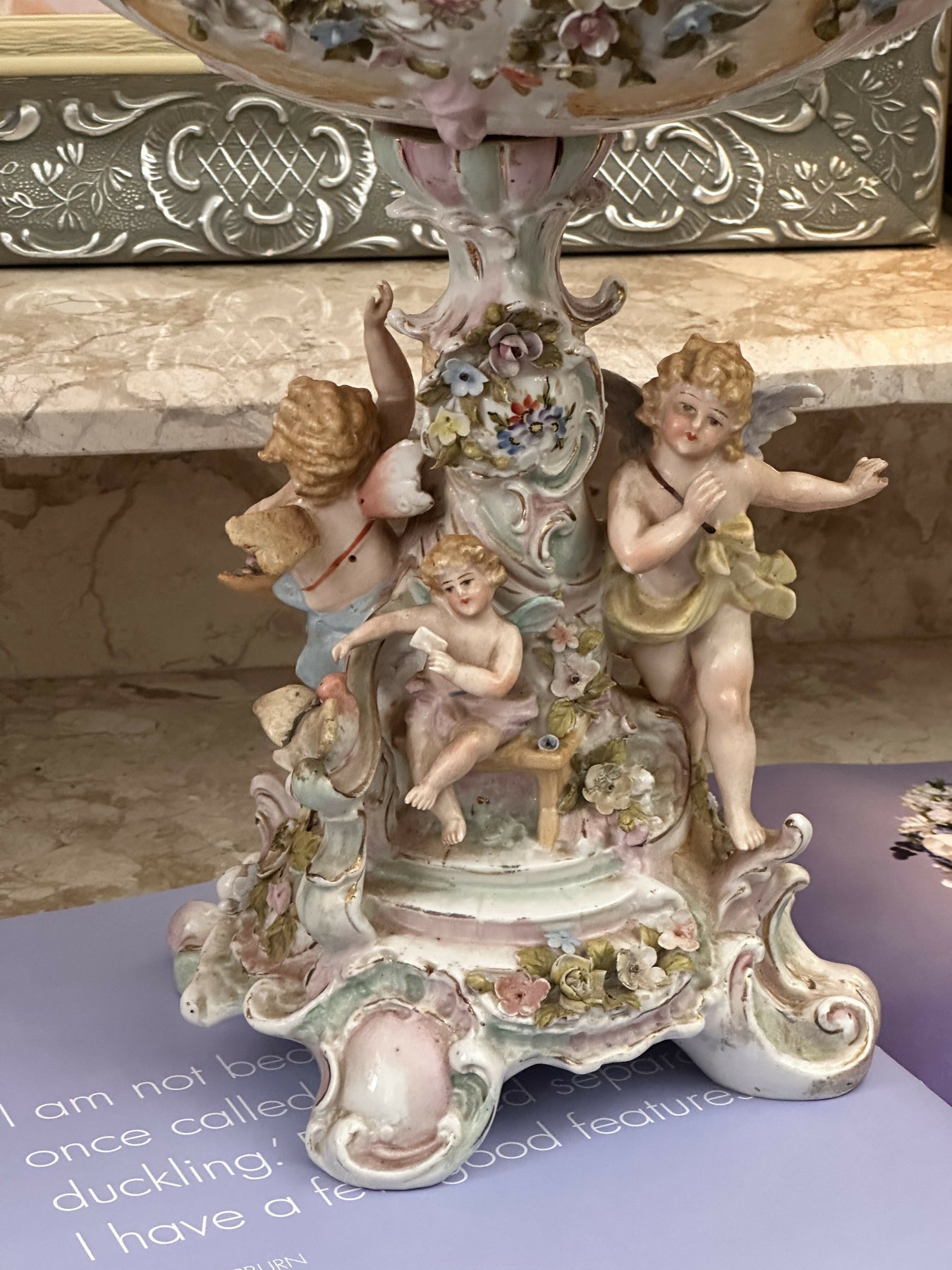 Toda ladeada por figuras de querubins (putti) esculpidos, uma marca registrada do design barroco e vitoriano tardio.