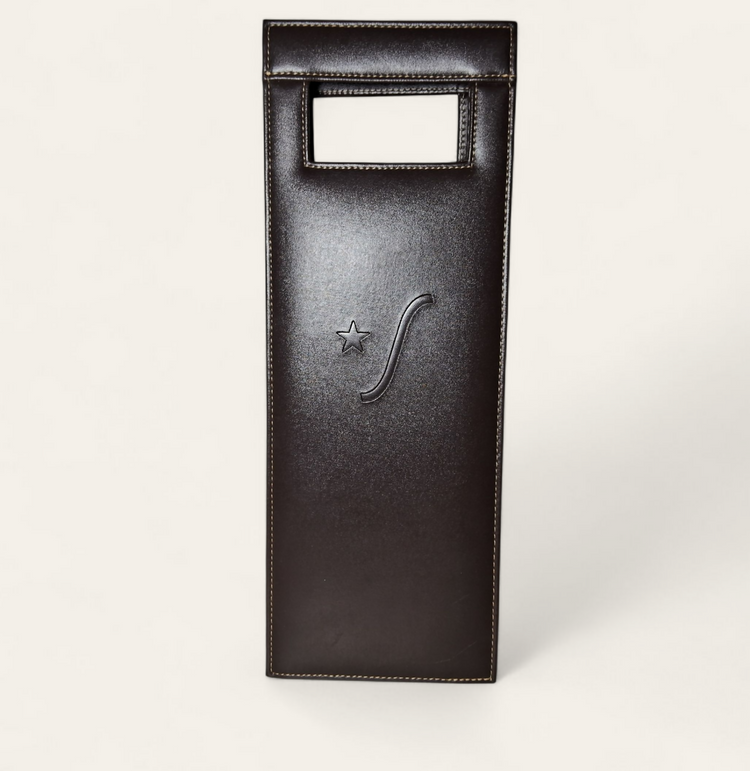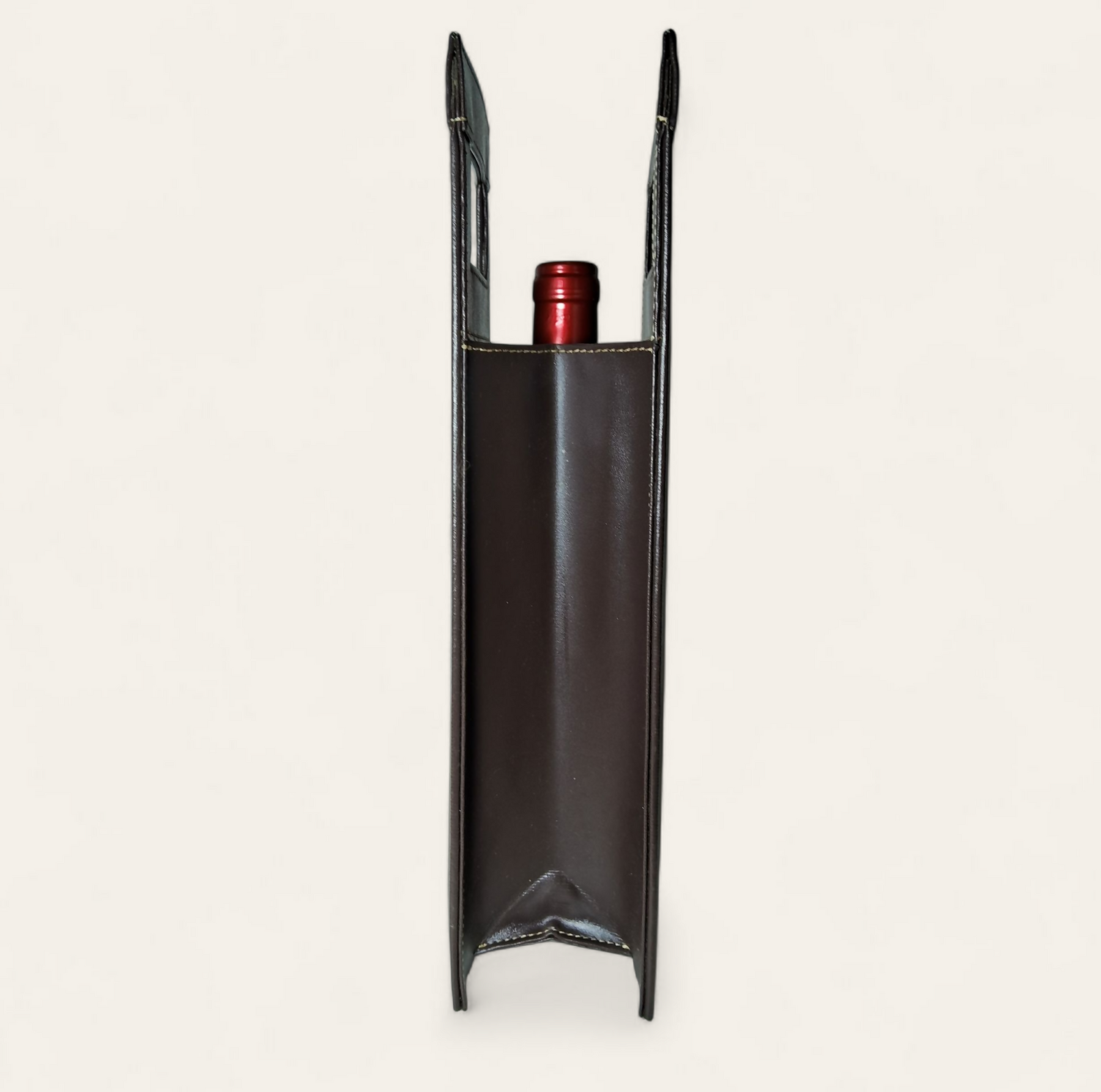 Bolsa para transporte de garrafa de vinho em couro marron, costuras na borda e acolchoada internamente. Mais prática e chique impossível. Medida, 36 cm. (garrafa de vinho não incluída)