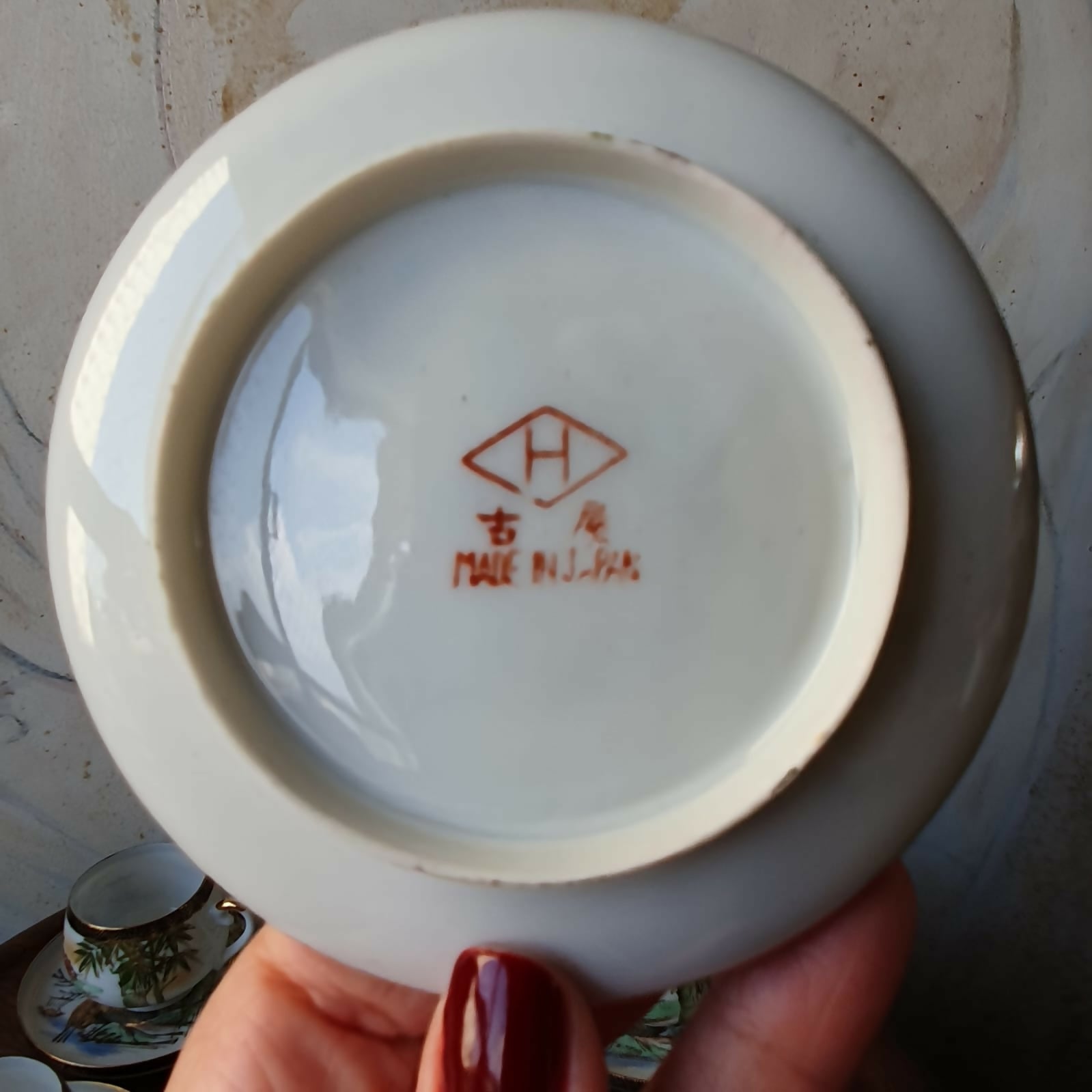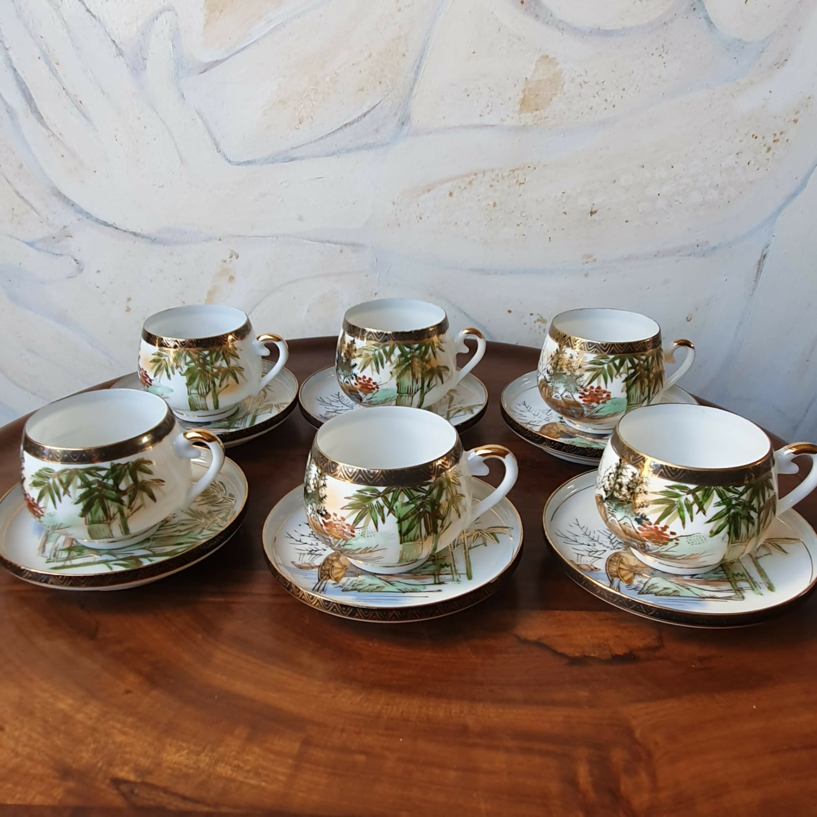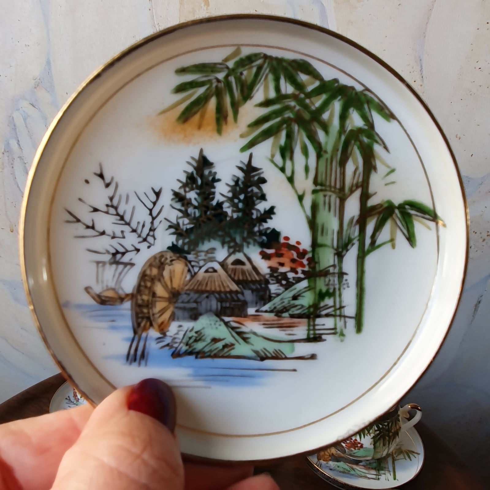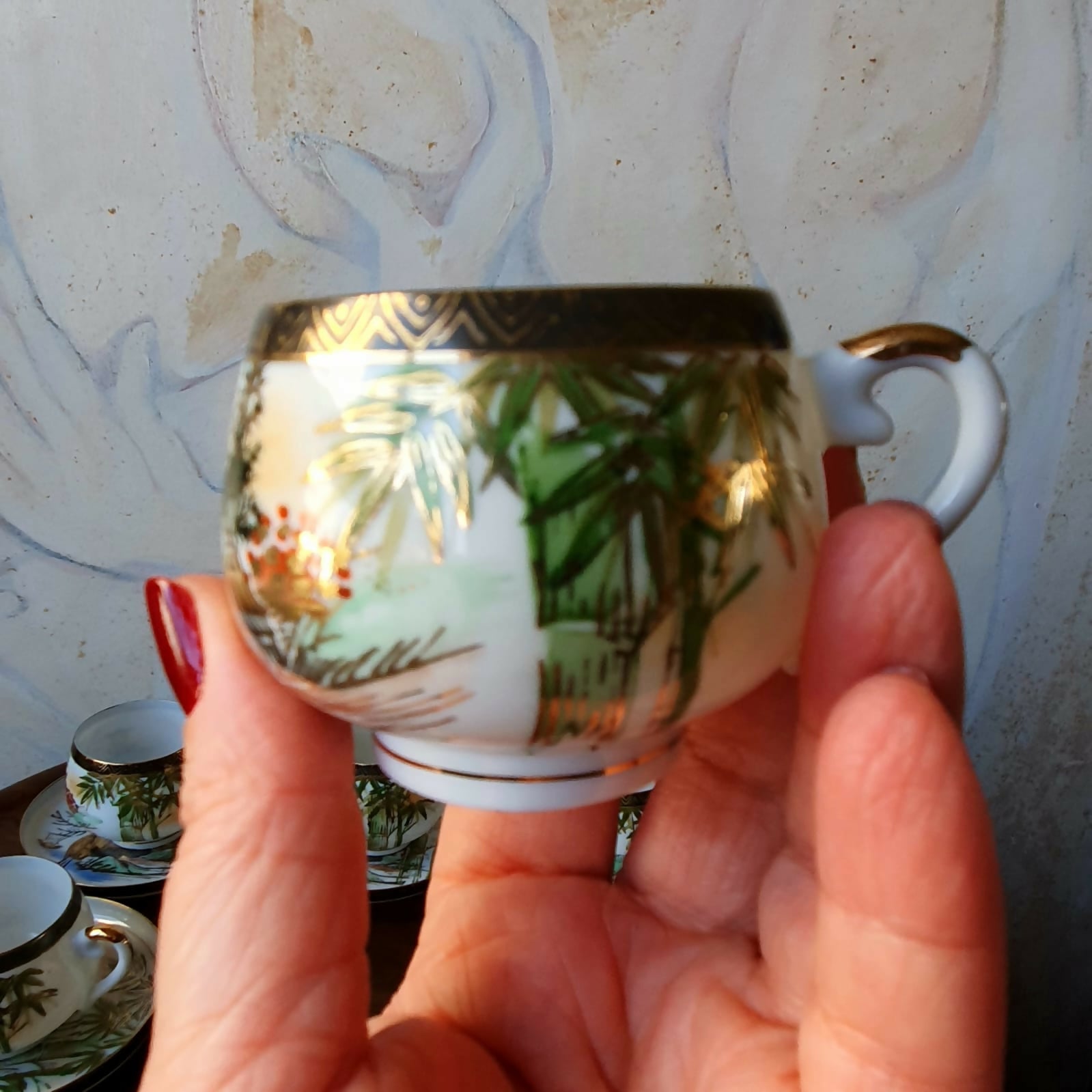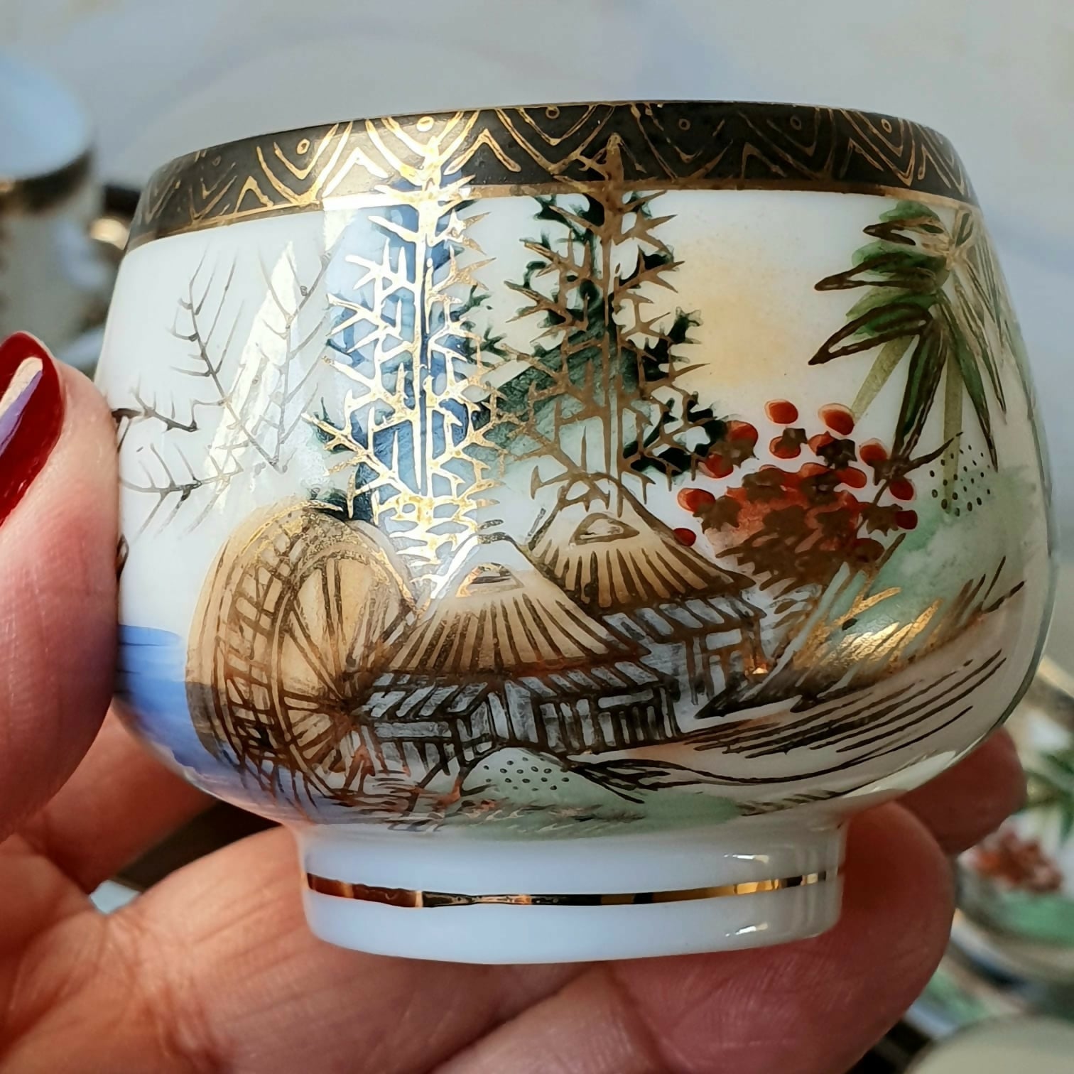 Toda pintada à mão, com profusão de douração, além de incríveis imagens de gueixas no fundo da xícara.