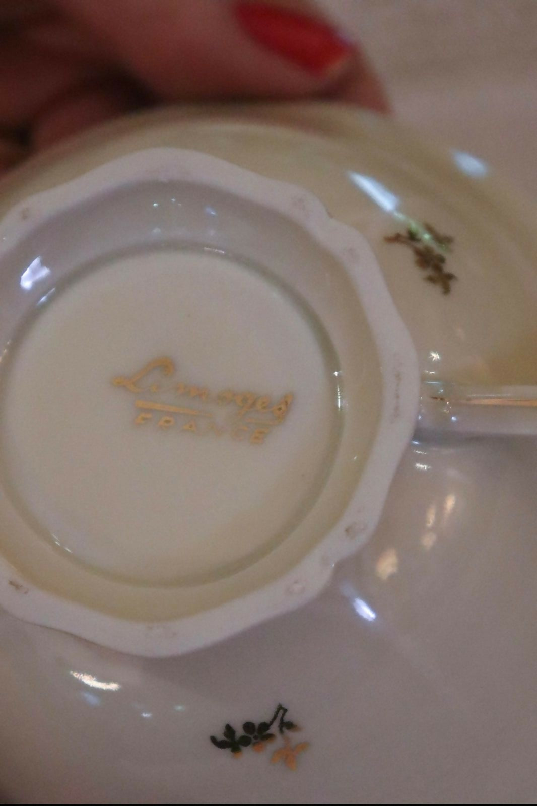 Porcelana Francesa Limoges — c. 1940–1960 Uma peça de elegância atemporal, com decoração floral dourada e formas neorrococó que definem a tradição francesa de Limoges. Um conjunto completo, delicado e precioso — perfeito para colecionadores que valorizam história, arte e mesa posta clássica. 🍵