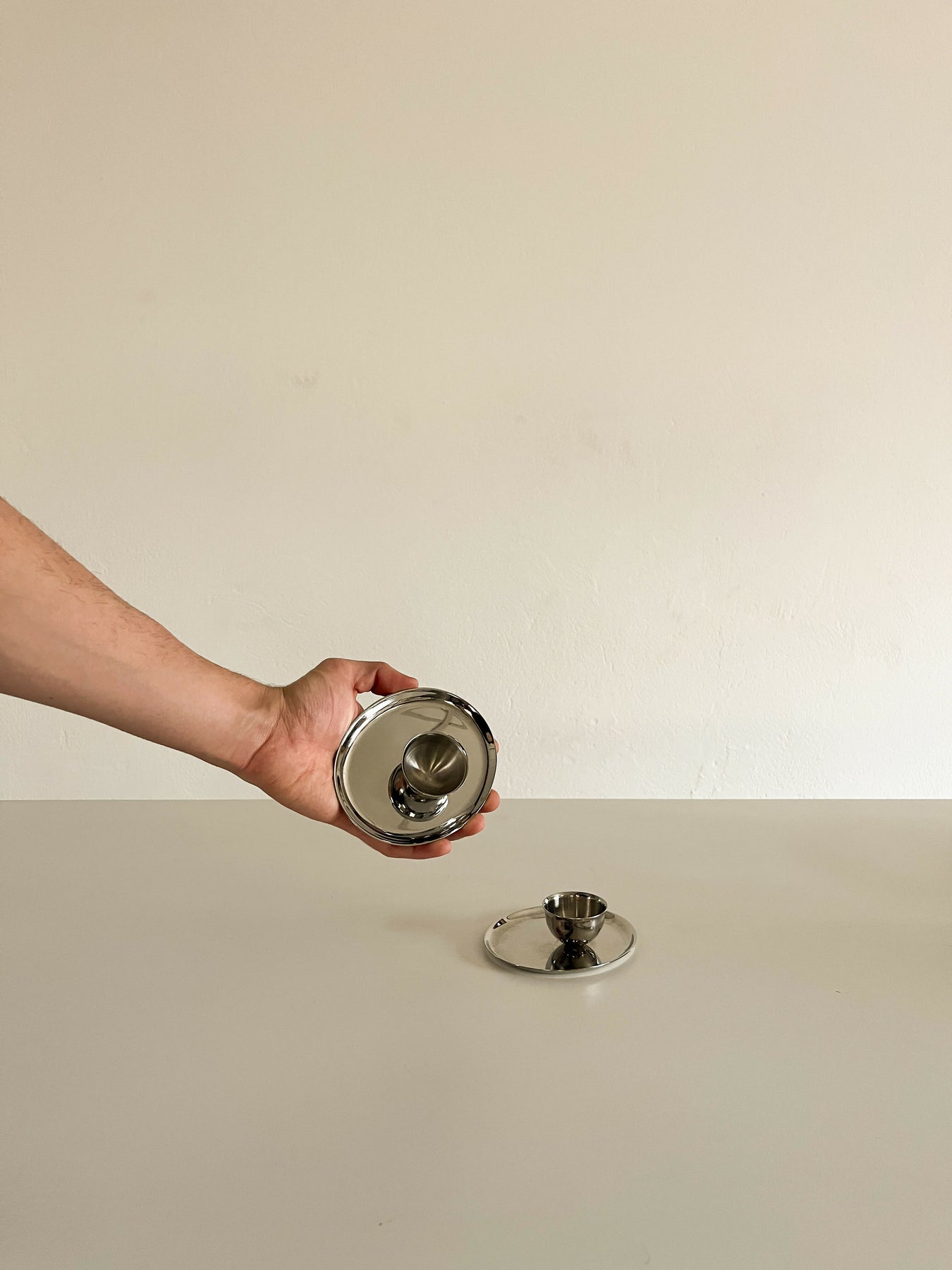Peça em aço inoxidável alemão vintage, com design minimalista e acabamento polido.