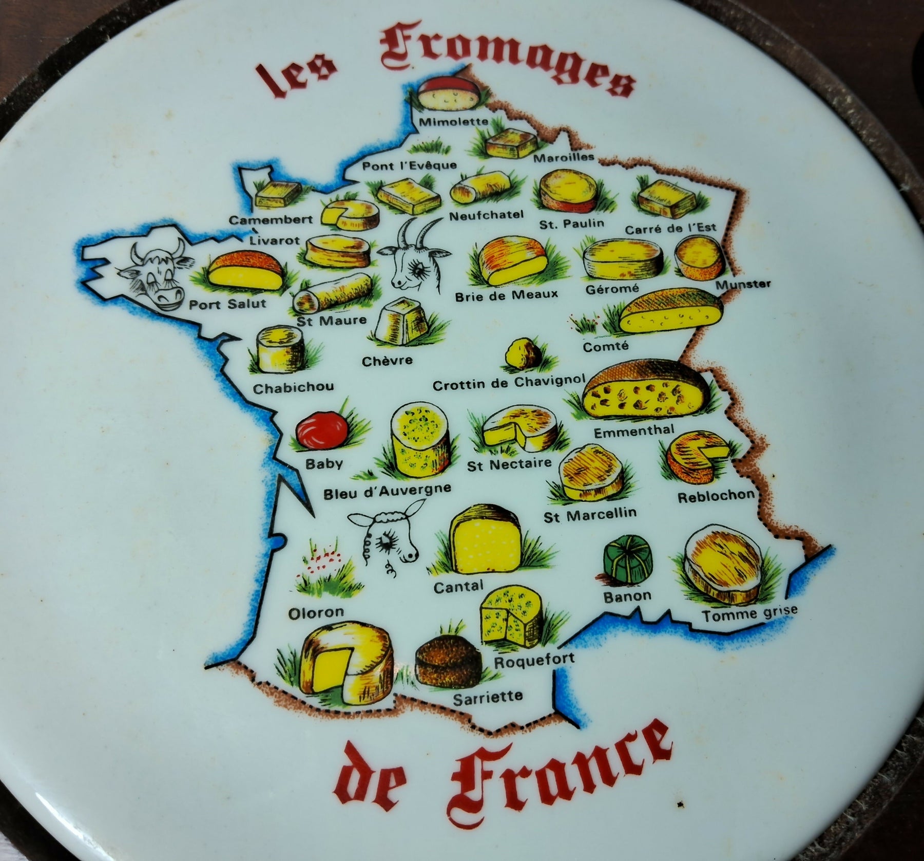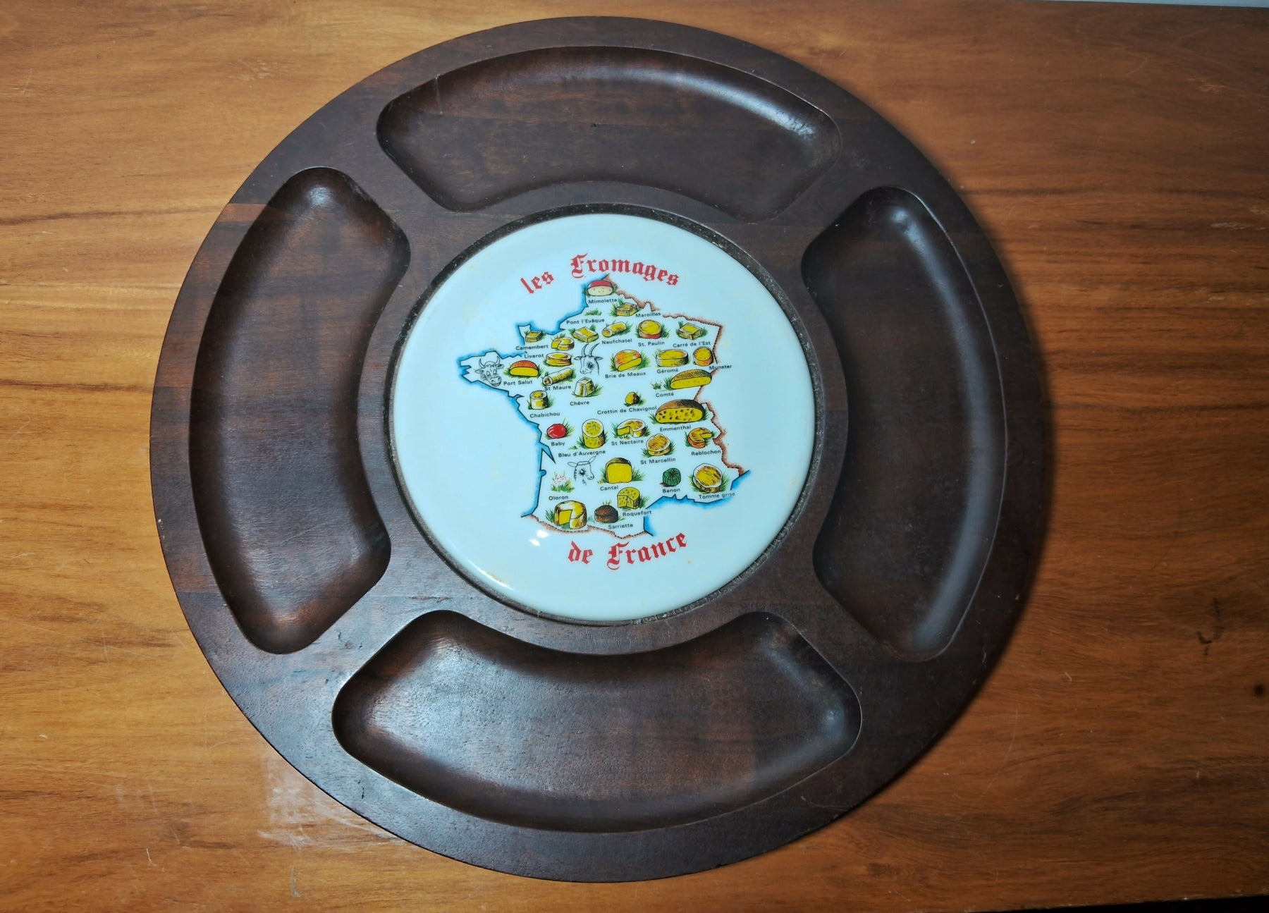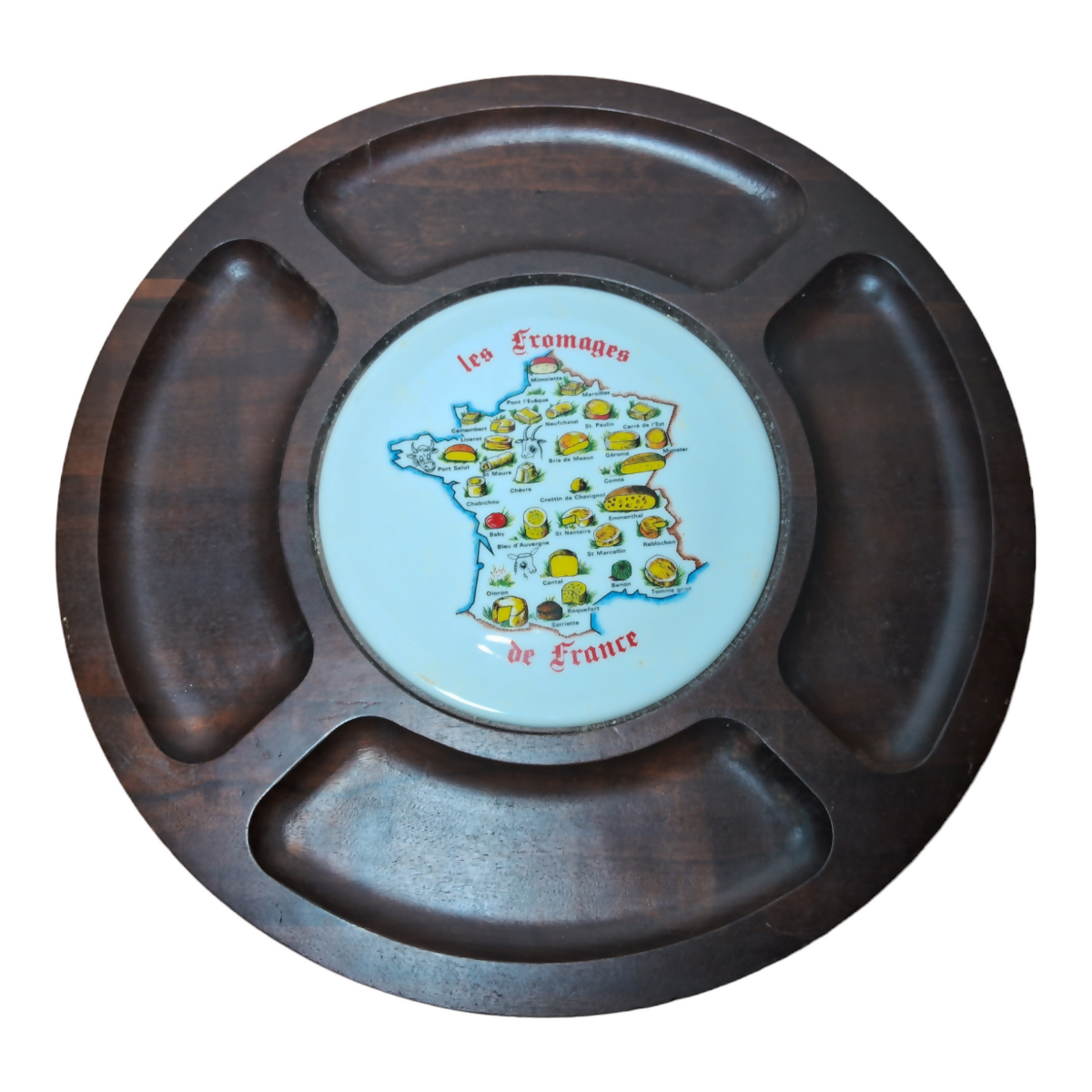 TROPIC-ART  autêntica peça dos 50-70. Em ótimo estado. 4 cavidade para pães, pastas e petiscos e azulejo para corte de queijo com decoração de mapa de regiões de produção de queijo na França. Diâmetro 35 cm