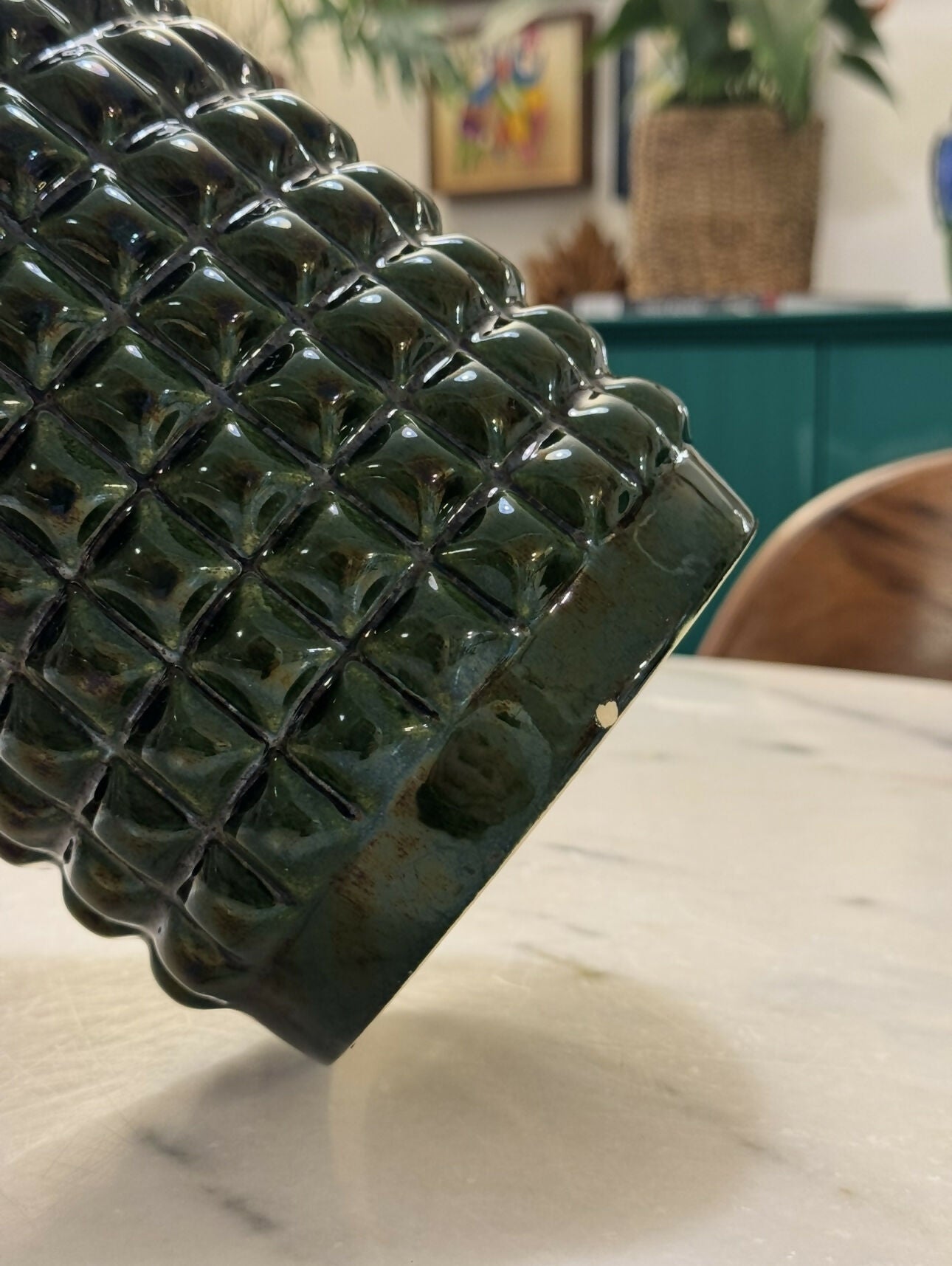 Imponente vaso floreira em cerâmica vitrificada na cor verde, com gomos quadriculados em alto relevo o que confere um charme especial, bem como possui destonalidades no tom em alguns pontos, uma peça característica da década de 70. Possui um pequeno bicado na base sem comprometer a estética da peça.
