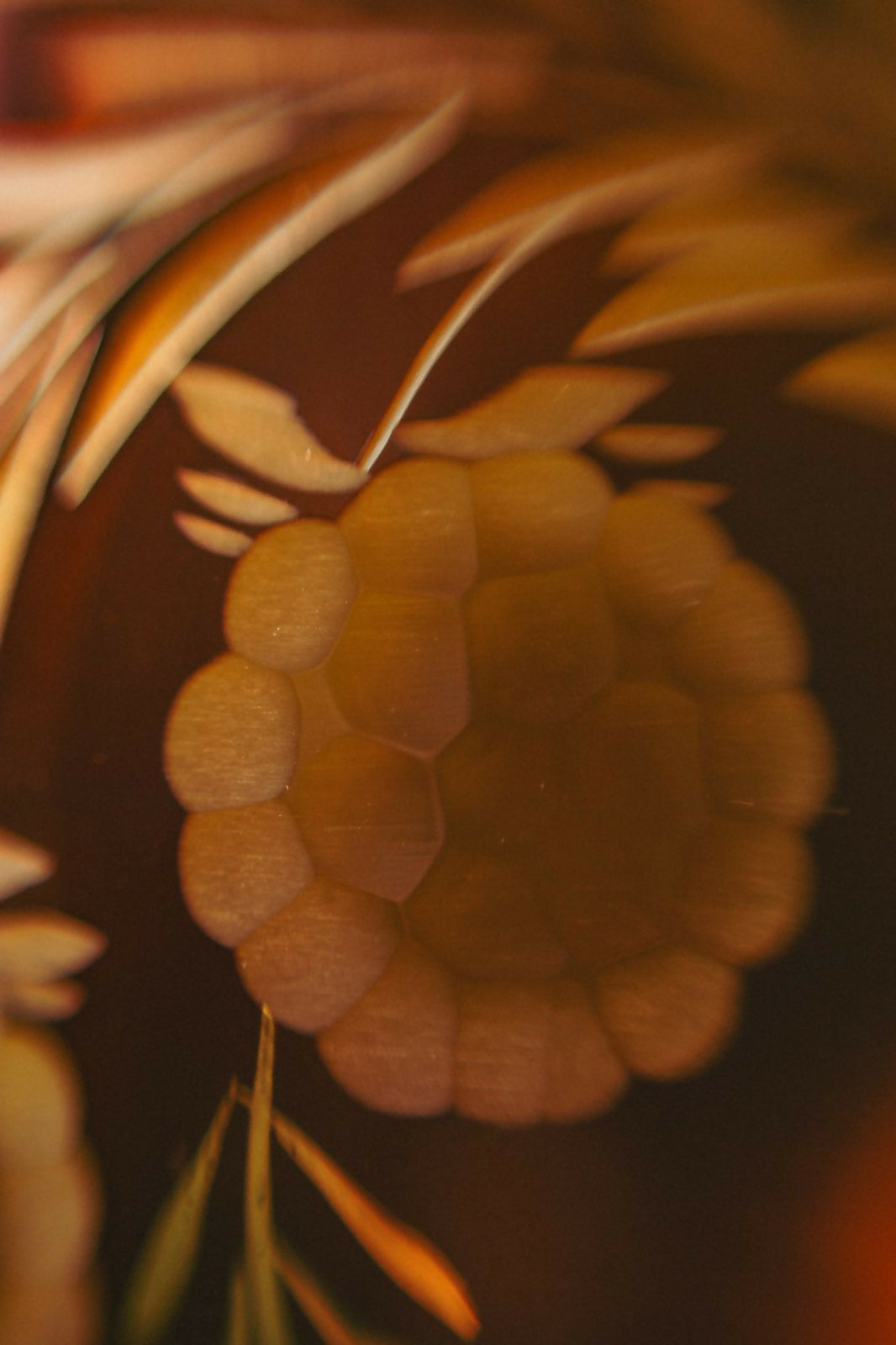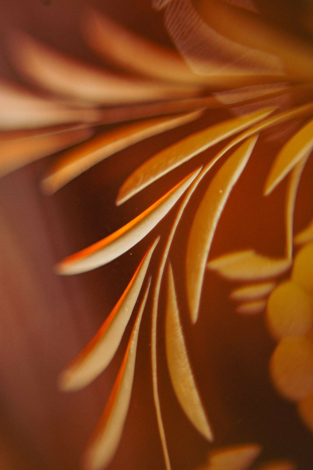 É impossível passar por este vaso sem admira-lo! O cristal em vermelho rubi, a delicadeza da flora lapidada e cada traço feito à mão. Uma peça que parece guardar luz em seu interior.
