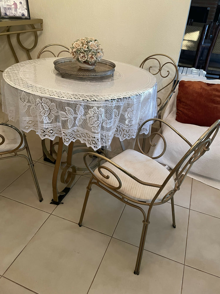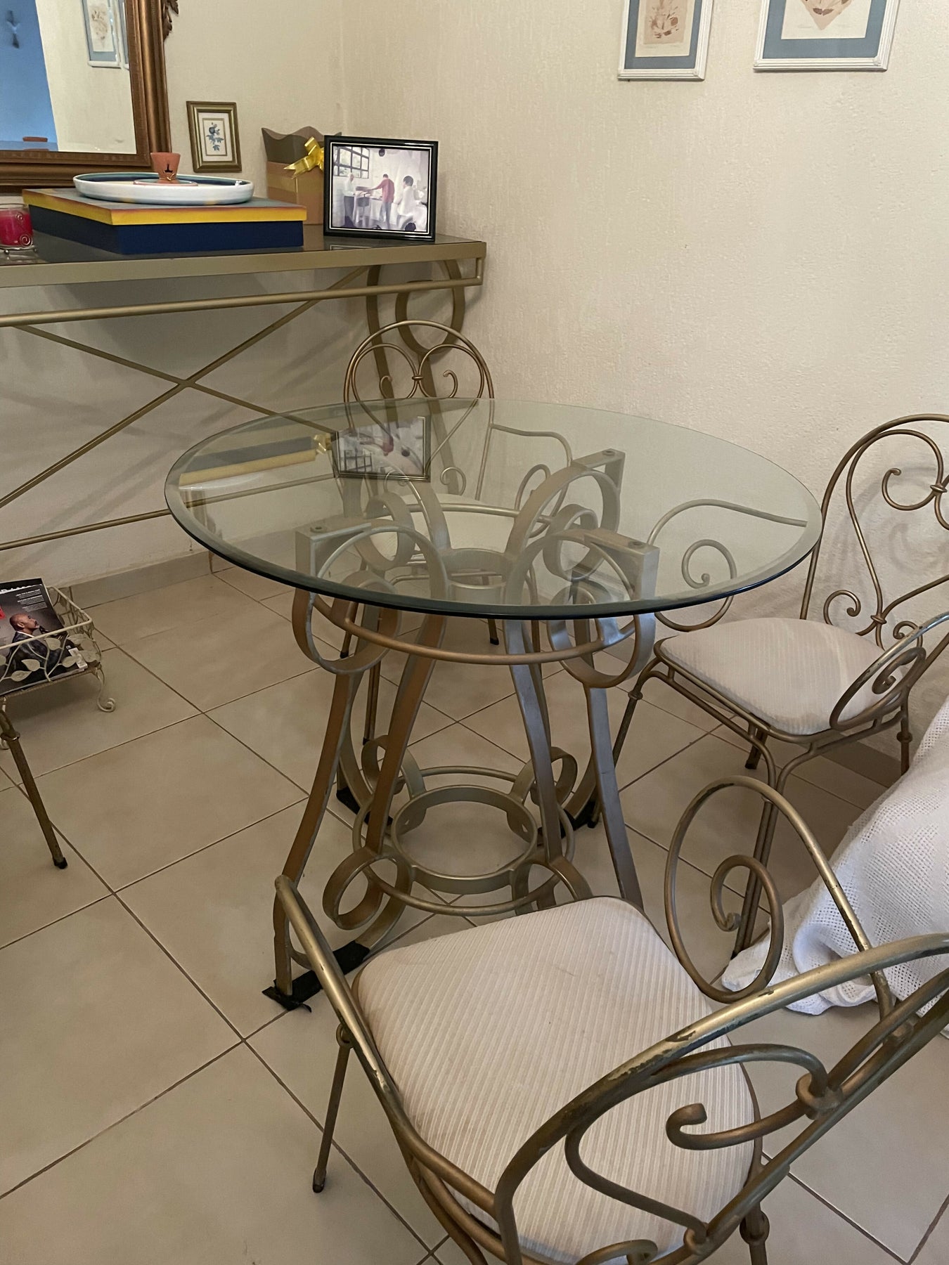 Lindo conjunto de mesa com estrutura de ferro com tampo de vidro e quatro cadeiras .