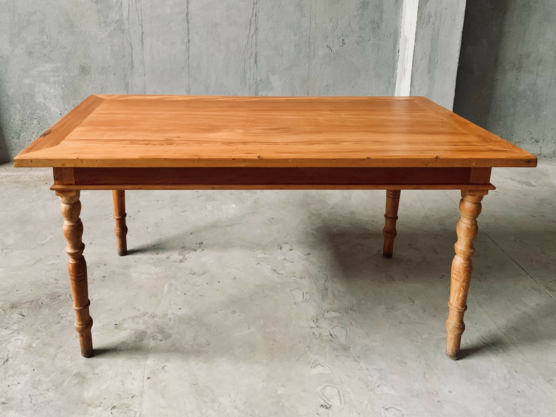Mesa feita em madeira maciça, com acabamento natural que valoriza os veios e tons do material. Possui pés torneados. Peça artesanal.