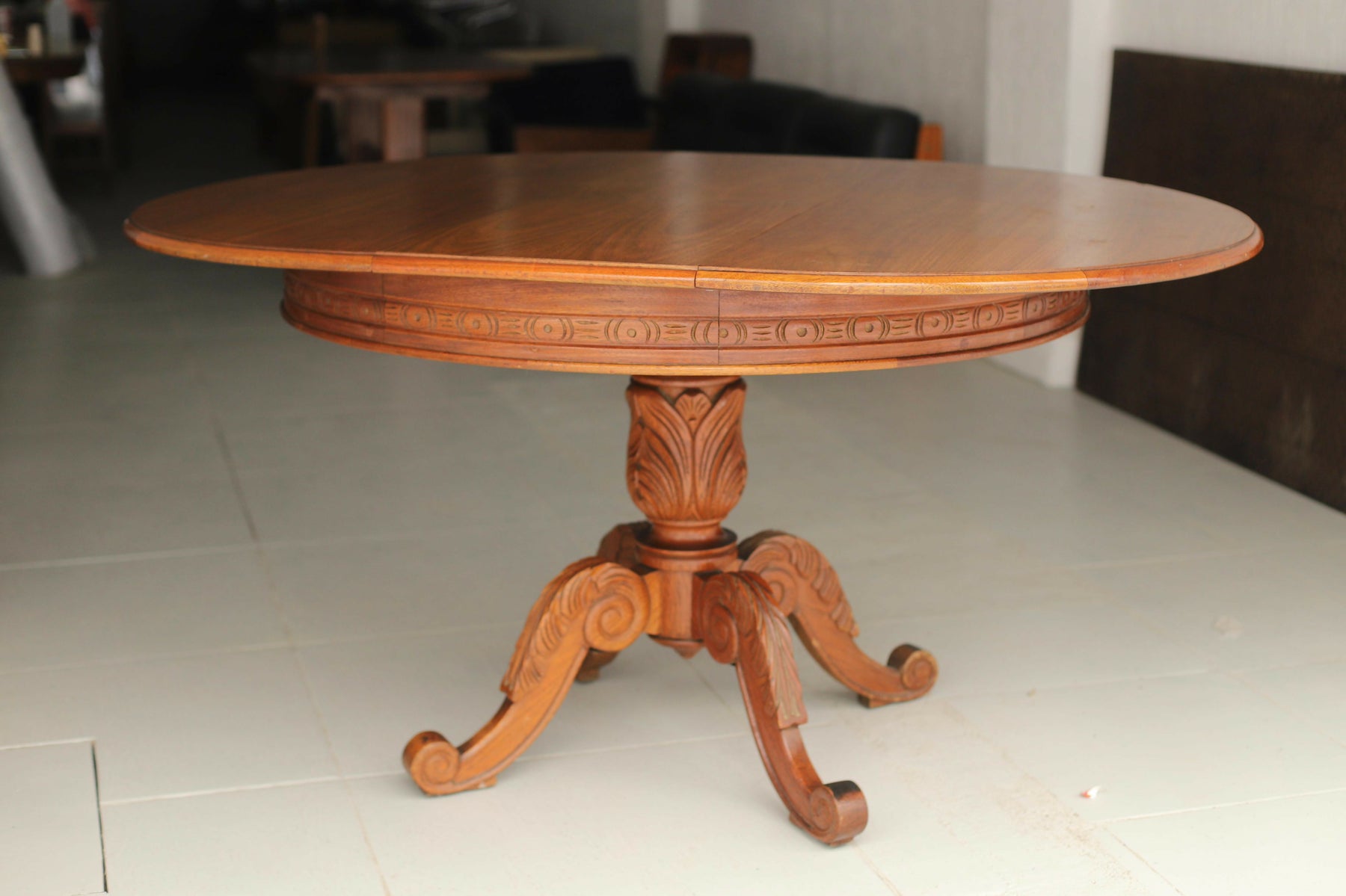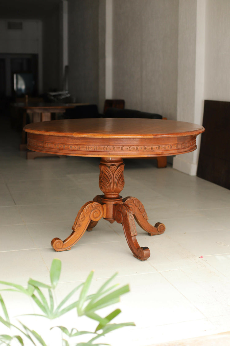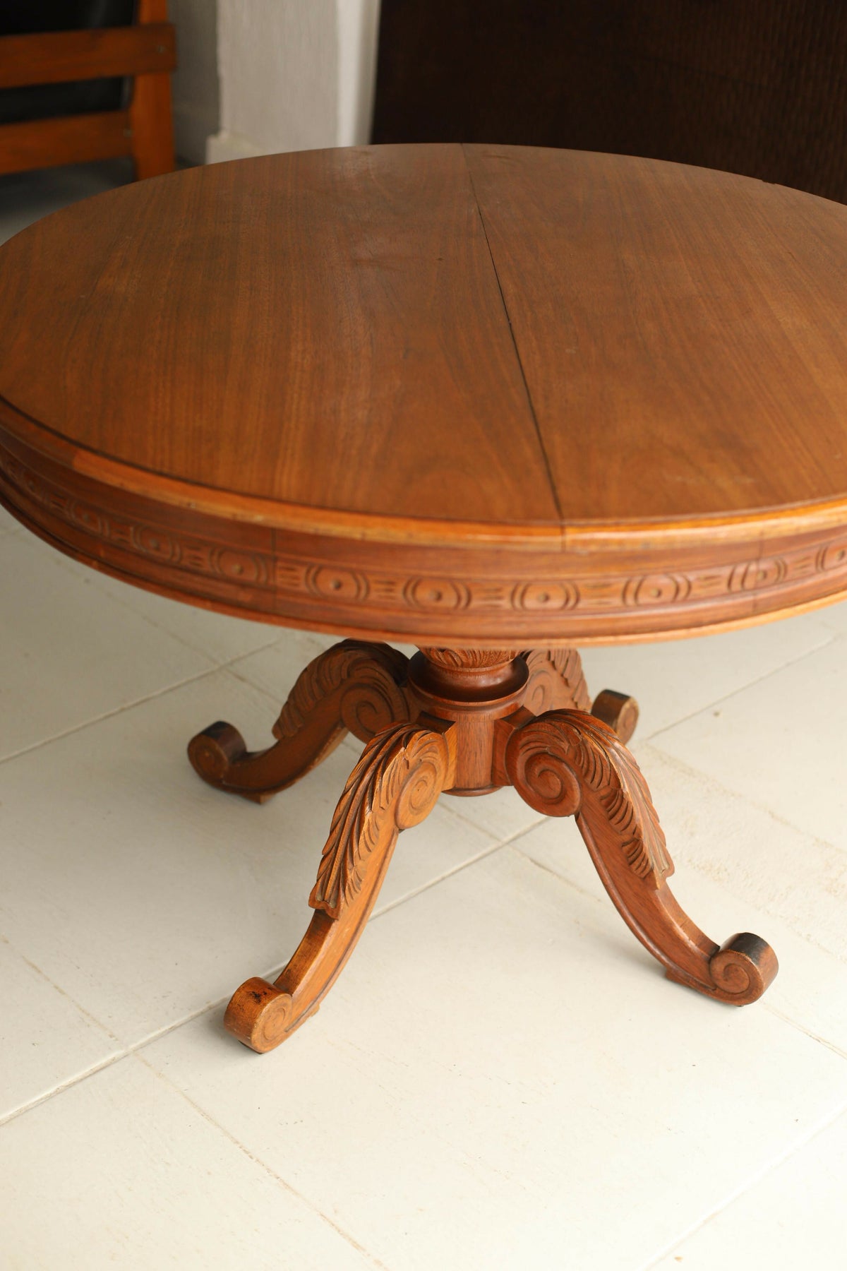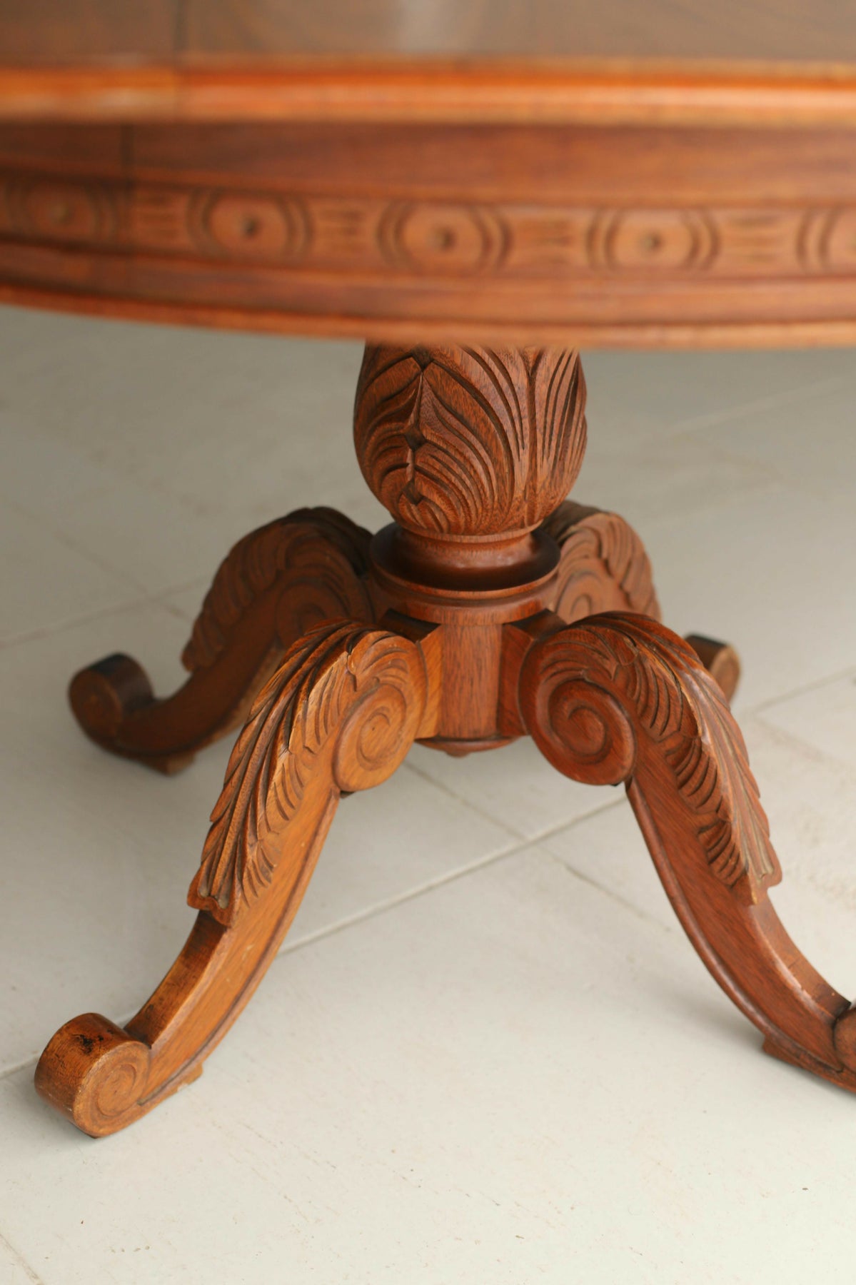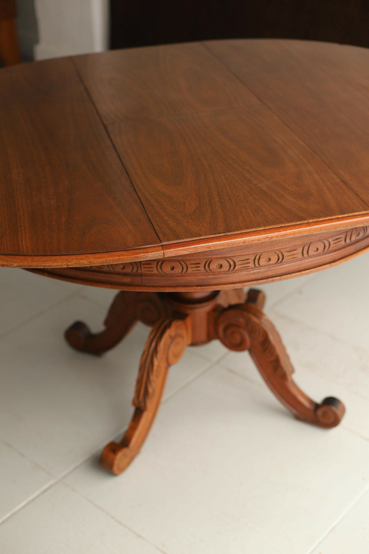 Mesa redonda extensível em cerejeira maciça e detalhes entalhados a mão. Ótimo estado de conservação.